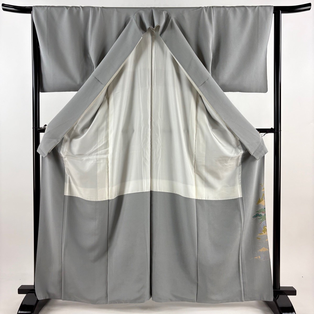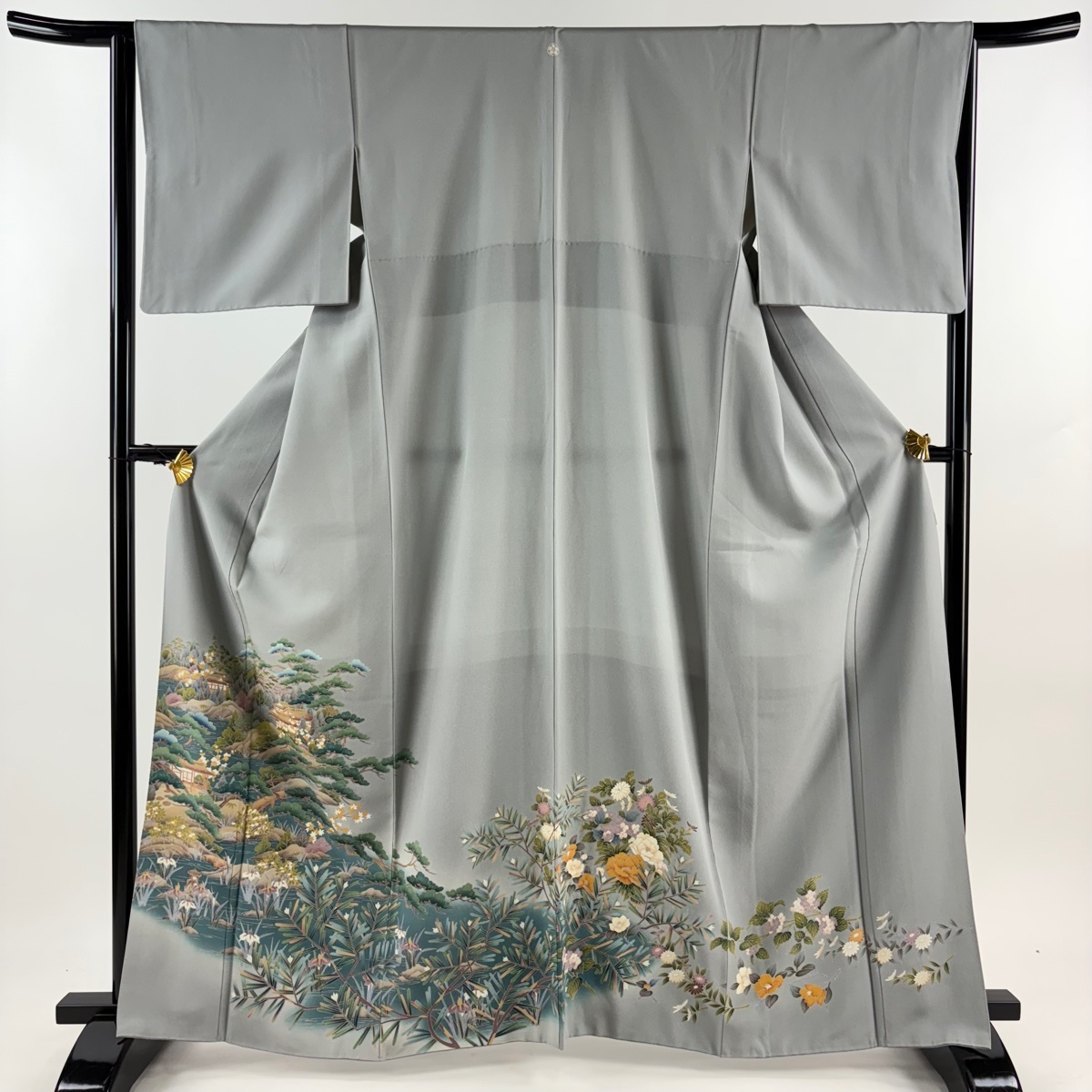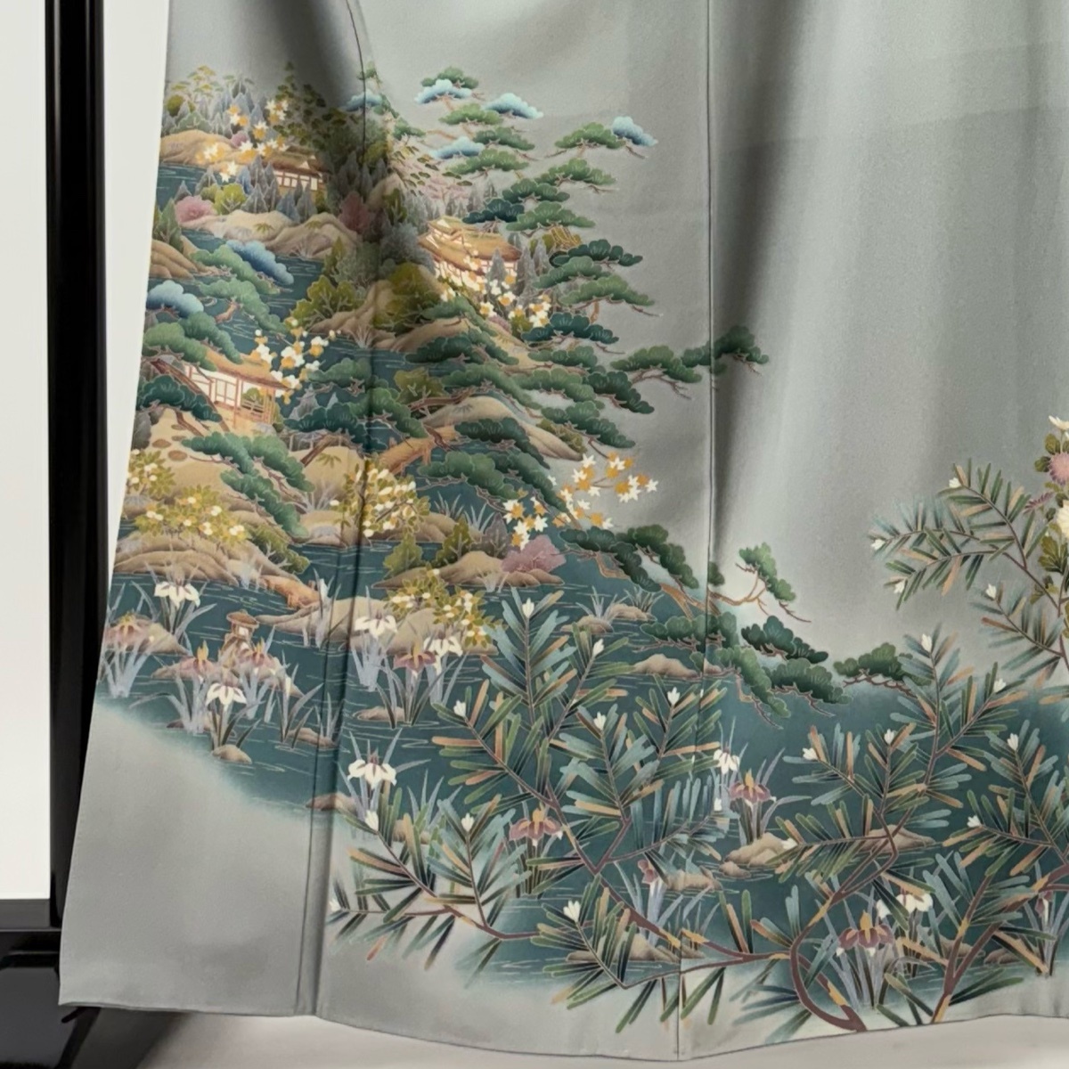 色留袖 秀品 建物 松 ぼかし 灰緑 袷 身丈164 裄丈64 M 正絹 【中古】 |
