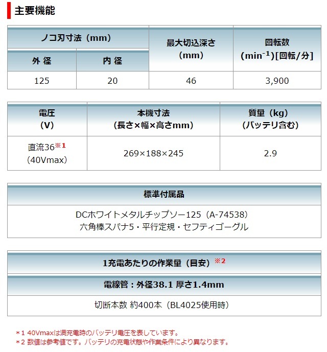 ・1充電当たりの作業量(目安) : 電線管:外径38.1 厚さ1.4mm 切断本数約400本(BL4025使用時)