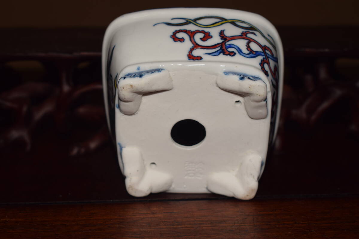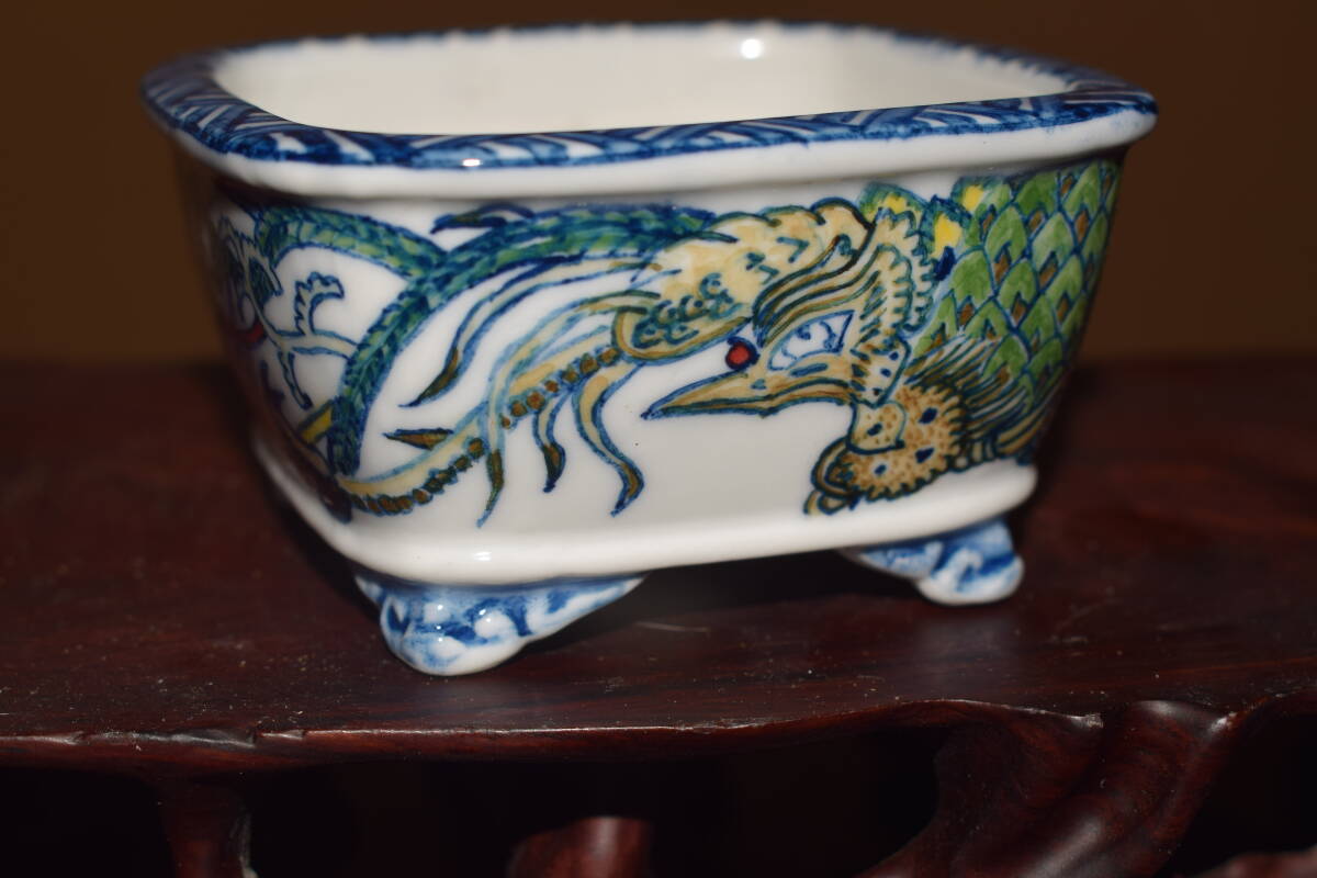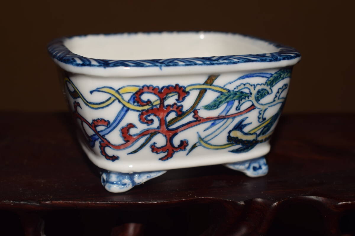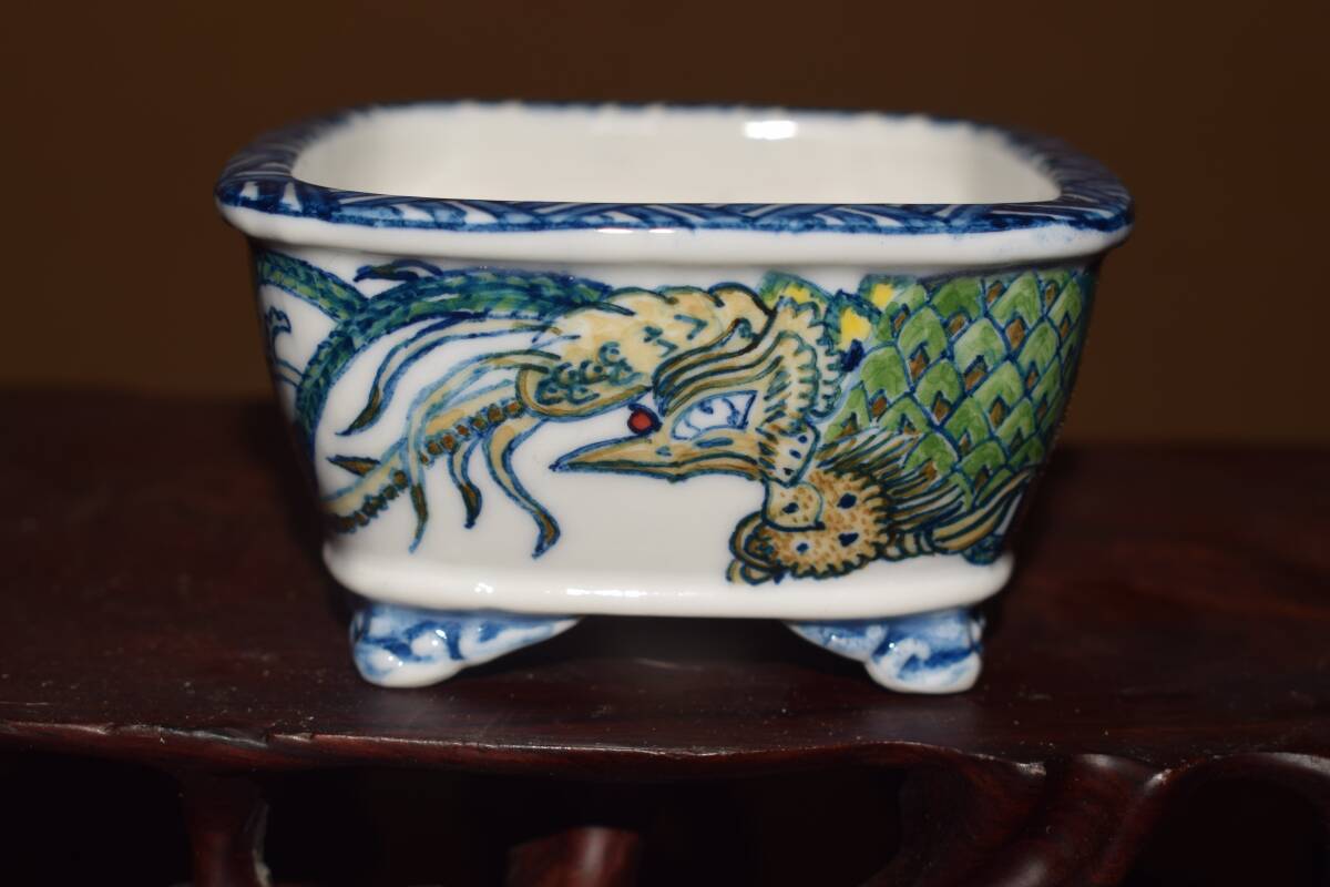 サイズ8,5x8,5x4,5cm 人気絵鉢作家<ゆうき祥石・色絵鳳凰図・発色抜群・繊細画・実用性抜群・小品サイズ>外縁正方鉢のご紹介です・・・・・色絵鳳凰図が繊細に描き込まれ、実用にも優れた素晴らしい逸品です・この商品はゆうき祥石になります。初代落款は祥石のみ。二代目落款はゆうき祥石。三代目落款はゆうき祥石落款の下に、□の中に~ が入っています・ 目立つ傷はありません・・・・・ 状態を良くご確認の上、ご入札宜しくお願い致します。 その他、大変古い物ですので縁・足等にホツ・スジ・カケ等がある場合がございます。画像を良くご確認の上、御入札宜しくお願い致します。完品をお求めの方は入札をお控えお願い致します。*注意事項* オークション終了後48時間以内に必ずご連絡をお願いします。ご連絡がない時は、ご購入意思がないと判断し、落札者さま都合のキャンセルとさせて頂きます。再三のご連絡を差し上げても、ご連絡がない場合は、時点繰り上げとさせて頂きます。マイナス評価の多い方や新規の方を削除する場合がありますので、ご了承下さい。また、入札価格が低価格の場合は取消終了とさせて頂く場合がございますので、ご了承願います。古い物等ございますので小さな傷等は、見落とす場合がございますので、写真を良くご覧になり納得の上ご入札して下さい。また、完品をお求めの方は入札をお控えお願い致します。キズ・破損等のご連絡は商品到着5日以内にご連絡ください。それ以降は対応致しかねますので到着後、商品を必ずご確認ください。輸送中の事故(鉢が割れる、枝が折れる等)につきましては商品到着時に確認し取引ナビまたは、お電話にてご連絡下さい。 基本土日の発送は行っておりません。ご了承ください。