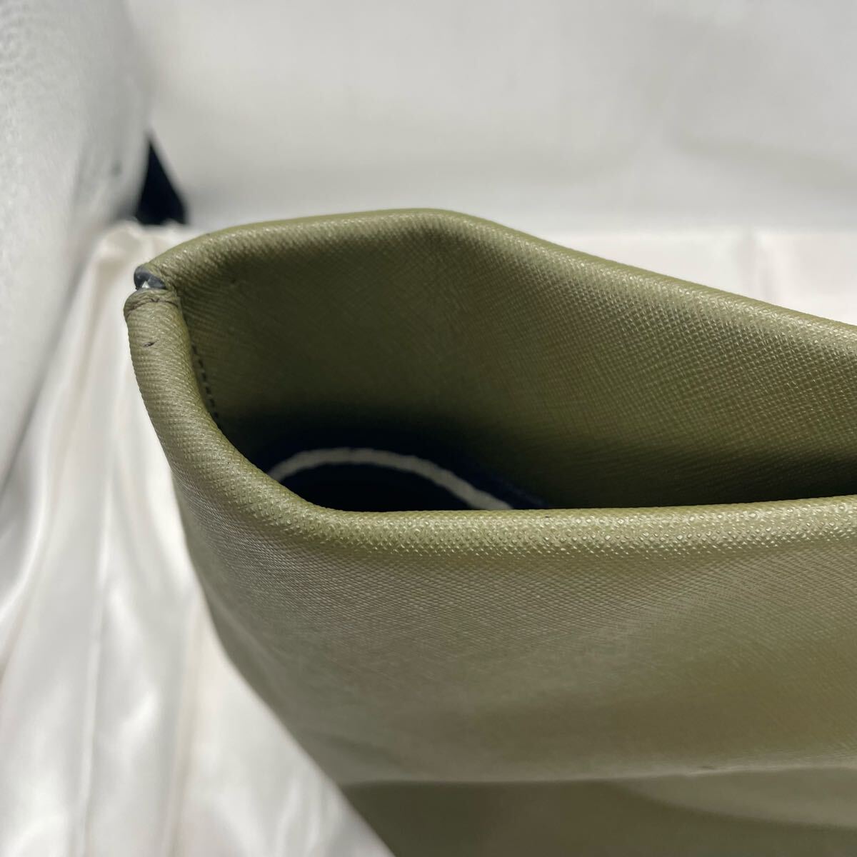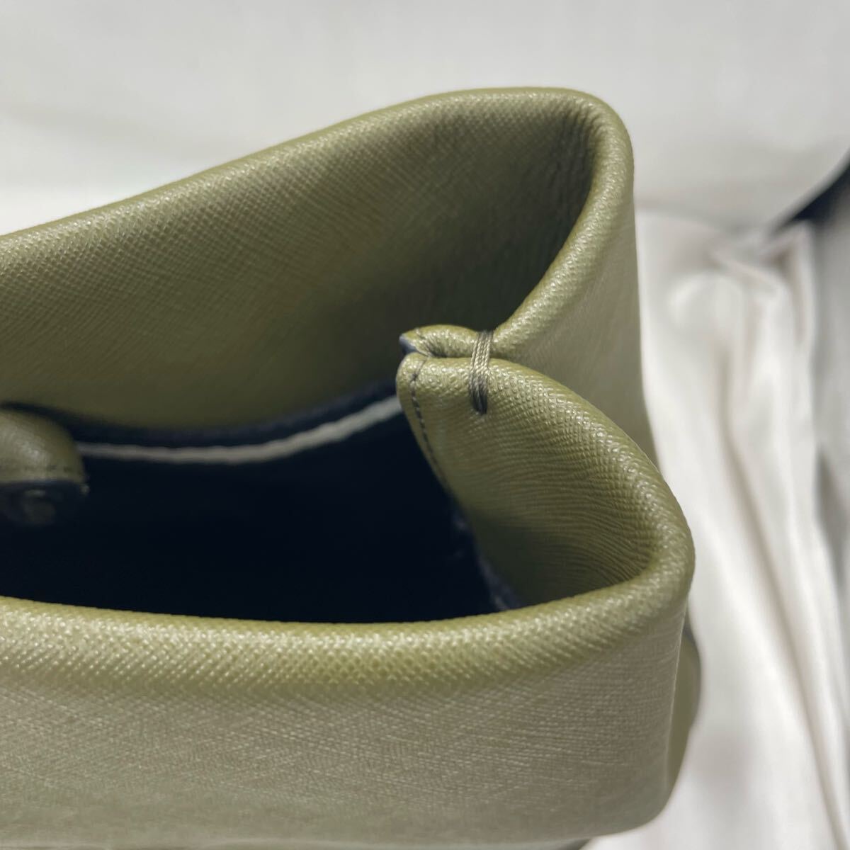 上品なカーキグリーンのサフィアーノ調レザー素材で、フロントにはブランドロゴと所在地を刻印。