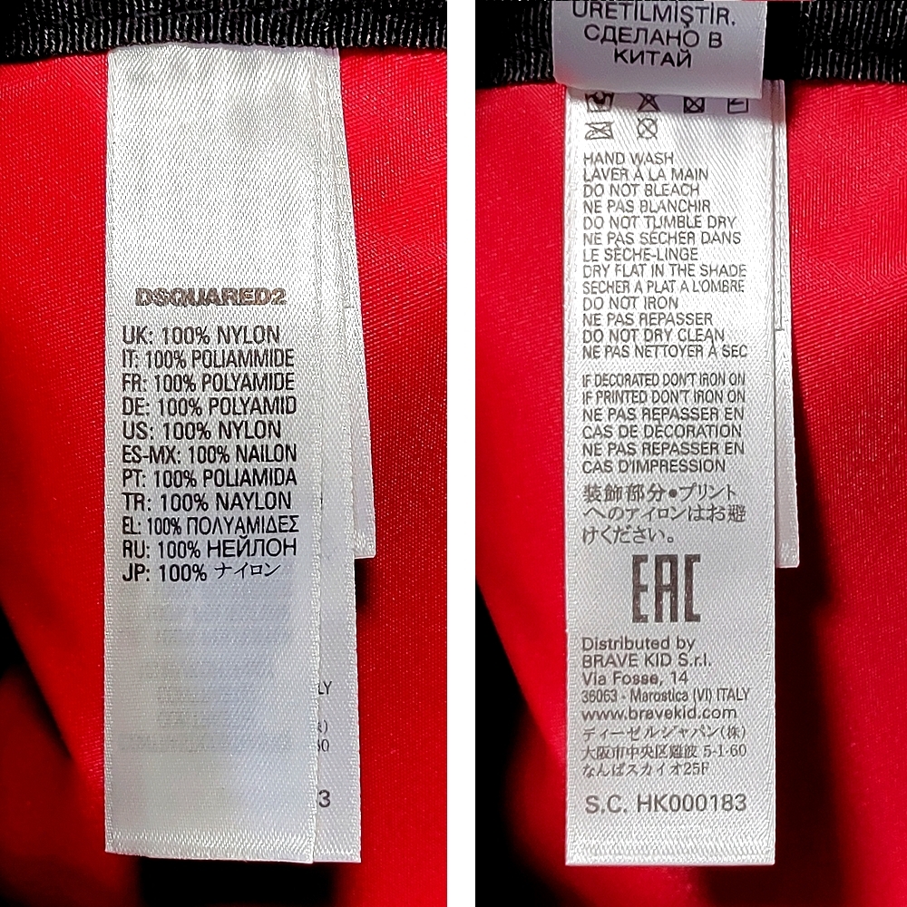 ナイロン 100%(本体) ポリエステル 100%(ベルト部) ナイロン 100%(刺繍糸) 合成皮革 (タグ部) |