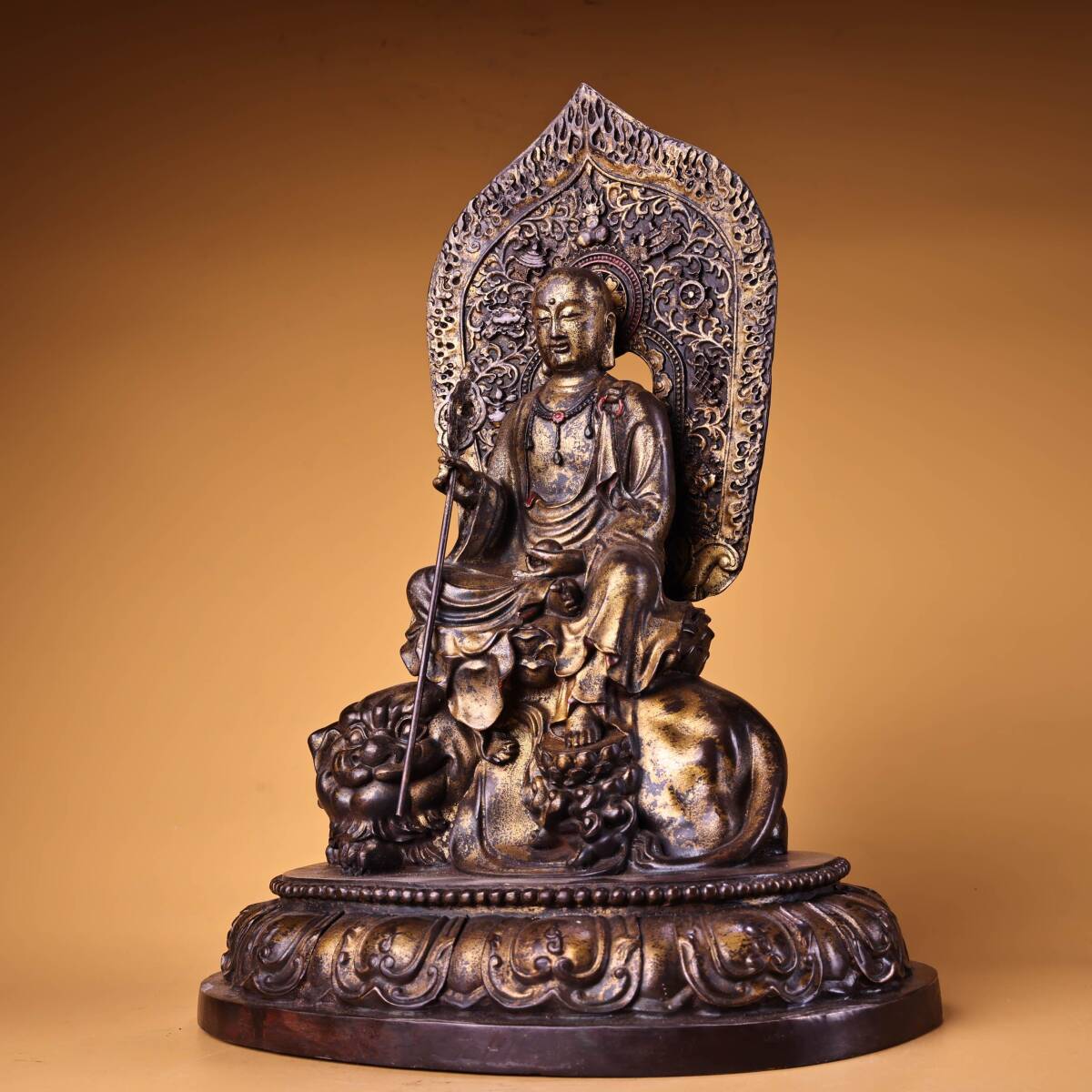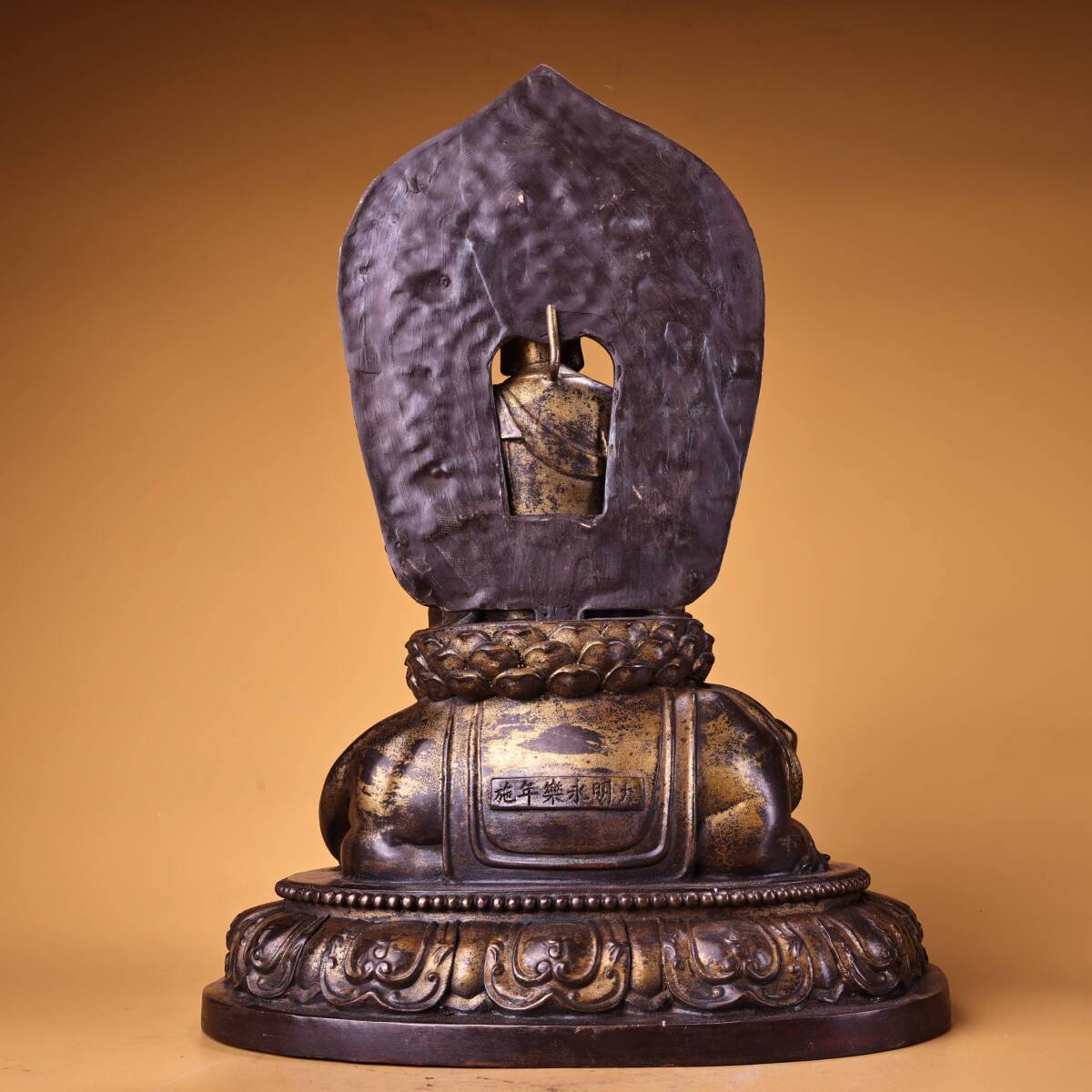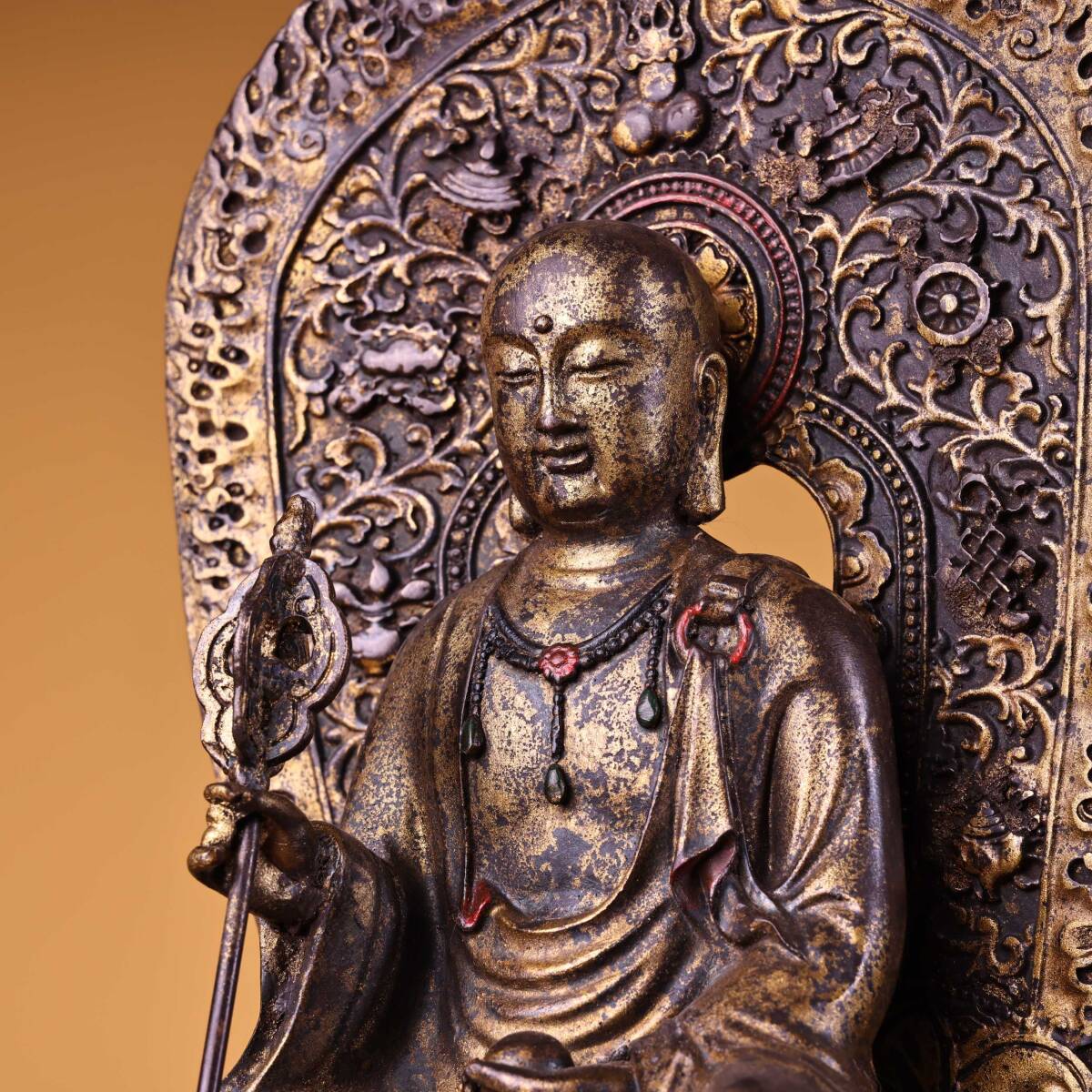*珍品旧蔵* 大明 永樂年製 純銅 全銅 高浮彫鏨刻 泥金地藏王菩薩 仏像 奉納されていた 供養品 銅製 極細工 中国古玩 骨董品 古美味 H48