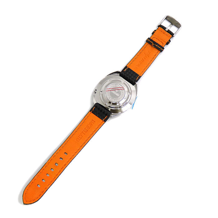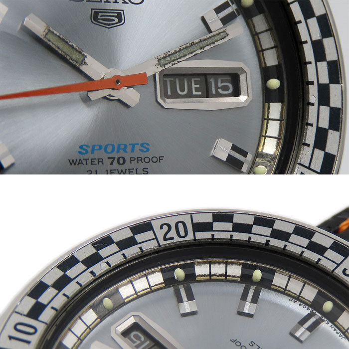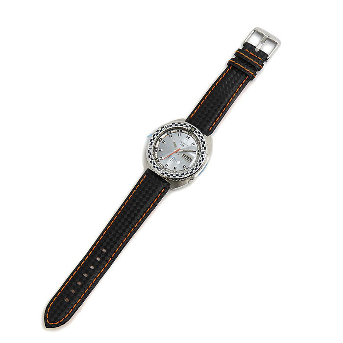 商品説明 | スポーティなチェッカーベゼルに光沢のあるシルバーダイヤルの個性的で印象的なモデルです。ベルトは社外品ですが、秒針のオレンジカラーと揃えられたオレンジのステッチや編み込まれたナイロンの格子柄がベゼルと良く合い、スポーティーな雰囲気がより一層感じられます。 1969年に発売されたヴィンテージ品、希少モデルです。シリアルは93****です。 |