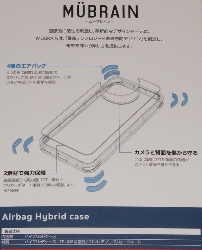 4つの角に配置した独自設計のエアーバッグが衝撃を吸収するMUBRAIN(ムーブレイン)シリーズのハイブリッドケースです。