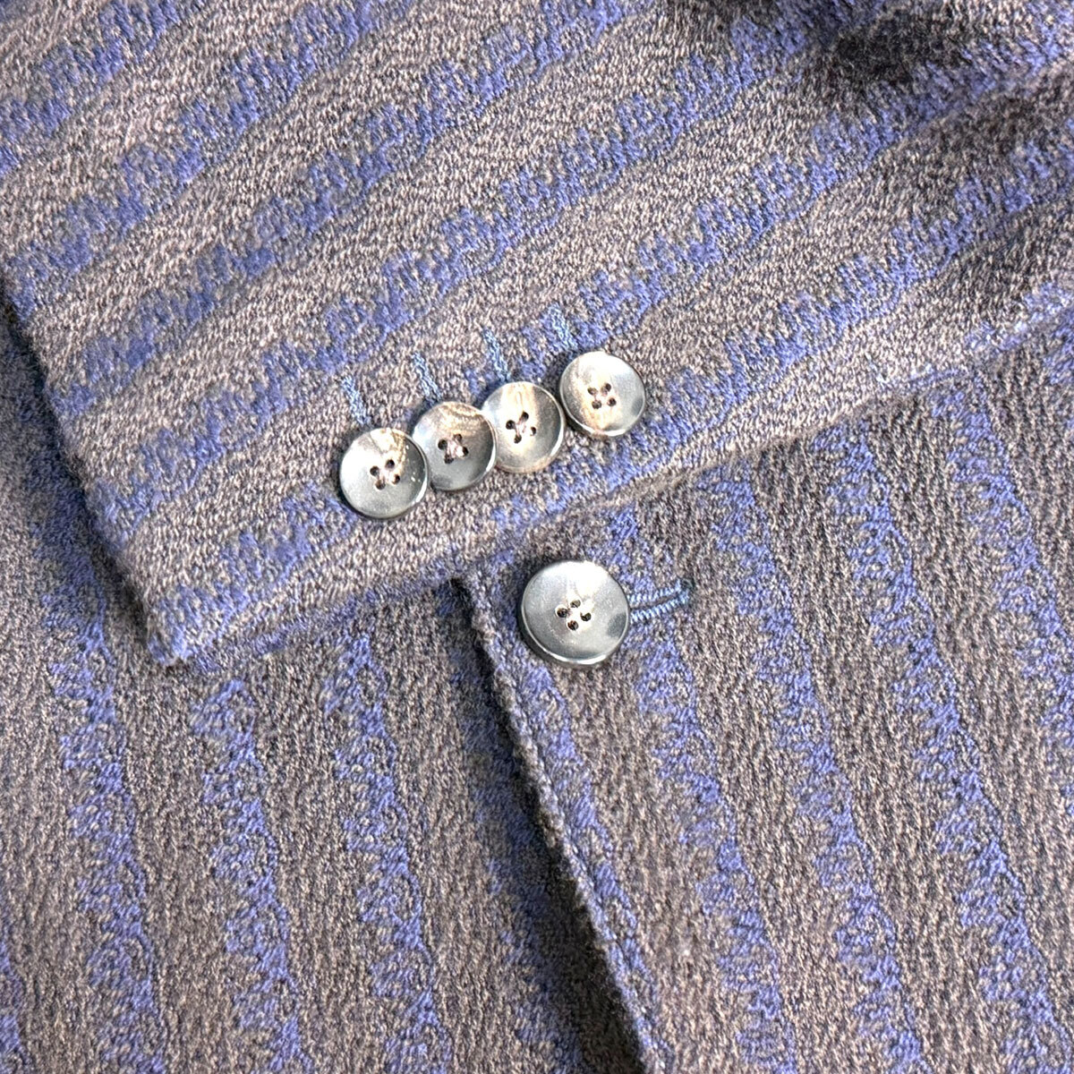 デザイン:フロント段返り3つボタン、背抜き裏地、サイドベンツ、袖開き見せ。