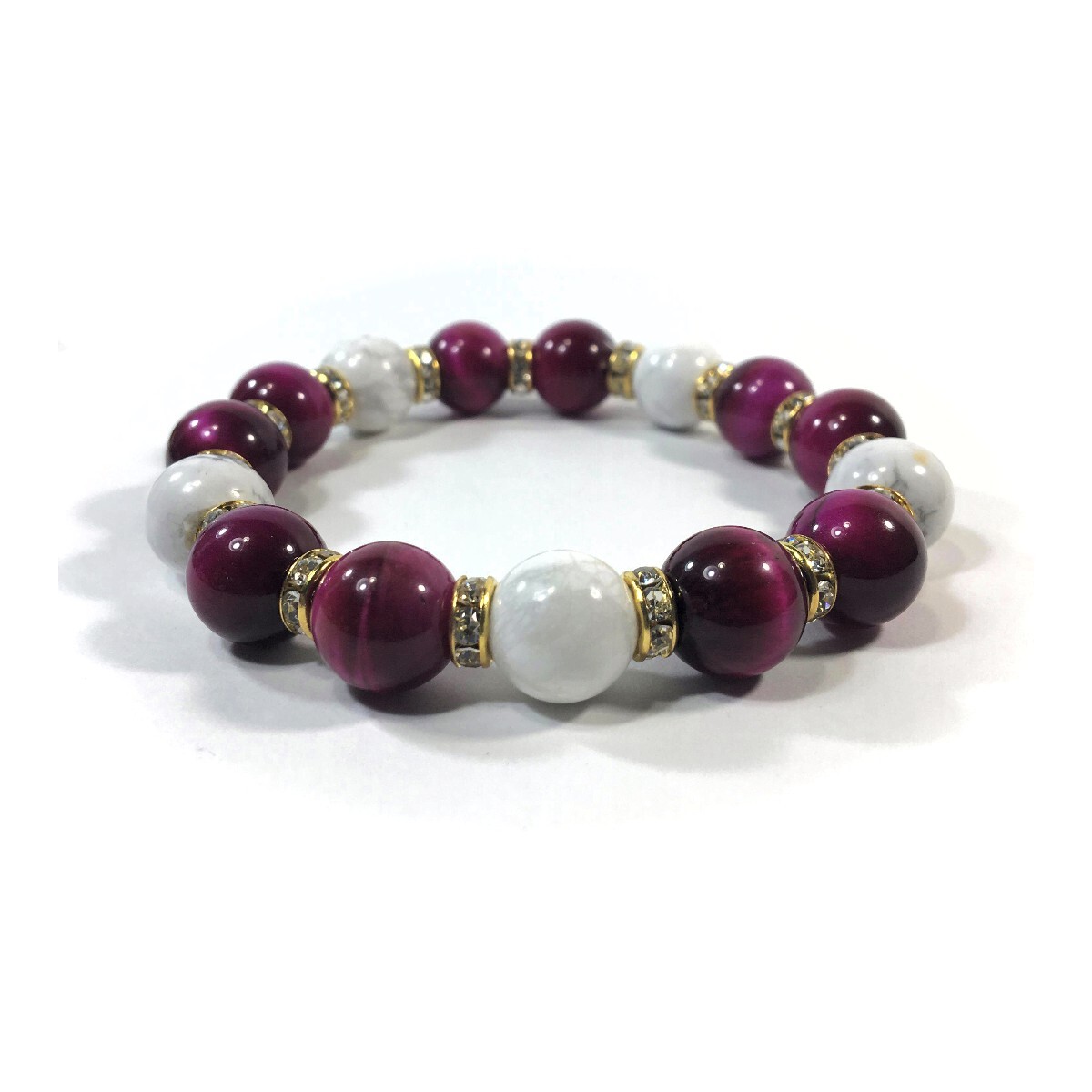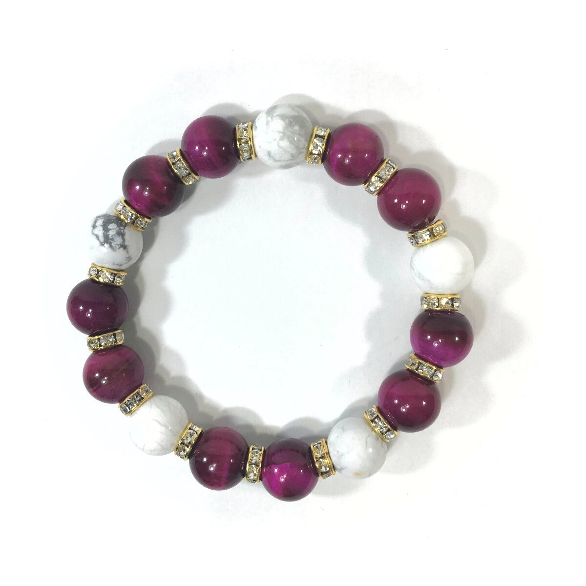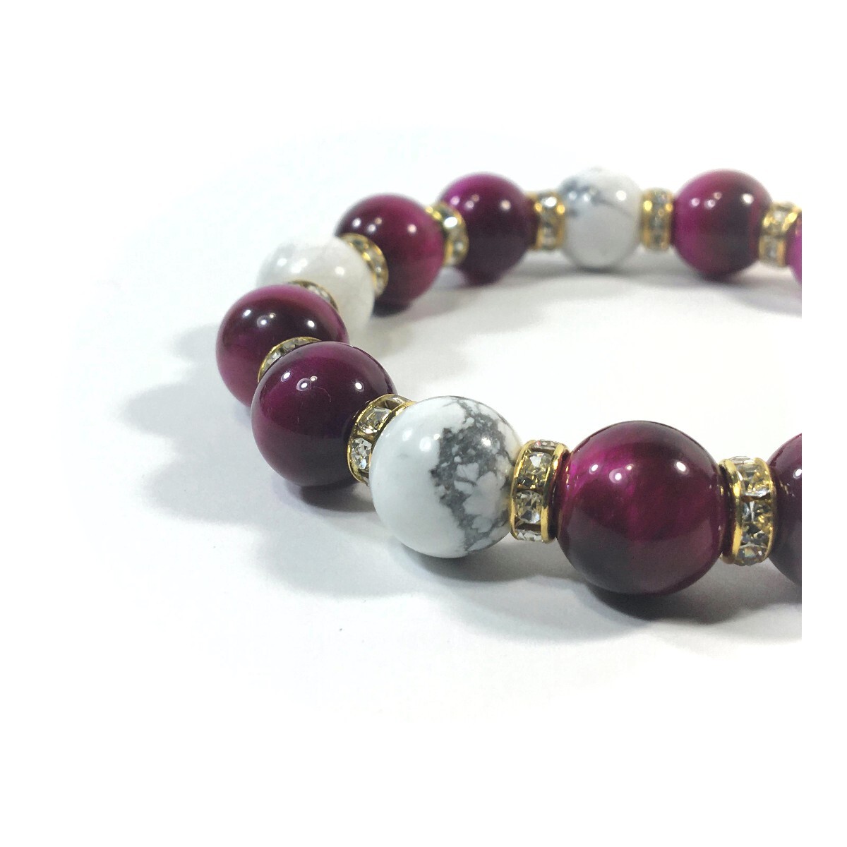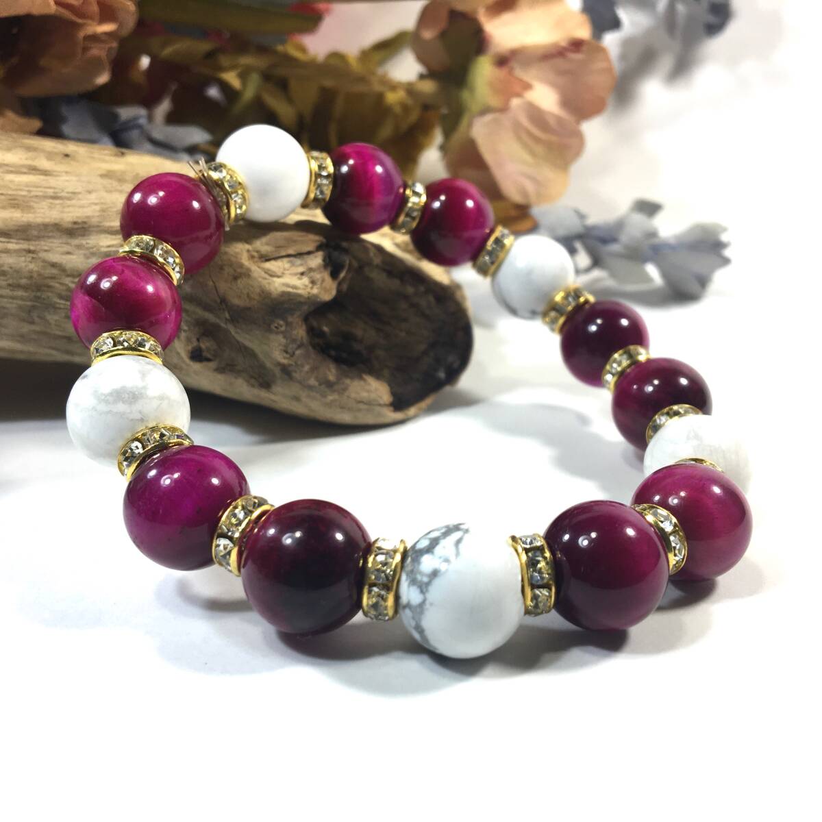 こちらは、ピンクタイガーアイとハウライトを組み合わせたパワーストーンブレスレットです。間にはロンデルを挟み高級感あるデザインに仕上げております。石大きさは12mm玉を使用して内径約18cmです。気になる方は是非この機会にどうぞ。