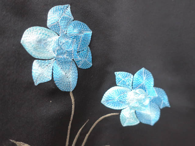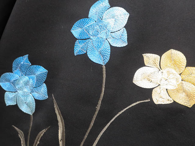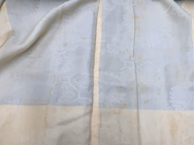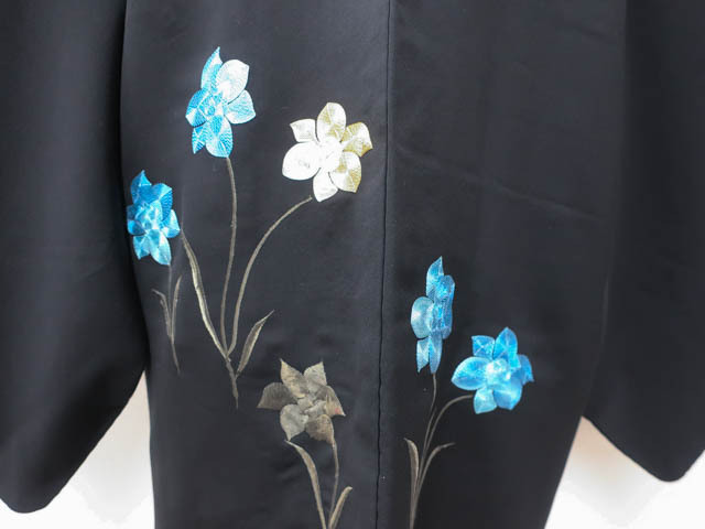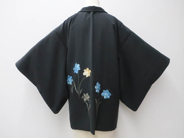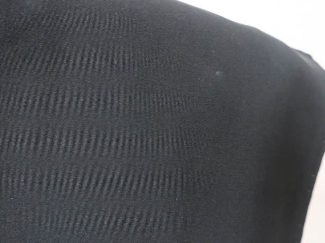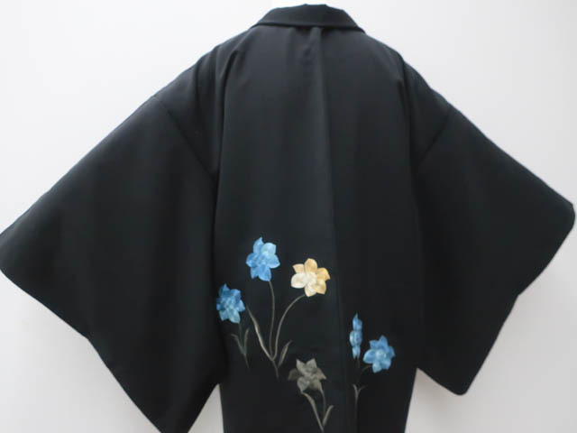リサイクル商品のため、右袖後ろや前身頃に薄汚れ、羽裏にシミがございますが着用可能なお品です。 地色は、黒色です。 1枚目の画像が近いお色かと思われます。 素材は正絹です。 |