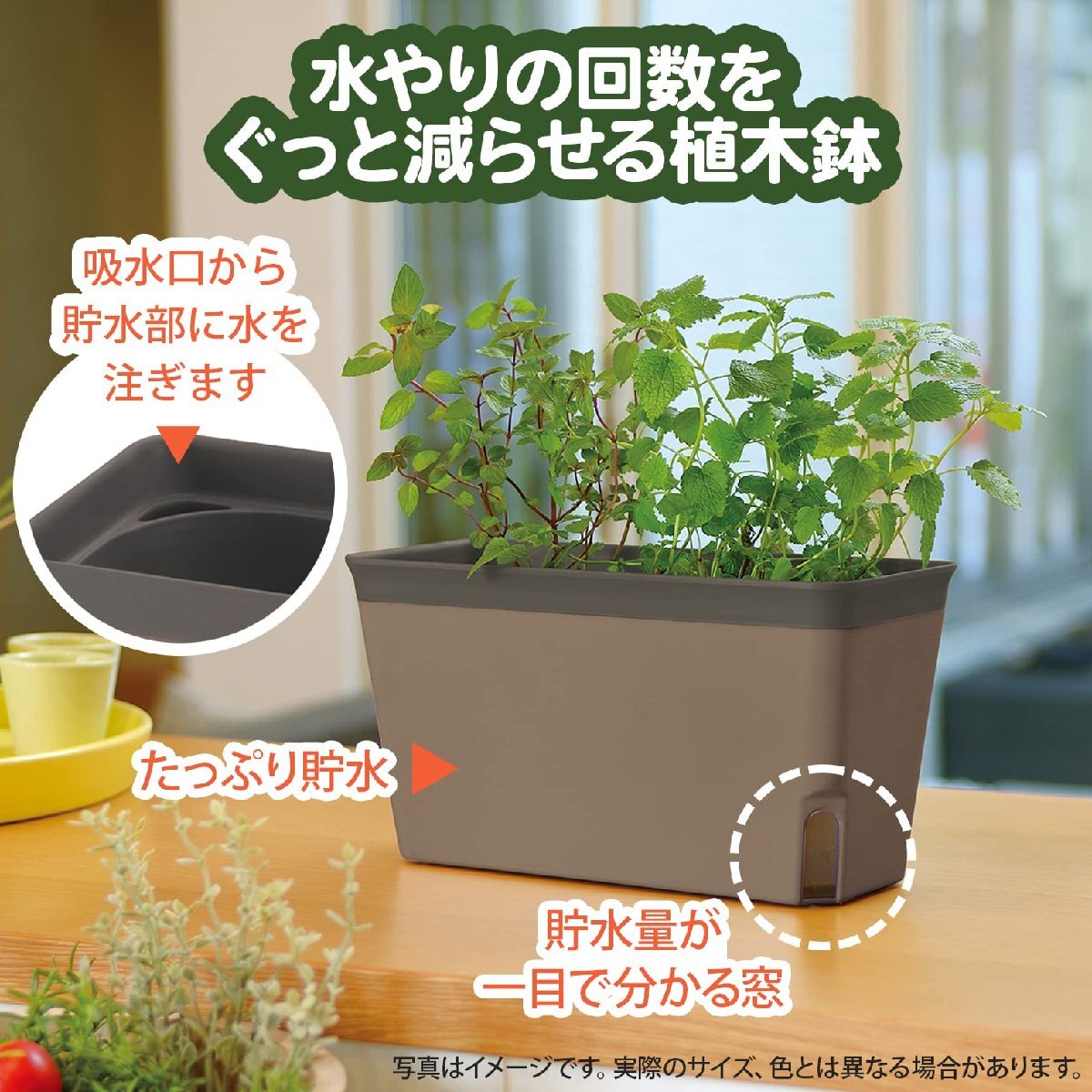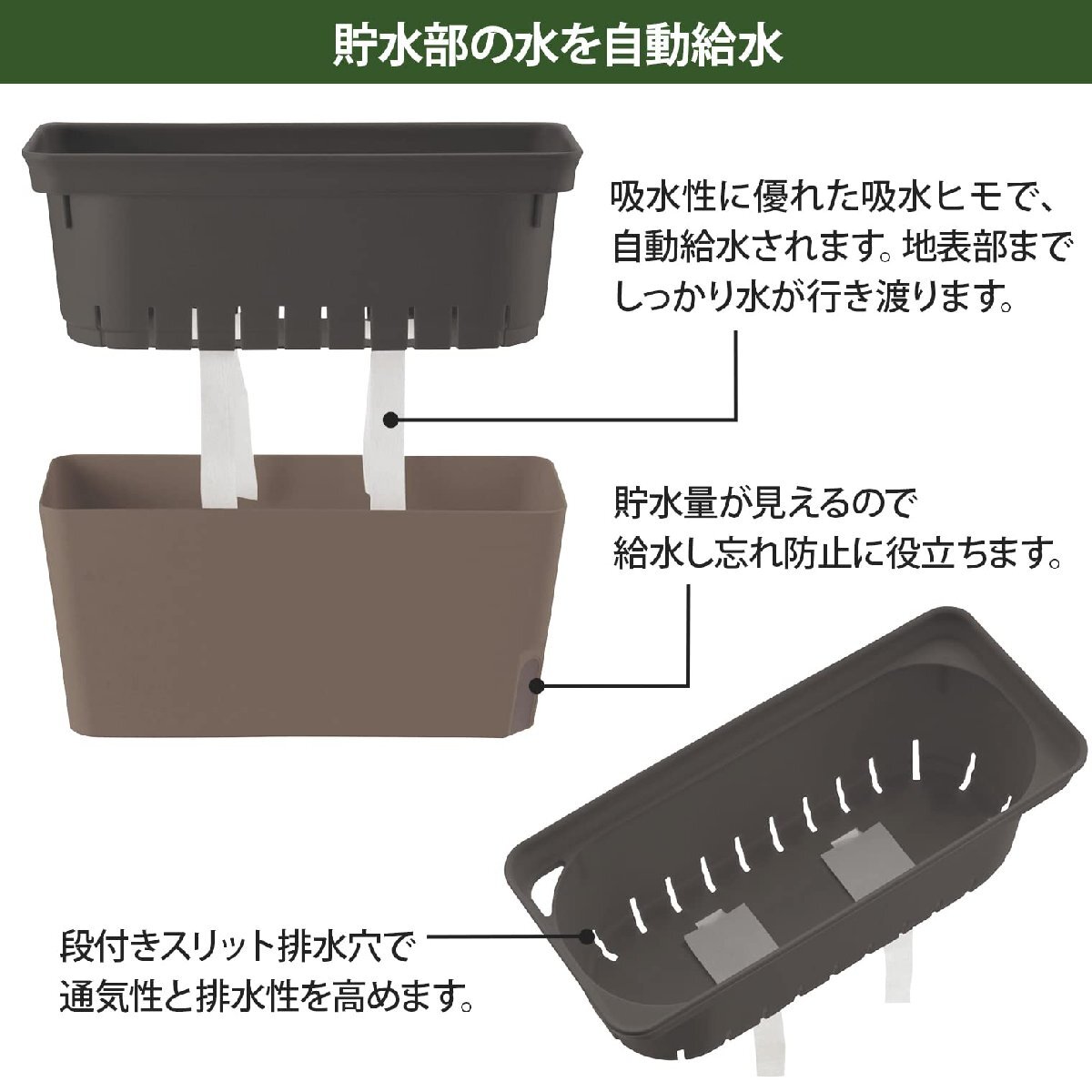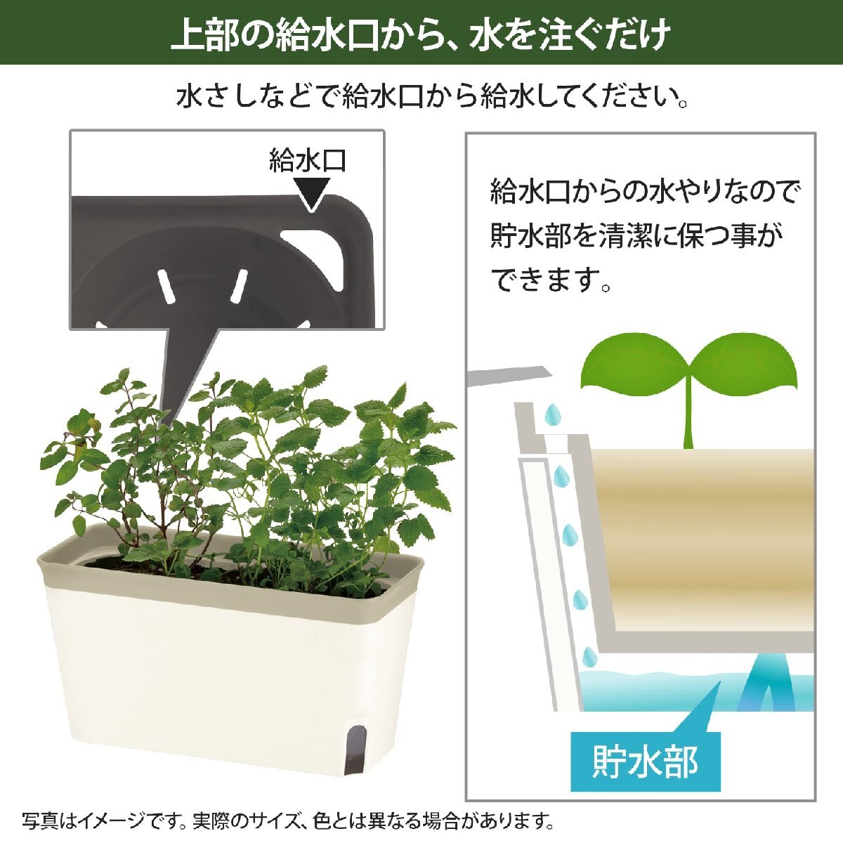 ブランド:リッチェル(Richell)カラー:ホワイトサイズ:土容量1.4L、水容量0.7Lポンと植えて、たま~に水やり、給水口から水やりができる底面給水プランターです。おおよそ1/3~1/4の回数ですむので水やりがラクです。※植物の種類や気温など、生育条件によって異なります。吸水性に優れた給水ヒモで、自動給水され地表部までしっかり水が行き渡る、底面給水機能付きです。貯水量が見える窓付きで、残量が一目でわかります。[サイズ]約27×12×高さ14.5cm、〈内寸〉約25×10×高さ7.9cm、〈下部内寸〉約23×7.8cm[容量](土容量)約1.4L、(水容量)約0.7L[素材・材質]ポリプロピレン不織布[生産国]中国●取扱い上の注意:鉢底石やゴロ石を使用しないでください。サイズ:27×12×高さ14.5cm【内寸】25×10×高さ7.9cm【下部内寸】23×7.8cm
