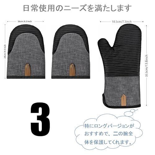 【商品仕様】:超ロングオーブン手袋1個:35.5x18.5センチ、オーブン手袋2個:24x16センチ、左右兼用、男女兼用のフリーサイズです。