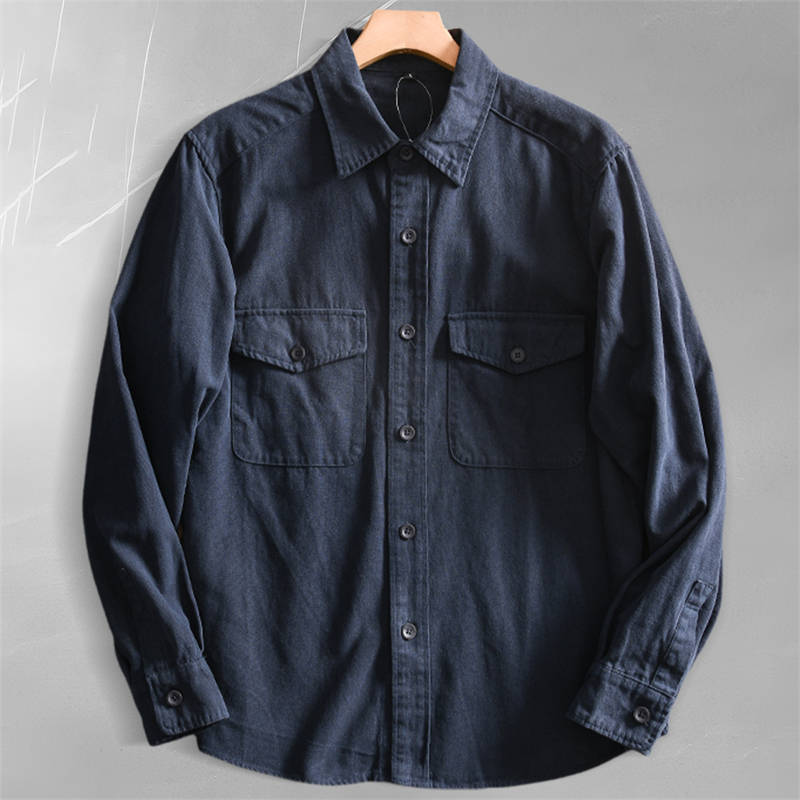 A122-Mネイビー 綿100% 長袖シャツ 折り襟 ワークシャツ メンズ 形態安定 無地 薄手 春秋 新品 シンプル カジュアルシャツ トップス