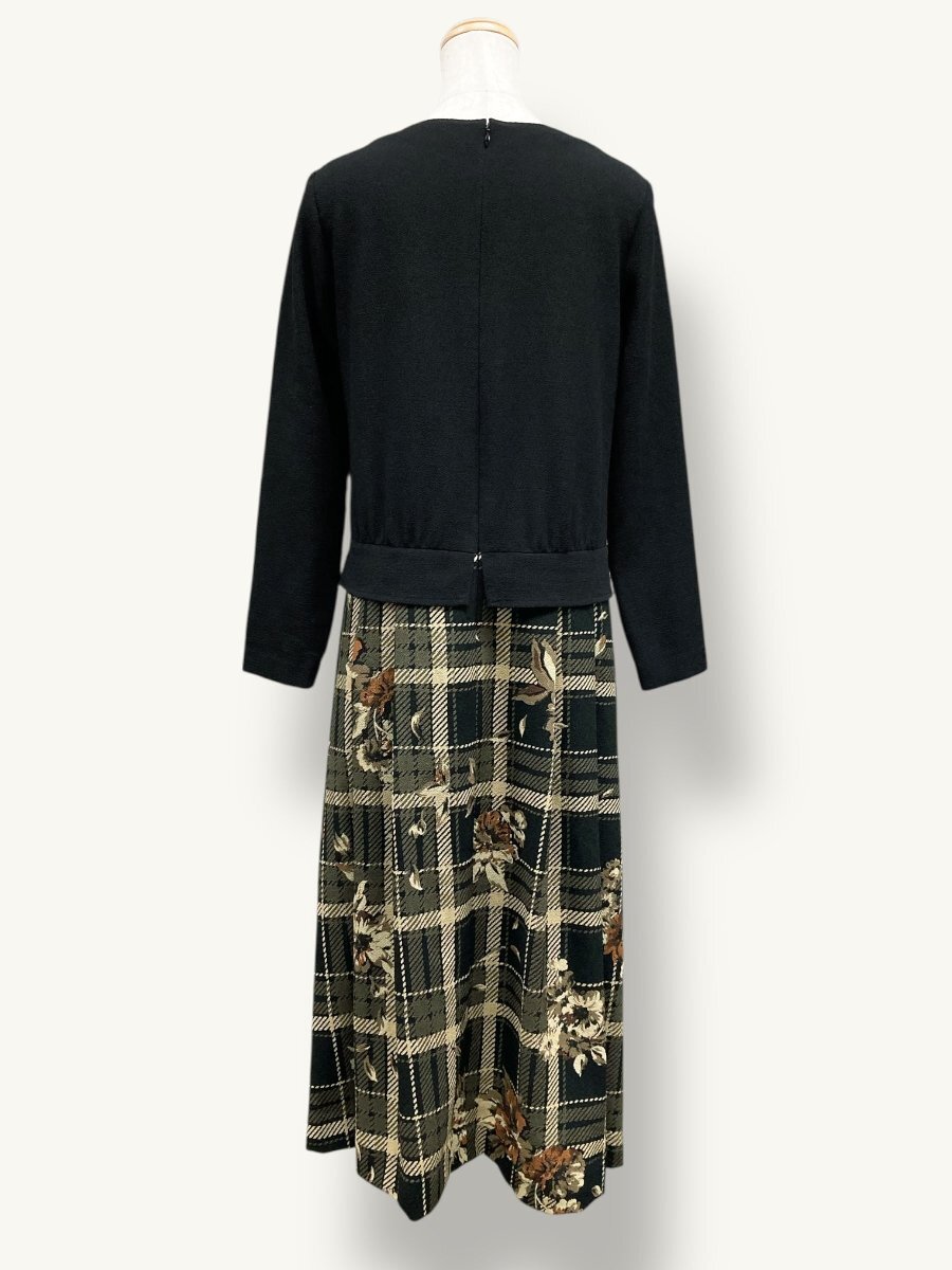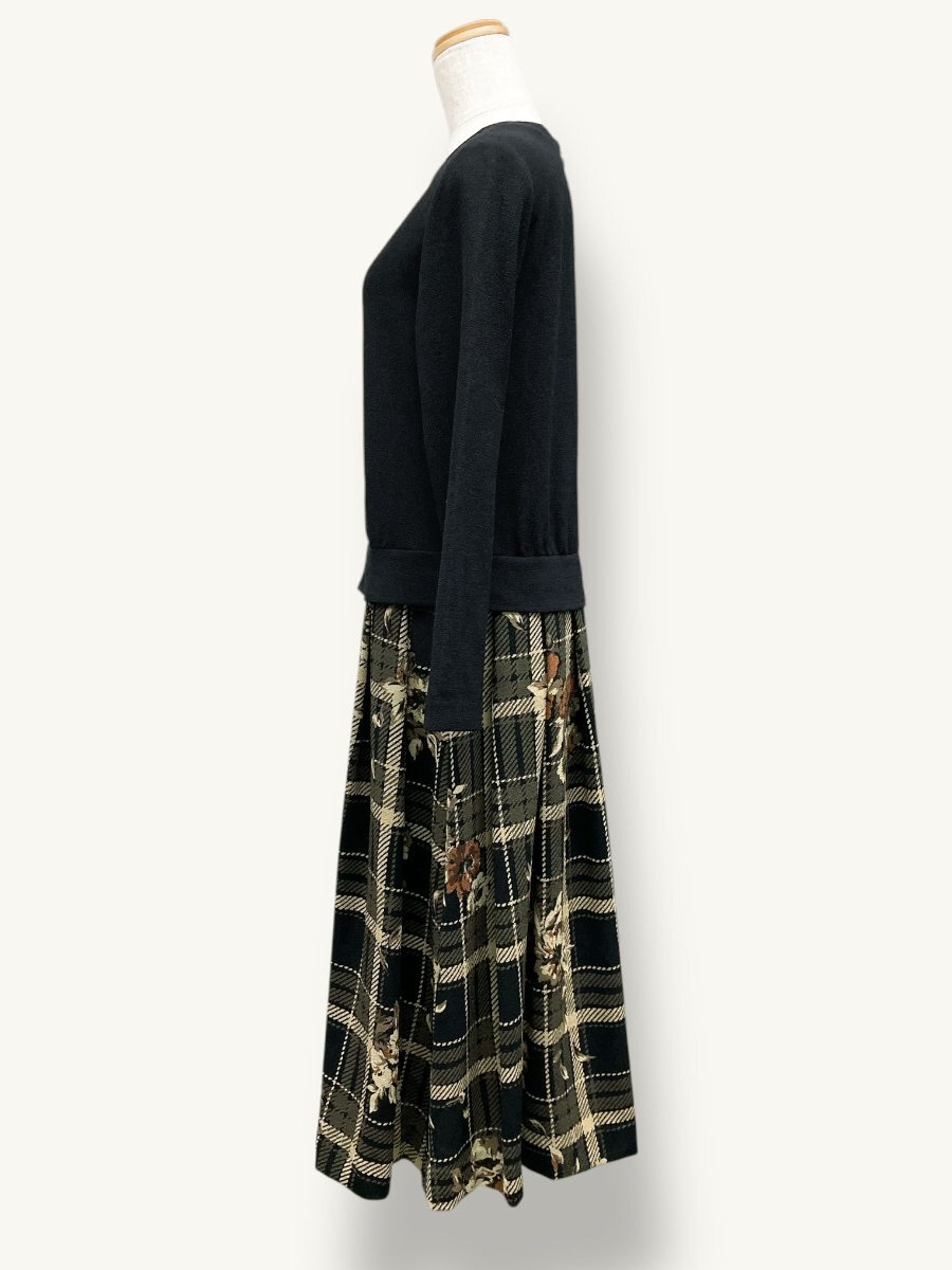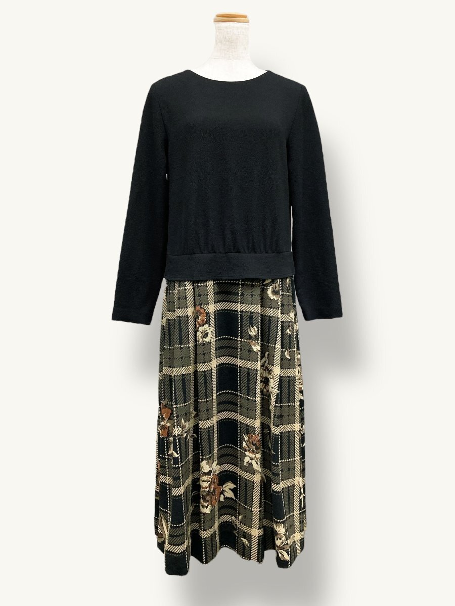 上身頃はシックなブラック無地、下身頃はチェック柄ベースにお花の咲き誇る華やかなデザインです。