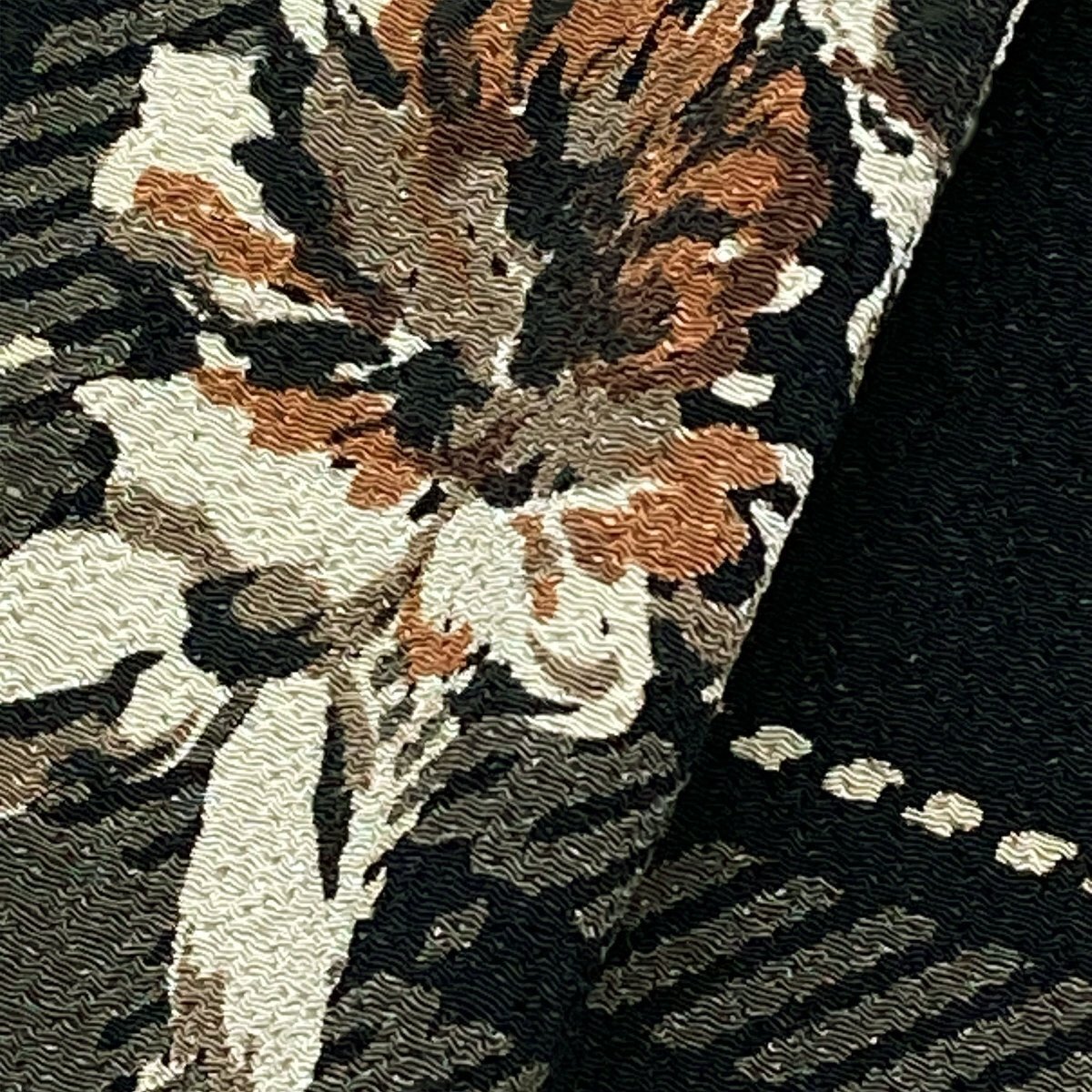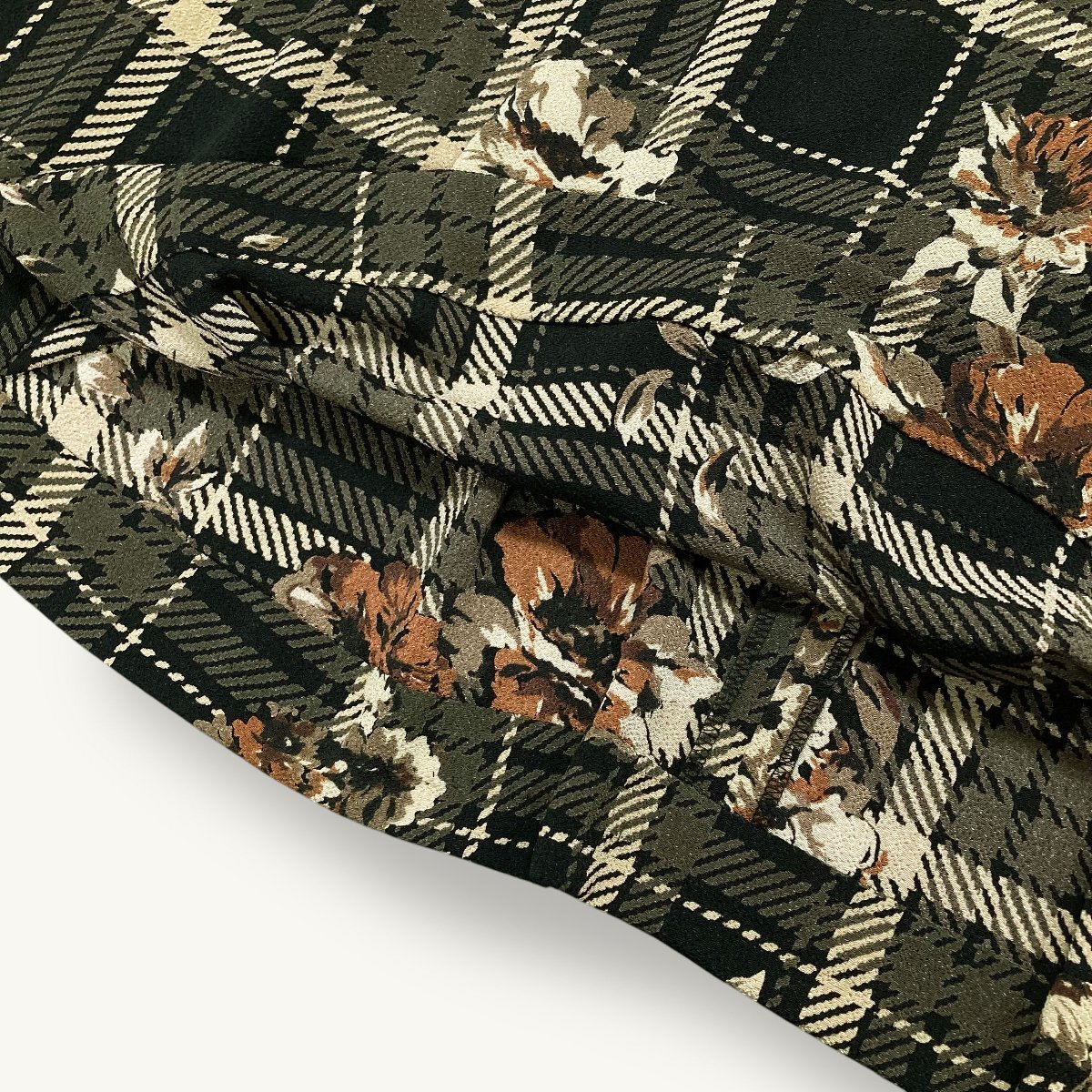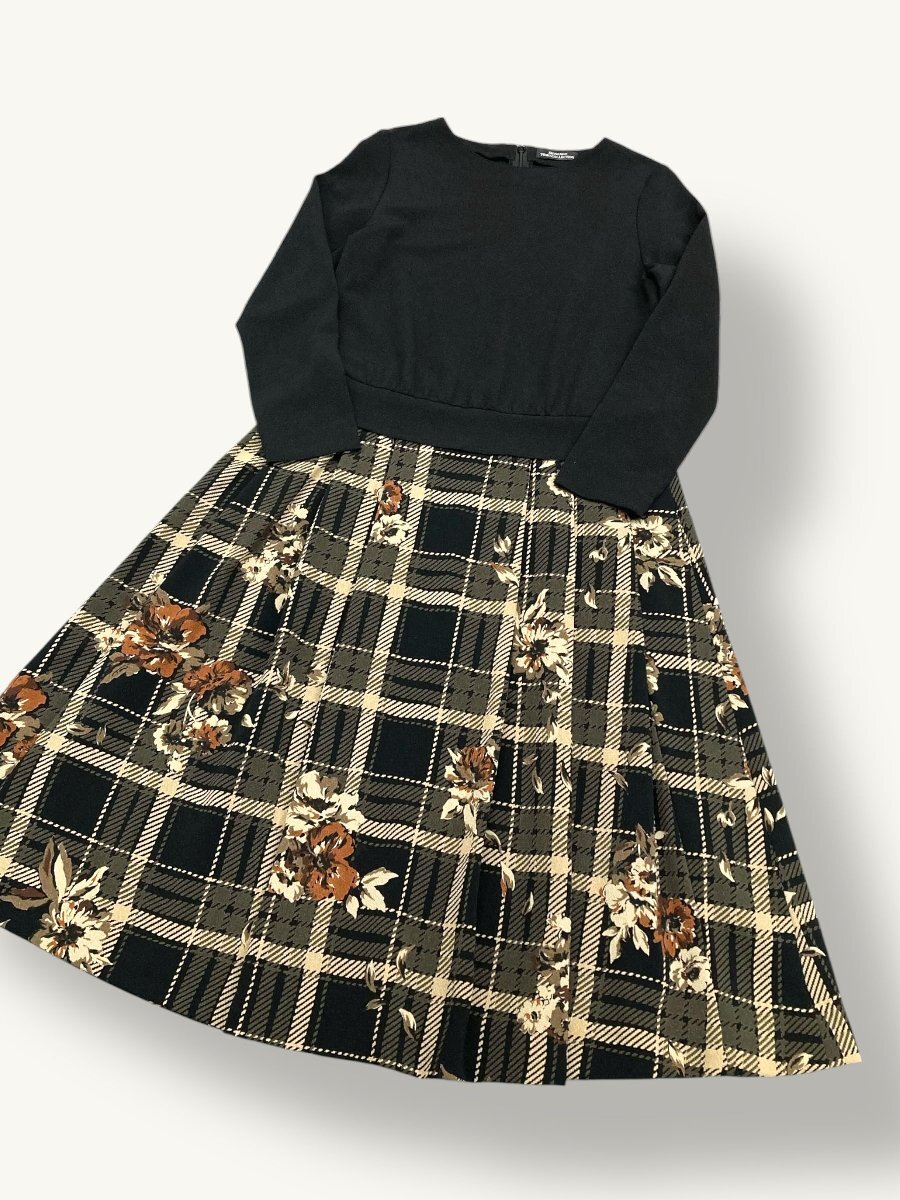 上身頃はシックなブラック無地、下身頃はチェック柄ベースにお花の咲き誇る華やかなデザインです。