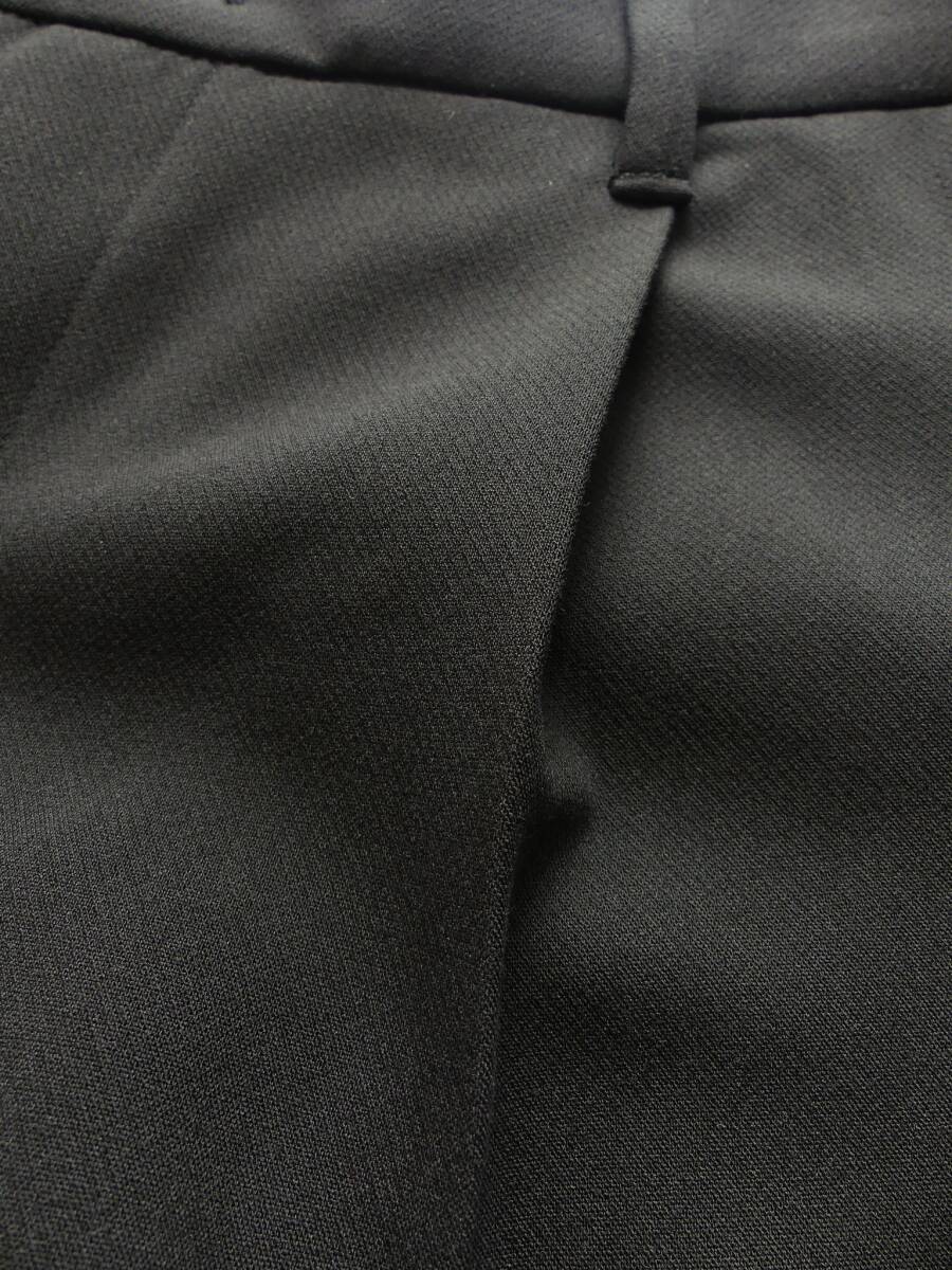 個人的に皆様におすすめしたいプレーンな黒スラックス。秋冬向けの商品です。お気に入りポイントは①スーツパンツのようにきれい目に見えて実はジャージ生地。そして②深いタックで今の気分の太めシルエットの程よくテーパード。①に関しては、例えば自分の場合は休日のお出かけに黒いスラックスを履きたいなと思っても、いわゆるスーツ生地のちゃんとしてるスラックスは気を遣うからか何となく履き疲れるところがあり、休日のリラックス気分にそぐわないため、どうしてもジーンズとかチノパンとか、気を使わないカジュアル素材のパンツを選んでしまいます。今回のお品はスーツ生地に見えてジャージ生地。ストレッチ性の高い厚手ジャージで超楽ちん。それでいてドレス感のある黒のスラックスですので、ジーンズよりも楽にリラックスして履けて、見た目はお洒落。これなら休日の気分にピッタリです。これこそまさに自分が求めていた黒スラックスと言ったところです。そして②スタイルもバッチリ今の気分。少し深めのタックでお尻から太腿にかけてゆとりを作ったシルエット。裾にかけて程よく絞ったテーパードのシルエット。タック無しスリムスタイリッシュのトレンドが2000年以降長く続きましたので、そのカウンターともいえる今の旬のスタイルは、おそらくは10年単位で長く続くだろうと自分は見ています。今回のパンツはまさにいま旬のスタイルで、当分先までこのスタイルが定番になると考えています。特別目立つディテールやシルエットではなく、あくまでもプレーンな黒いタックパンツですので、もちろんではありますがブレザーを合わせて月金のビジネスシーンにも馴染みます。楽ちんジャージですので少しリラックスできて、ストレスの少ない月金を過ごせるかなと思います。従いまして平日ビジネス、休日お出かけ、どちらにも使える万能の黒スラックスということで、皆様の用途に合わせて如何様にもご活用いただける万能のお品になります。仕事柄ジーンズでオッケーの方は特に、きれい目の黒いスラックスを履くことはないでしょうから、そんな方にこそこちらのパンツは特におすすめです。スニーカーを合わせてもギャップが逆にお洒落感を引き立たせる感じも黒いスラックスにはありますので、いつものジーンズをこちらの黒スラックスに履き替えるだけで面白いファッションが出来上がるはずです。着用シーズンは10月下旬からでしょうか。わりと厚手のジャージで冬向けのお品になります。