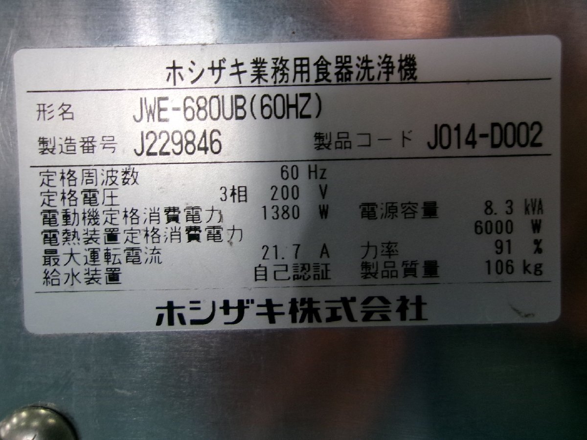 | メ ー カ ー | ホシザキ JWE-680UB 2019年製 |