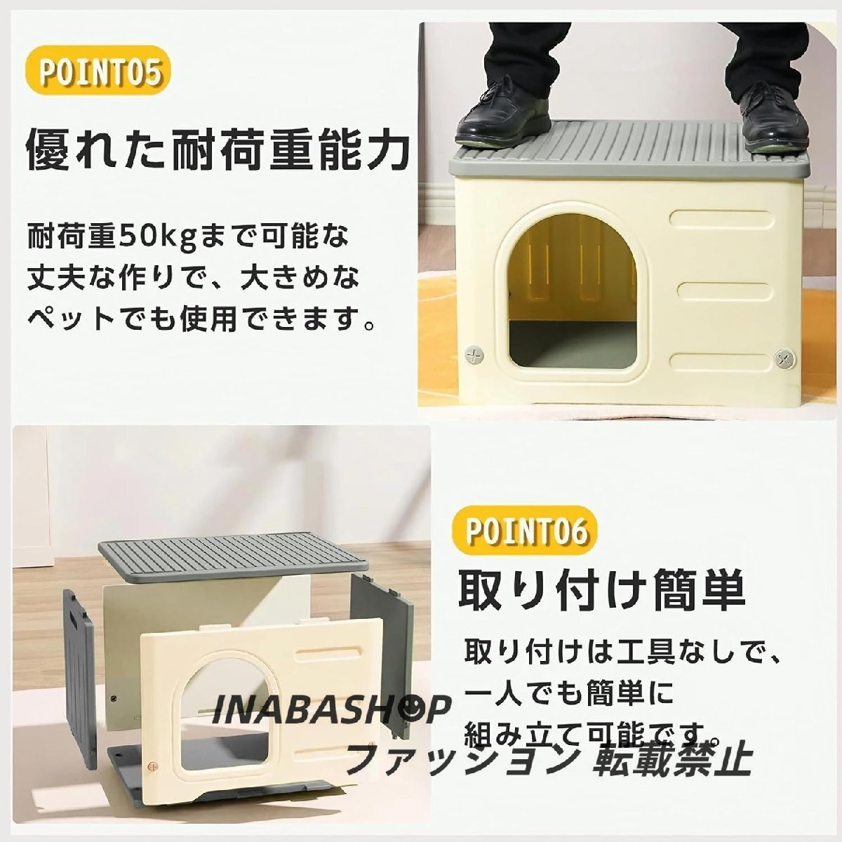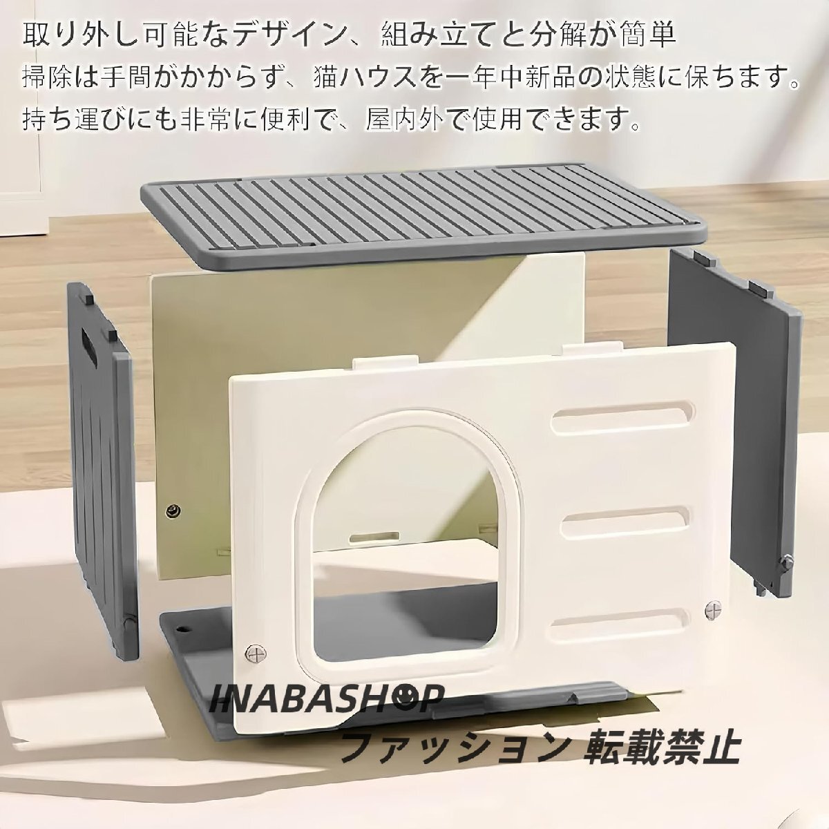取り外し可能なデザイン: この猫小屋の取り外し可能なデザインは、清掃を容易にします。ハウスのパーツを個別に取り外し、猫の健康と清潔を維持します。また、猫ハウスの設置や移動も簡単に行えます