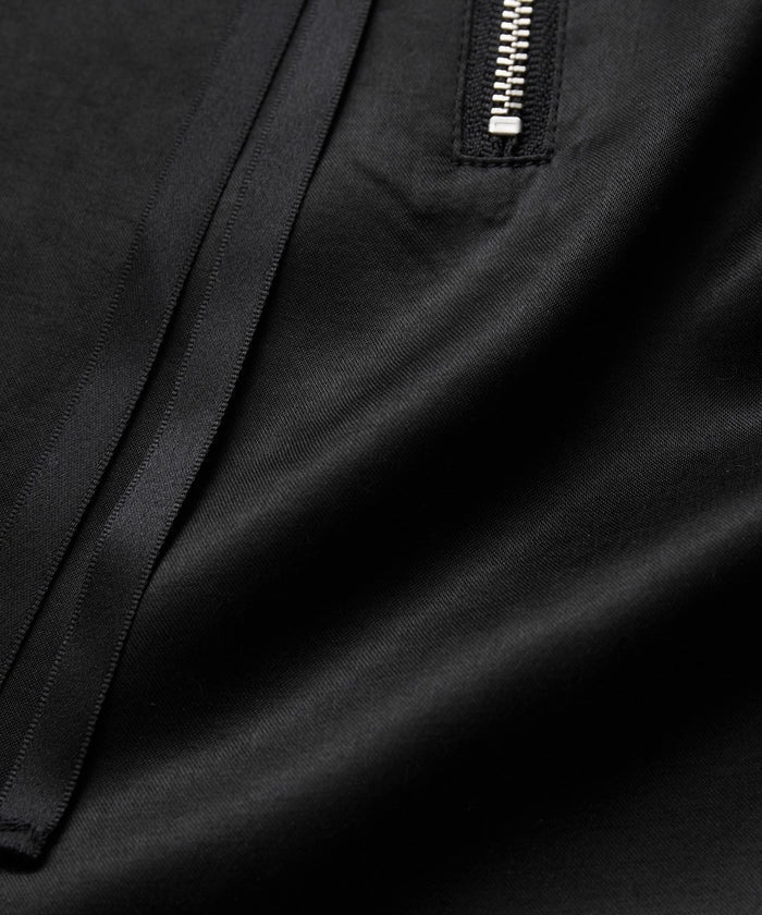 滑らかなタッチとナチュラルなシワ加工が魅力のサテンTEE。きれいめの素材ながら、あえてしっかりとした太めの編み立てリブ襟や、後ろあきの金属ファスナーでコンサバになり過ぎないモードさのあるデザイン。ドロップショルダーでリラックス感のあるサイジング。1枚で着るだけでこなれ感が出る、シンプルなら細部にこだわった、大人のカジュアルスタイルに活躍する1枚。