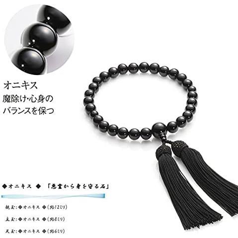 【数珠の特徴】: ◆オニキス ◆ 「悪霊から身を守る石」とされ、肉体の内側にある本能を目覚めさせ、運動能力を刺激して向上させる力があると伝えられています。