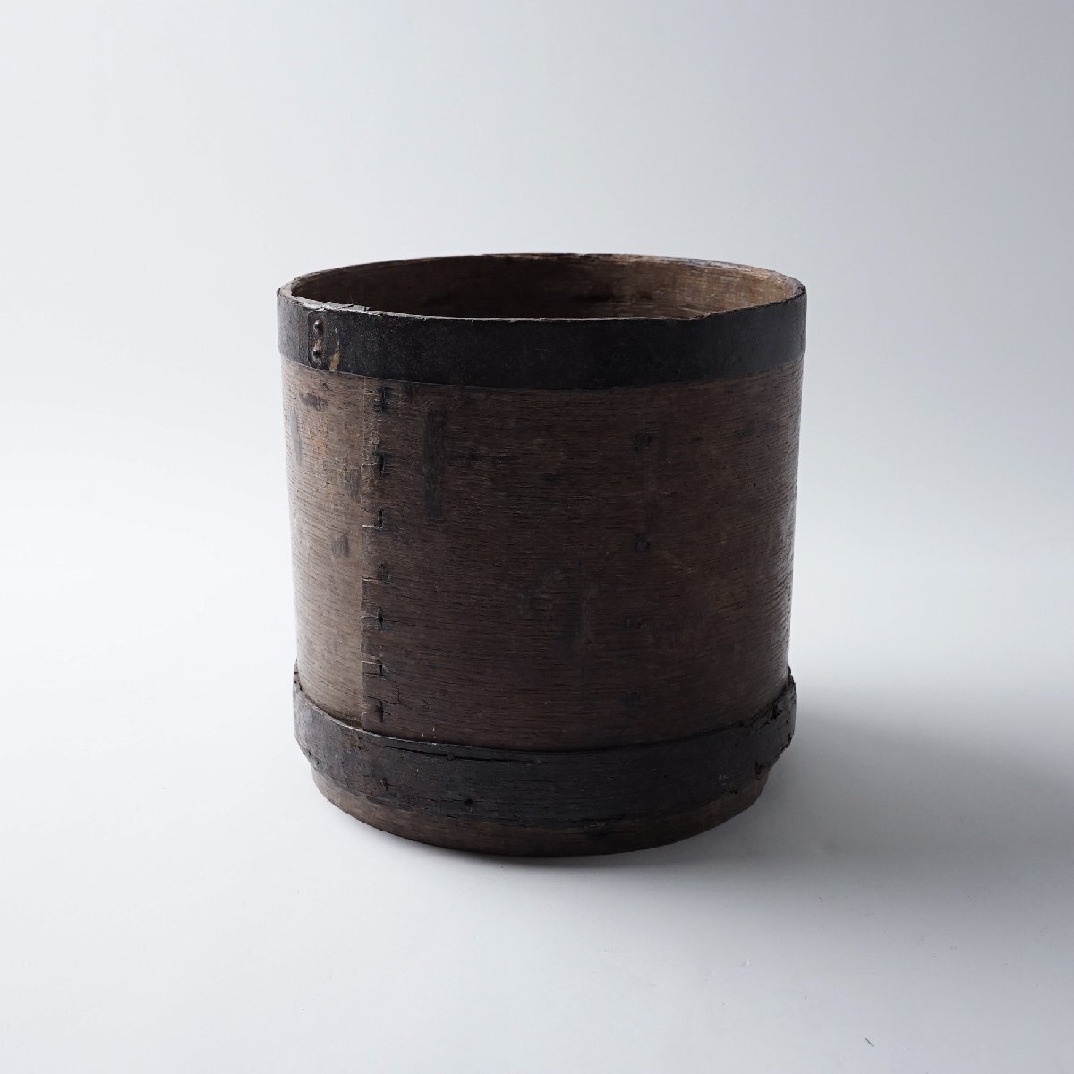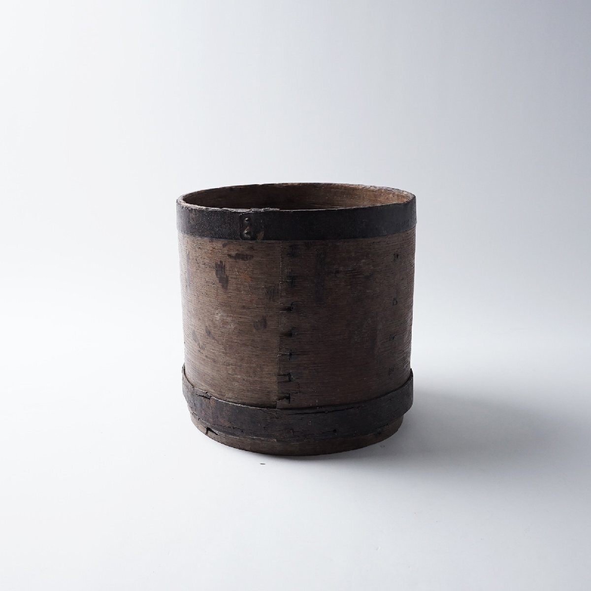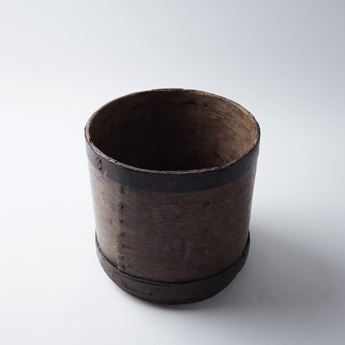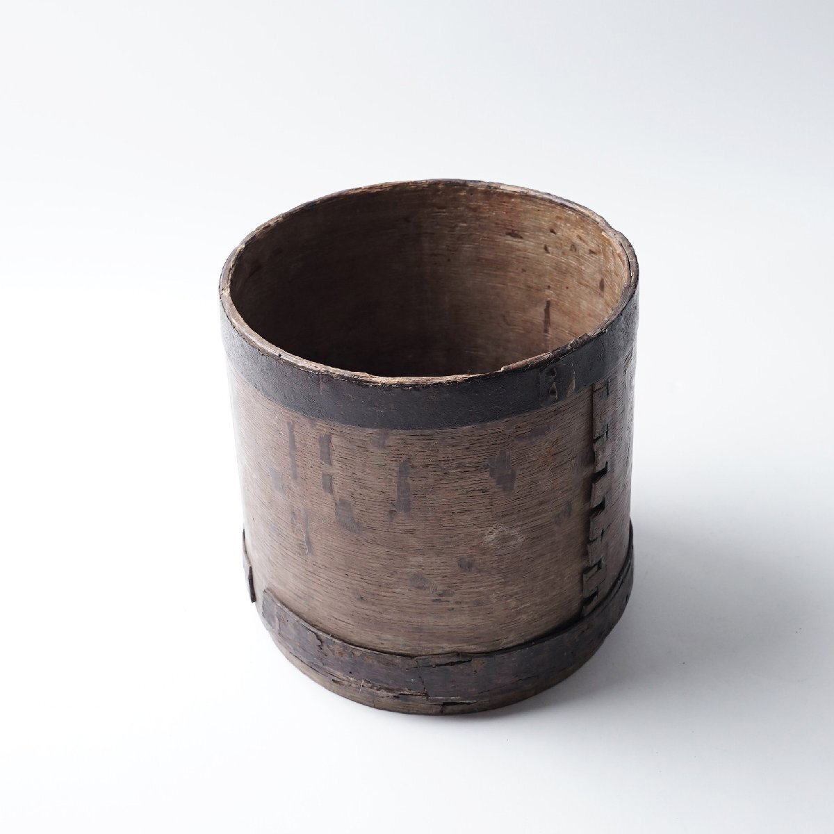 ○状態:下フチに巻いている木に割れがあります。虫食いの小穴があります。アンティークらしい枯れた風合いが良い雰囲気の枡です。写真は実物です。