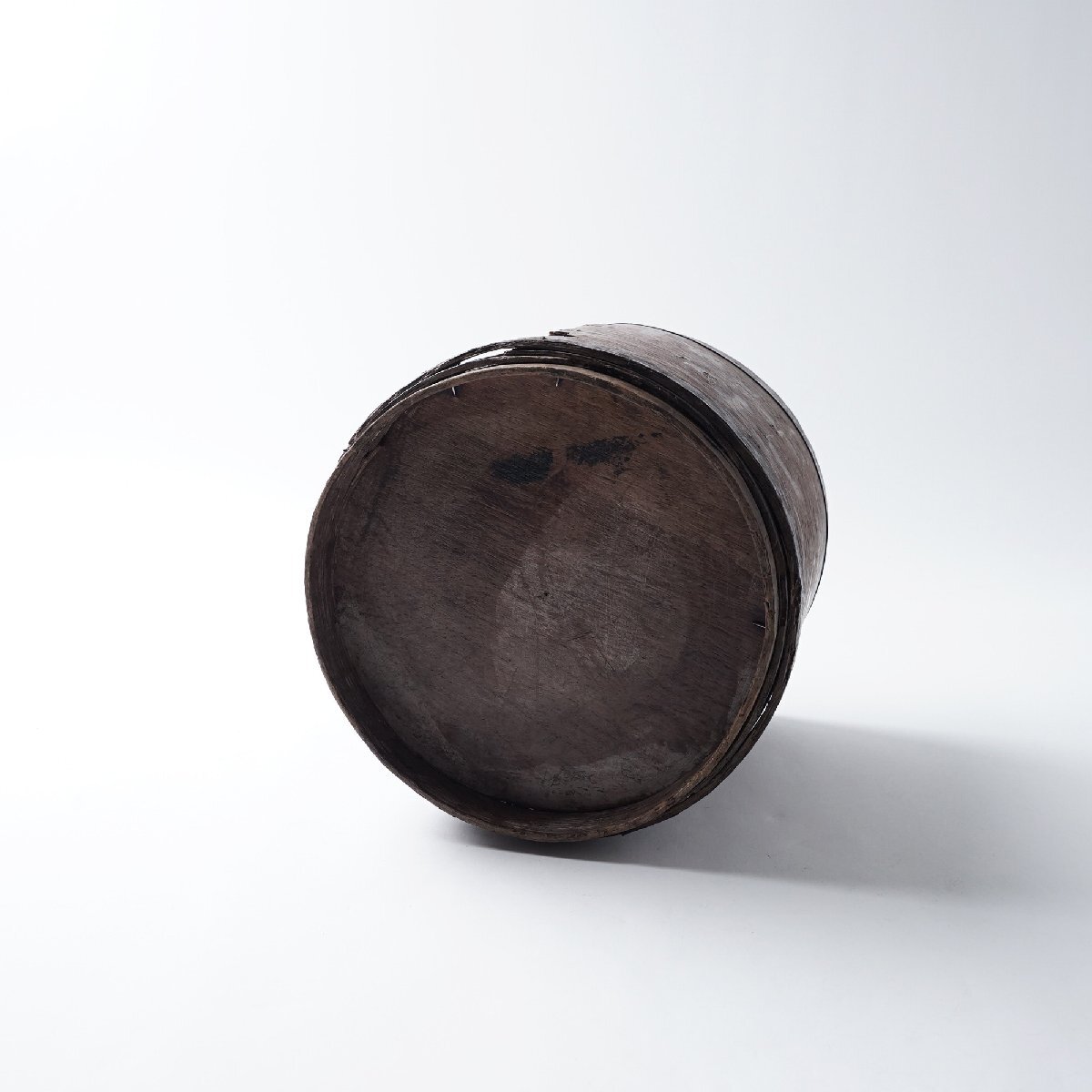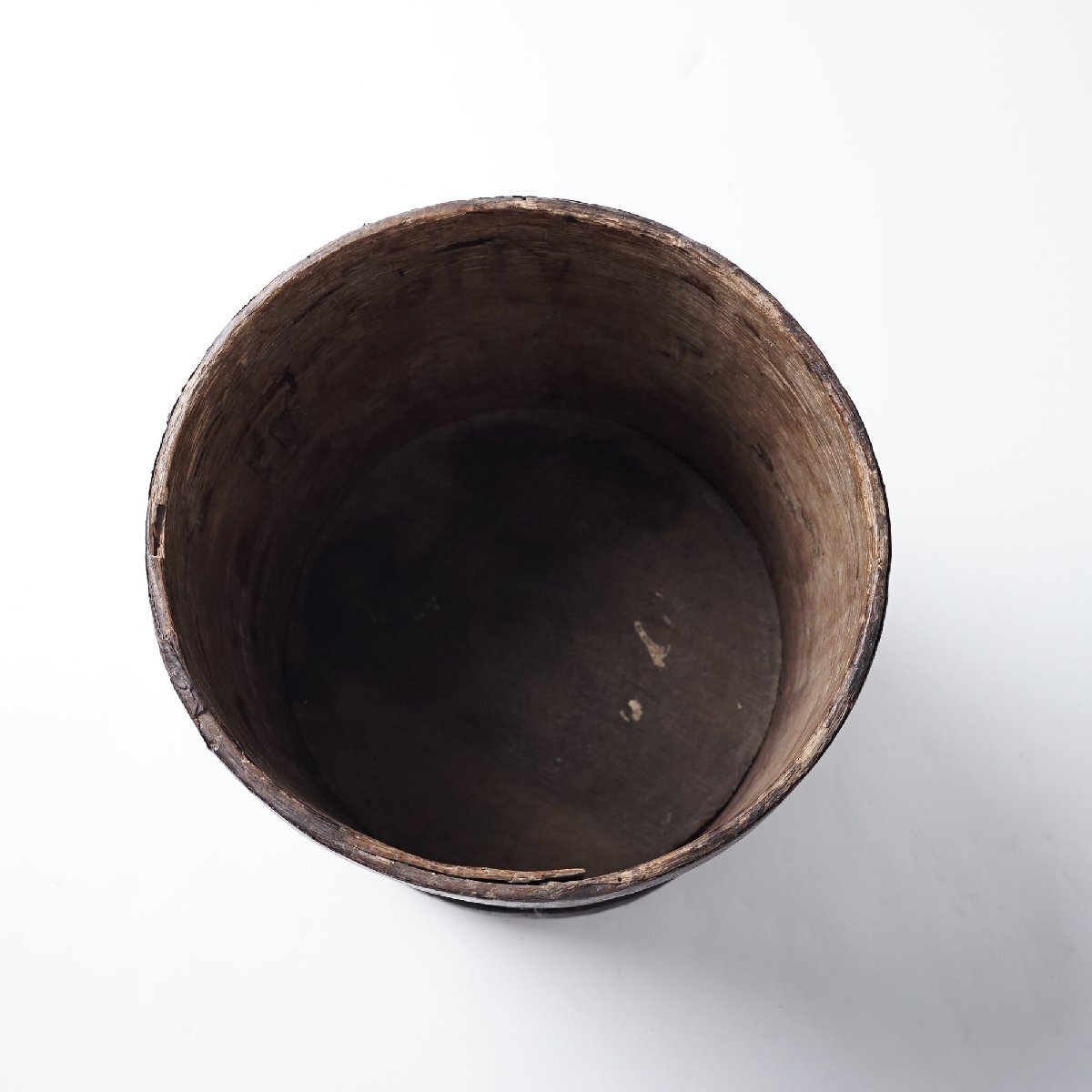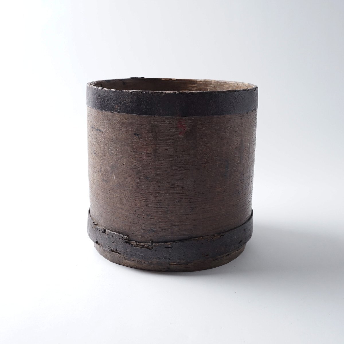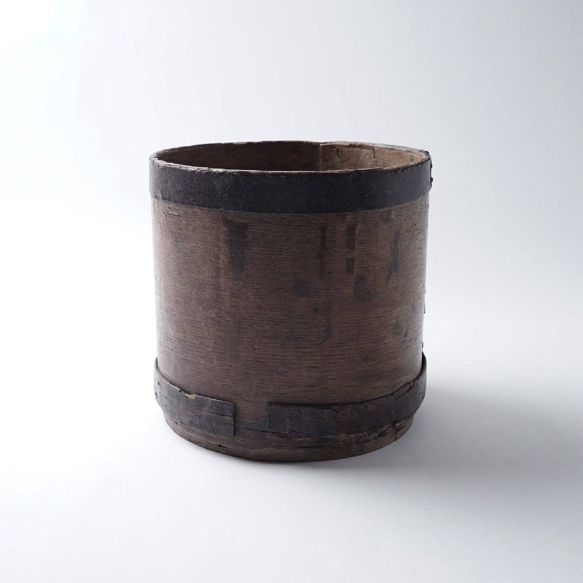 ○状態:下フチに巻いている木に割れがあります。虫食いの小穴があります。アンティークらしい枯れた風合いが良い雰囲気の枡です。写真は実物です。