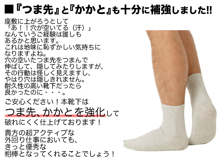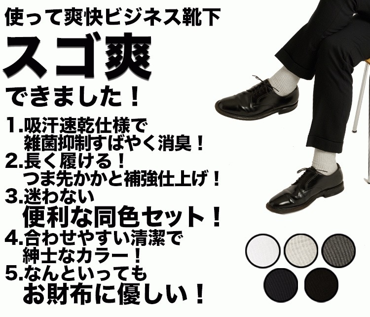 | ■■■店長のコメント■■■ ■使って爽快ビジネス靴下「スゴ爽」できました! 1.吸汗速乾仕様で雑菌抑制すばやく消臭! 2.長く履ける!つま先かかと補強仕上げ! 3.迷わない便利な同色セット! 4.合わせやすい清潔で紳士なカラー! 5.なんといってもお財布に優しい! ■ウミネコが求めたものとは・・・ 一、「よし!蒸れてない!」座敷デートや飲み会でも安心の速乾消臭効果が欲しい。 一、穴あきで恥ずかしい思いはもうしたくないッ。。。つま先とかかとへの十分な補強が欲しい。 一、スーツに合う、そしてカジュアルにも合う、どうせなら自信が湧くくらいシンプルでスタイリッシュな方がいい。 一、「靴下片方どこいった!?」に終止符を!これ以上、片方の靴下探しで朝の貴重な時間を無駄にしたくない! 一、そしてこれらのこだわり機能がお財布に優しく手に入れられること。 ウミネコの商品はこれらを【全てクリア】いたしました! ■吸汗速乾生地で抑菌消臭!座敷デートや飲み会でも安心の防臭効果 足の悪臭の原因の一つである汗。そして汗による蒸れで、靴下内は雑菌の絶好の増殖環境となります。 本靴下は雑菌の増殖の原因となる汗蒸れを解決! 吸汗速乾特性のある生地により、従来品に比べ、効果的に汗を吸い取り、歩くごとに呼吸するように乾燥を促していきます。 これにより靴下内環境の蒸れを解消し、雑菌の繁殖を抑え、ニオイが発生しづらい環境を作ることができました。 また、その通気性とよく乾きやすい生地により、足元を清潔に保ちます。 肌触りの良い生地は程よい厚さに仕上げ、乾きやすいからお洗濯も楽ちん! メリットを沢山感じて頂けるような仕様に仕上げております。 ■『つま先』と『かかと』も十分に補強しました!! 座敷に上がろうとして「あ!!穴が空いてる(汗)」なんていうご経験は誰しもあるかと思います。 これは地味に恥ずかしい気持ちになりますよね。 穴の空いたつま先をつまん伸ばして、隠してみたりしますが、その行動は怪しく見えますし、やはり穴は隠しきれません。 耐久性の高い靴下だったら良かったのに・・・。 ご安心ください!本靴下はつま先、かかとを強化して破れにくく仕上げております! 貴方の超アクティブな外回り仕事においても、きっと優秀な相棒となってくれることでしょう! ■「靴下片方どこ?」から開放されます! そう、便利な同色セットだから! バタバタと忙しい朝の準備。 「あれ、靴下片方どこ行った?も探しても見つからない。」 「しょうがないから別の靴下にしよう・・・こっちも靴下片方どこ行った?」 こんな経験ありませんか? 朝からイライラして気分も嫌になりますよね! 本靴下ならもう大丈夫! 同色セットでの販売となっておりますので、悩む必要も無くセットの中からササッと2足選べば良いのです! これで朝の靴下捜索大作戦から開放されます! だから、 ・片方洗い忘れても ・片方無くしても ・片方サンタさんに使っても いつでもすぐに、必要な2足を 選び出すことが出来るのです! これで選択疲れのストレスも大幅軽減!脳もリフレッシュ!キリッと軽快に出勤しちゃってくださいね! ■自信が湧くほどシンプルでスタイリッシュなデザイン! スーツに合うのはもちろん、カジュアルスタイルにも合わせられるように、 シンプルでスタイリッシュなデザインに仕上げました。 やはり、オシャレは足元からですね。 本靴下は『気取らない、でもただの靴下ではない高貴な存在感を持つ清潔な靴下』というコンセプト。 また、色は合わせやすいカラーだけをご用意しました。 年齢問わず、スタイリッシュに着用することができ、どれをはいても隣の紳士にナチュラルに差をつけることができます。 ■お財布にとっても優しくご提供が可能となりました! 「でもこれだけこだわりの靴下だからお高いんでしょ?」 いえいえ!大丈夫です! 今回もウミネコの商品企画開発部門頑張りました! ・工場直取引! ・問屋を通さない! ・流通の最適化! ・徹底的なシステム化! などなど、 あらゆる工夫を徹底的に行い、 大幅なコストカットを実現! こだわりのある靴下ですが、 お財布にとても優しくご提供することができるようになりました! ありがたいことにリピーター様も順調に増えております! ぜひぜひお試しくださいね! ■■■仕様詳細■■ ■サイズ フリーサイズ ※快適着用サイズ25cm-28cm ■機能やメリットなど ・吸汗速乾記事によるムレ防止・抑菌・防臭。 ・通気性と肌触りの良い生地で快適な着用感。 ・選択疲れの無い同色セット。 ・つま先・かかとの十分な補強。 ・隣の人に差がつくシンプルスタイリッシュなデザイン。 ・どんな服にも合わせられるカラーバリエーション。 ・大幅コストカットでお財布に優しく手に入るこだわりの機能。 ■用途 ビジネス、フォーマル(冠婚葬祭)、スーツ用、カジュアル、普段履き。 リクルート、就職活動、新生活、父の日、日頃の感謝や誕生日などのプレゼントにも大変喜ばれています。 ■生地 綿72% ポリエステル