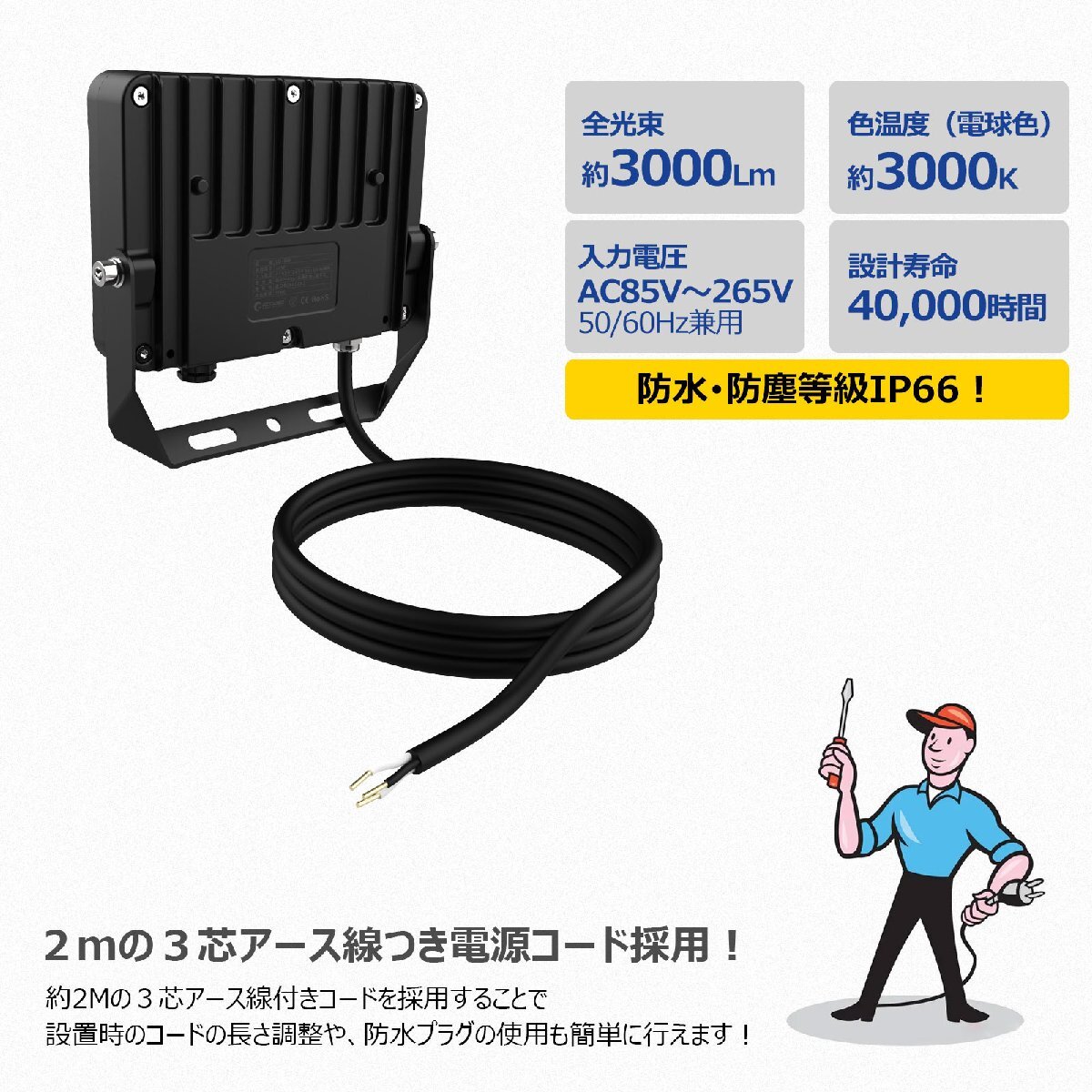 電球色 GOODGOODS LED投光器 20W 3000lm 照射角度120° IP66 防水 耐熱 新仕様ステー 通気弁 アース線 高輝度 工場 倉庫 屋外