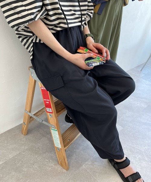 キーワード:カーゴパンツ レディース ウエストゴム ストレート ハイウエスト フルレングス ワイドパンツ 無地