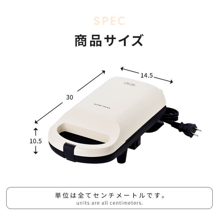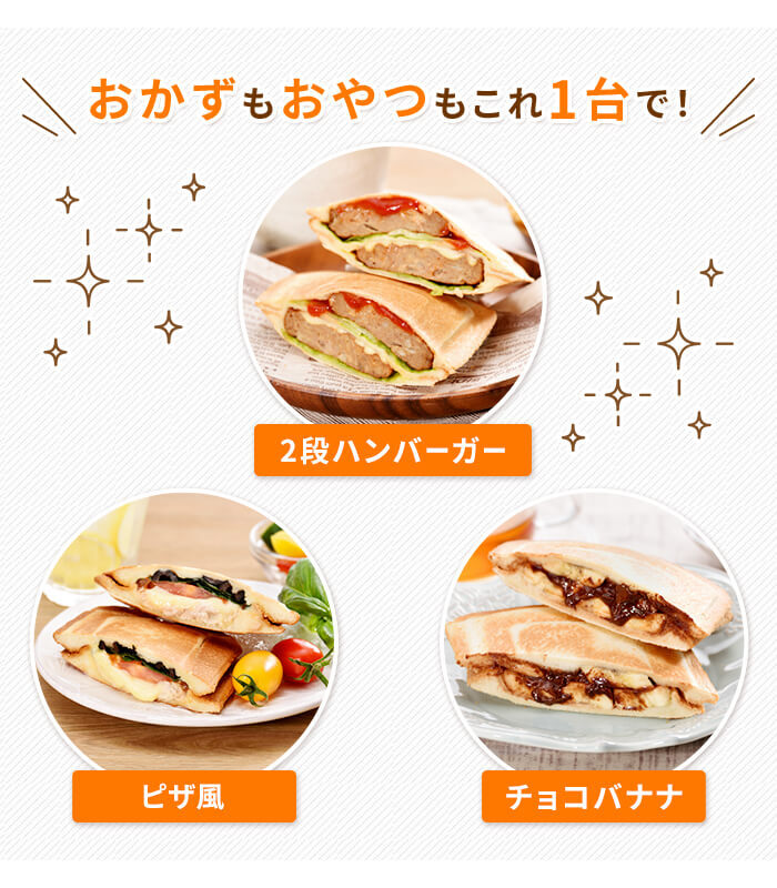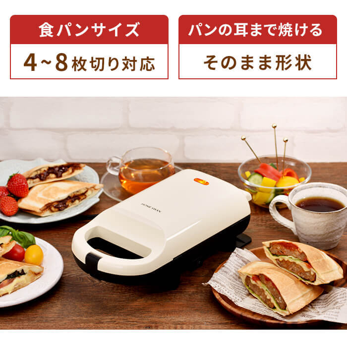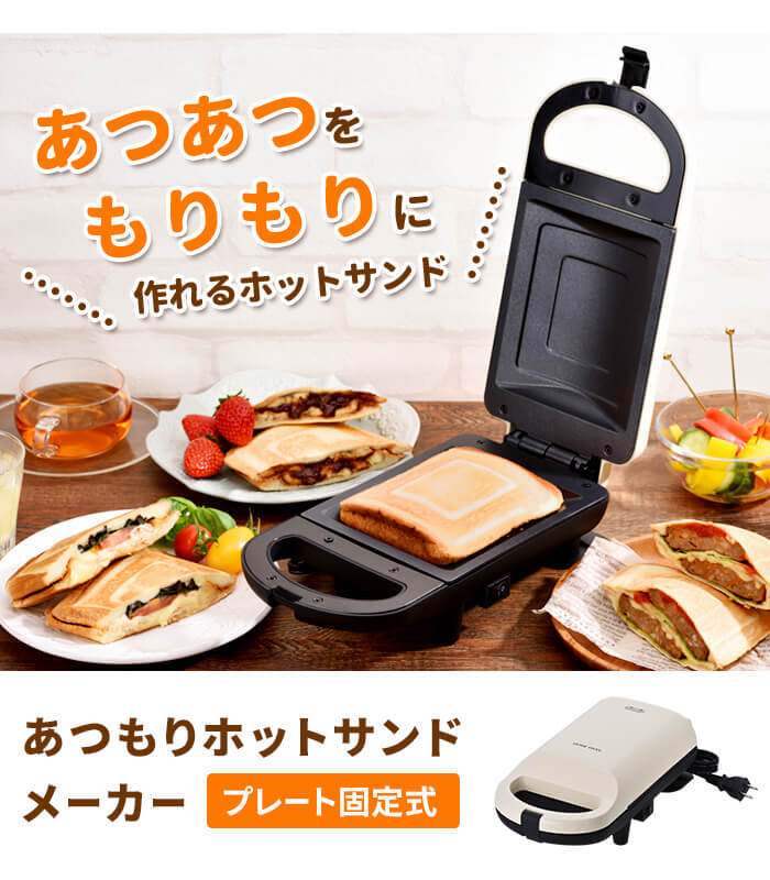 | ・あつあつをもりもりに作れるホットサンドメーカー。 ・8枚切り3枚使えるボリューム感。 ・4~8枚切り食パン対応。 ・食パンの耳まで焼ける”そのまま形状”。 ・スイッチ付きで安心。 ・通電がわかるパイロットランプ付き。 ・プレート固定式 |