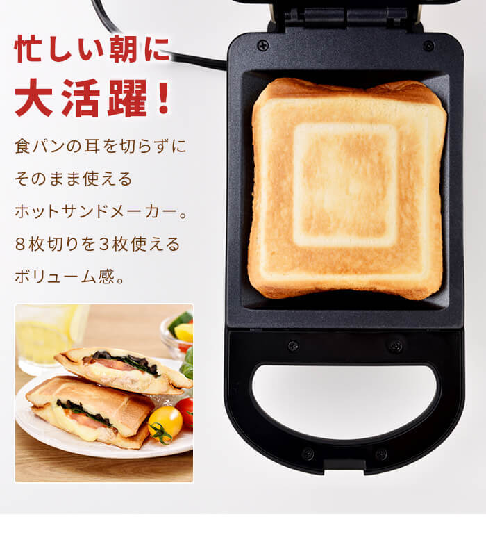 | 食パンの耳まで焼けるホットサンドメーカー。 8枚切り3枚使えるボリューム感。 もりもりに作れる、4~8枚切り食パン対応。 食パンの耳まで焼ける”そのまま形状”。 スイッチ付きで安心。 通電がわかるパイロットランプ付き。 |