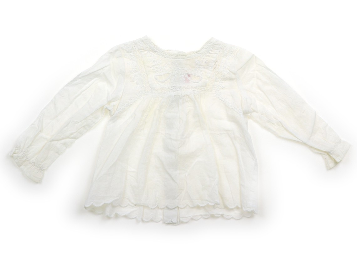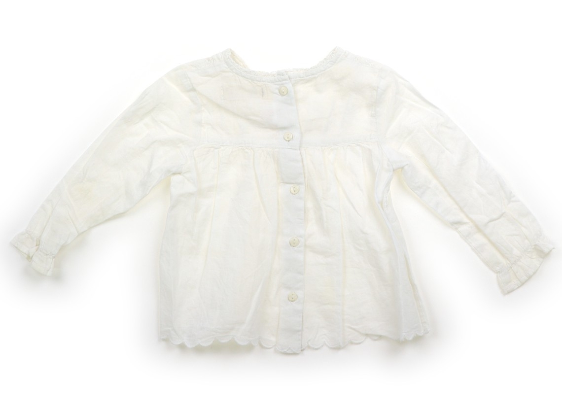 素材タグが切られています。薄手布帛生地です。後ろボタンあきです。前衿ぐりと前ヨーク周辺に黄ばみがあり、前ヨーク下と後ろ裾に3cmほどの黄ばみシミがあります。型崩れはありません。