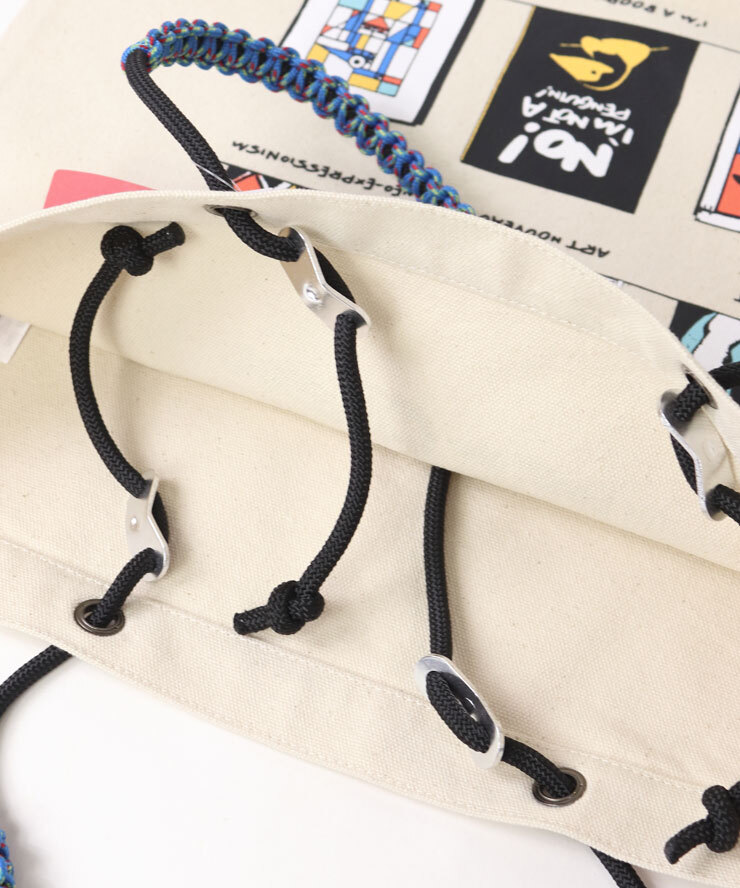 持ち手にはカラフルなロープハンドルを使用し、アクセントになるだけでなく肩掛けしやすい仕様になっています。