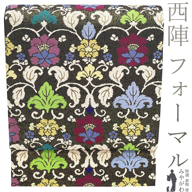 袋帯 未使用 正絹 フォーマル 京都 西陣 金糸 黒金地 花更紗 個性的でおしゃれなデザイン 上質 新古品 仕立て上がり みやがわ sb54332