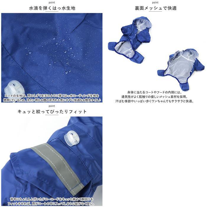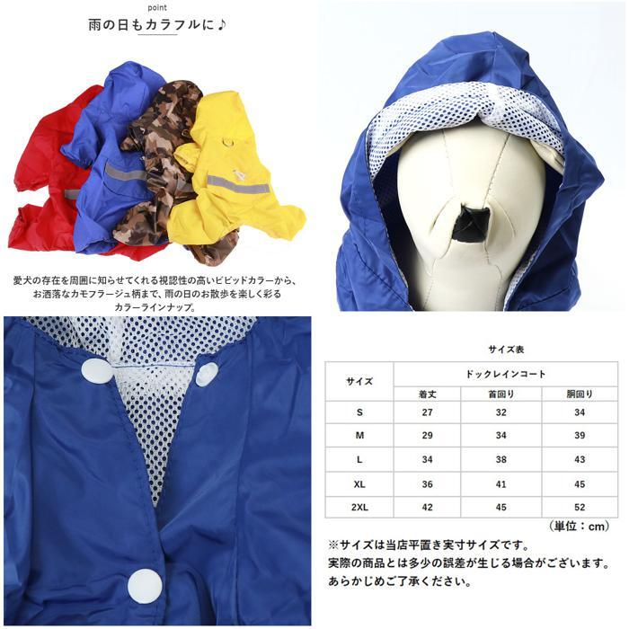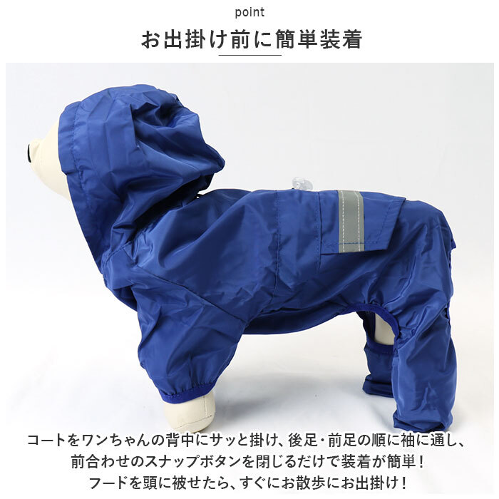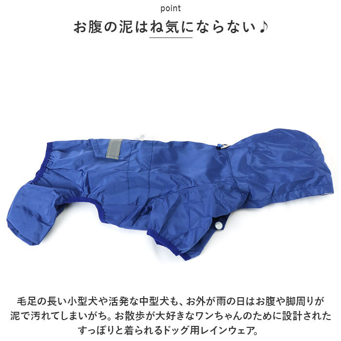 | 商品説明 | ・・頭も身体もすっぽり包んで、おなかの泥はねもしっかりガード♪雨の日のお散歩を快適にする「ドッグ用レインコート(小型・中型犬用)」が新登場。 ・【お腹の泥はね気にならない♪) ・毛足の長い小型犬や活発な中型犬も、お外が雨の日はお腹や脚周りが泥で汚れてしまいがち。お散歩が大好きなワンちゃんのために設計されたすっぽりと着られるドッグ用レインウェア。 ・【お出掛け前に簡単装着】 ・コートをワンちゃんの背中にサッと掛け、後足・前足の順に袖に通し、前合わせのスナップボタンを閉じるだけで装着が簡単!フードを頭に被せたら、すぐにお散歩にお出掛け! ・【水滴を弾くはっ水生地】 ・コートの生地は、雨のしずくを玉のように弾くはっ水コーティング生地を使用しているため、冷たい雨もお腹の泥汚れも気にせずに快適なお散歩タイム♪ ・【裏面メッシュで快適】 ・身体に当たるコートやフードの内側には、通気性がよく肌触りの優しいメッシュ素材を採用。汗ばむ季節やいっぱい歩くワンちゃんでもサラサラと快適。 ・【キュッと絞ってぴったりフィット】 ・背中にちょこんと付いたドローコードをキュッと締めて胴回りをフィットさせれば、雨がコートの中に入ってしまう心配がなく安心。 ・【おトイレ楽ちん・ゆったり設計】 ・ワンちゃんがおトイレする時にもたつかない♪お腹周りやお尻が大きく開いたゆったりデザイン。 ・【リードとつなげるDカン付き】 ・首の付け根のDカンを使用すれば、コートの内側に首輪をしなくてもリードのフックをダイレクトに接続可能。 ・【キラリと光って安心☆】 ・自動車のヘッドライトにキラリと光る☆背中の飾りフラップに夜間のお散歩でも安心なリフレクターライン付き。 ・【ピッタリサイズが見つかる!】 ・・「Sサイズ」から「2XLサイズ」までの5サイズ展開で、チワワのような小型犬から、柴犬のような中型犬まで幅広くカバー。愛犬の身体に合わせて、ぴったりサイズをチョイス! ・【雨の日もカラフルに♪】 ・愛犬の存在を周囲に知らせてくれる視認性の高いビビッドカラーから、お洒落なカモフラージュ柄まで、雨の日のお散歩を楽しく彩るカラーラインナップ。 |