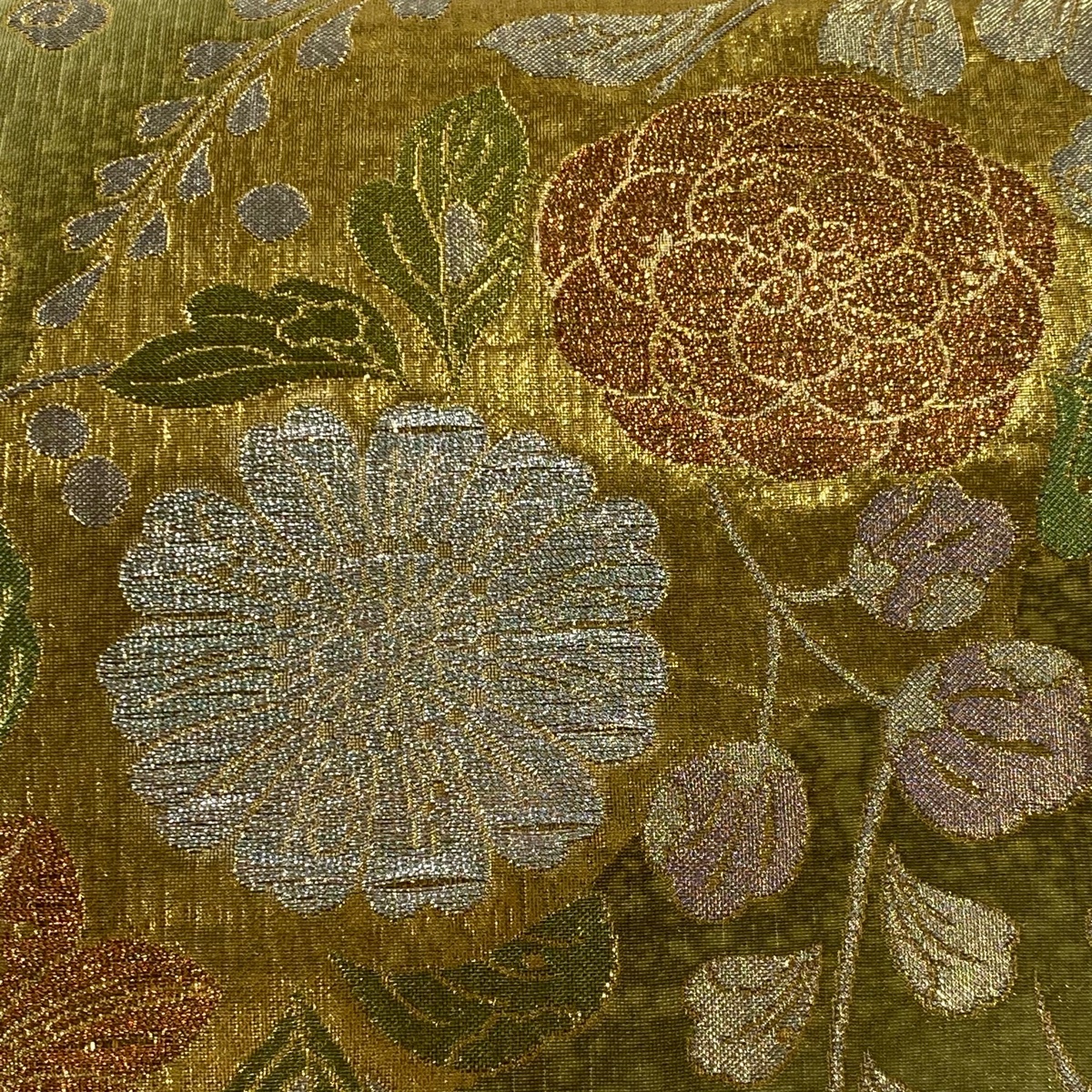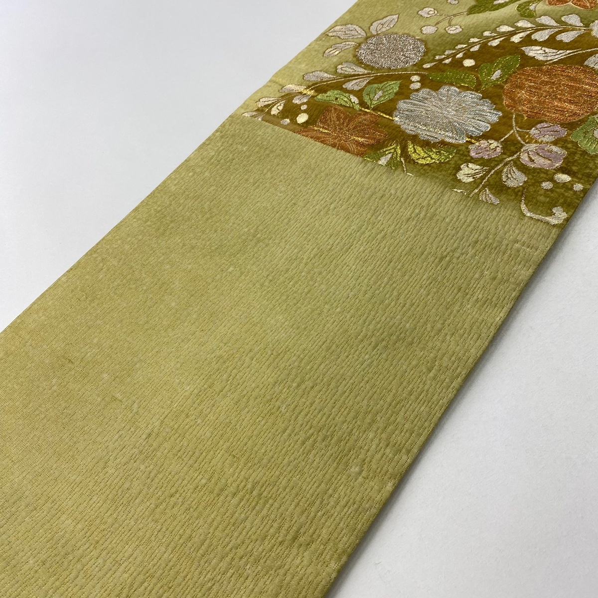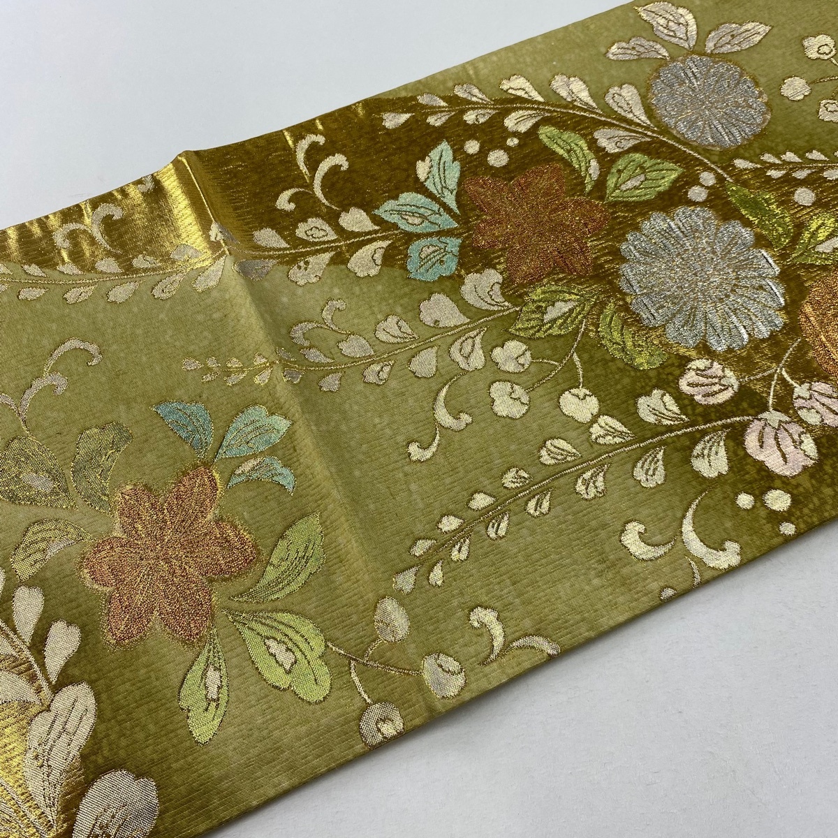 | 袋帯 美品 秀品 草花 花唐草 ラメ糸 箔 鶯色 六通 正絹 【中古】 |