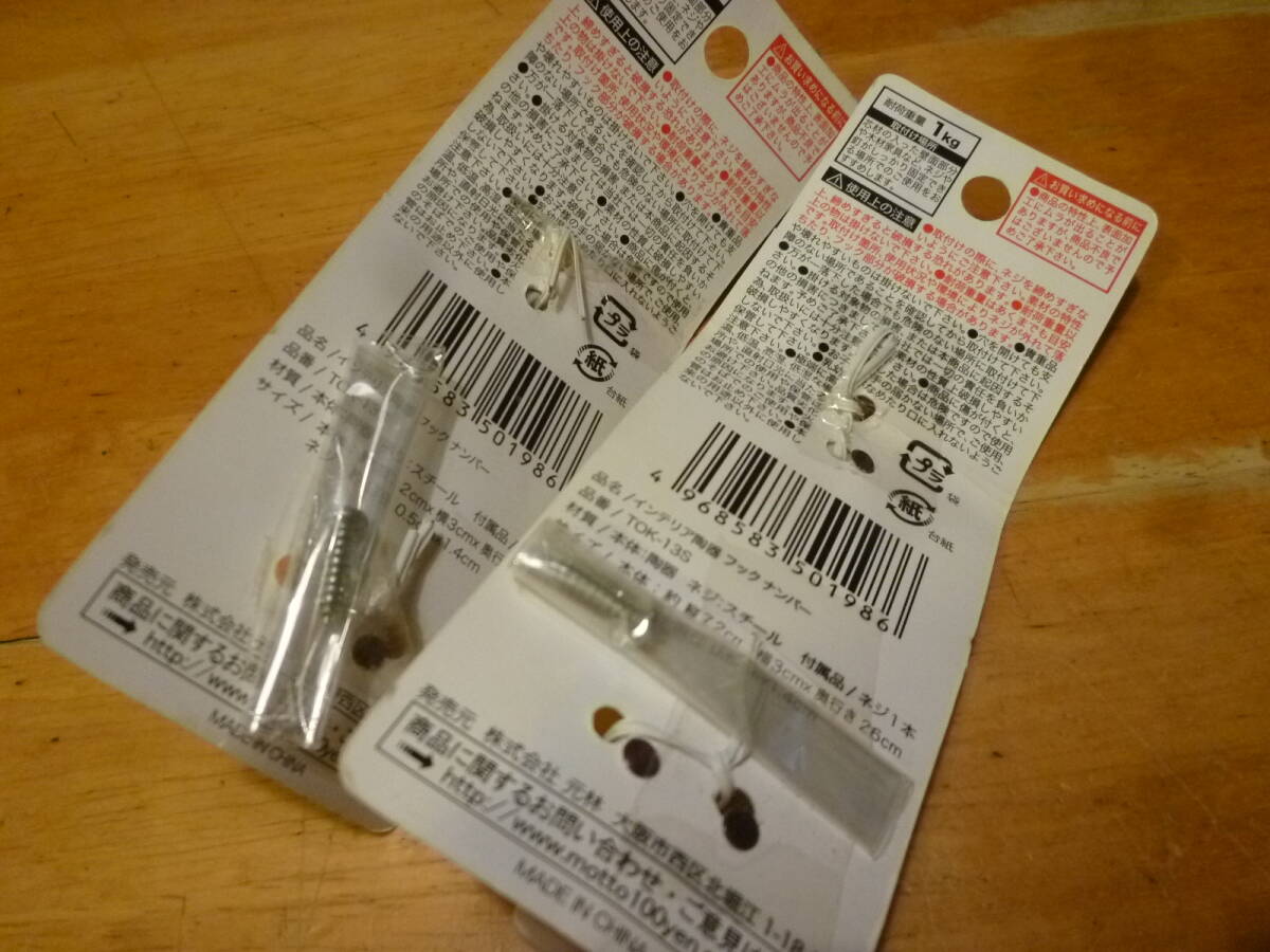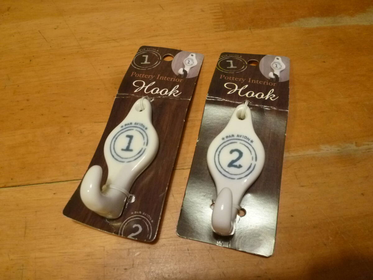 こちらはインテリア用品陶器製のフック№1と2の未使用品になります。耐荷重量1㎏とあり、スチール製の1・4cmのネジ1本付です。