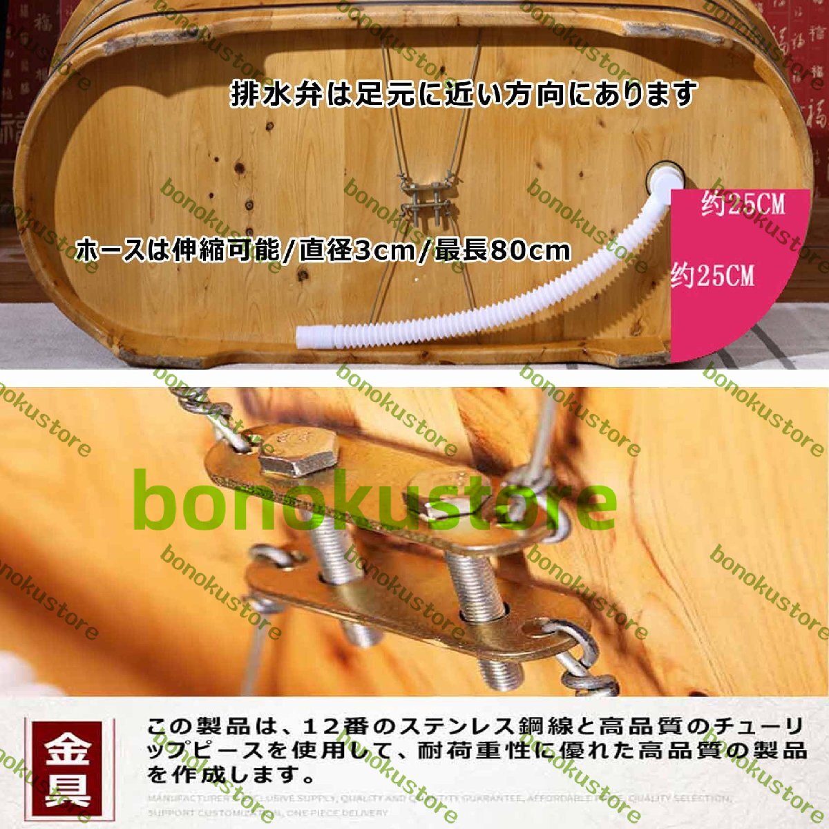 製品説明材質:健康的で環境に優しい天然木、耐久性のあるステンレス鋼のストリップで包まれ、より安定しています。サイズ:幅60cm*高さ73cm、長さ100/110/120/140cmバレル壁:約2.5cm排水バルブ: 回転して排水します生産工程:スプライシング工程【標準構成】木製ヘッドレスト、排水ホース、小さな四角いスツール、背もたれ、PU ヘッドレスト、硬質アームレスト、ハンギング バスケット + スコップ、フット洗面台【注意事項】:手作業で製造しているため、約1CMの小さな測定誤差が生じる場合がありますが、実際の製品が優先されます。1. 耐用年数を延ばすために、新しいバケツを水に 72 時間浸す必要があります 。通常の含水量に戻すので、頻繁に使用する必要があります。2. 長期間使用しない場合は、バレルが傷つきやすいため、バレルを浸して(水位は1?2 cmの高さ)、バレルの温度を保つためにバレルバッグで密封してください。乾燥や湿気が多すぎる場合は、木材が水分を吸収して老化を促進し、カビを発生させないように、入浴後の汚水を溜めないよう注意してください。3.水の浸出が異常な場合は、水を入れて72時間浸してバレルを完全に浸します.バレル内の水の浸出は止まります.他にご質問がある場合は、時間内にご連絡ください。4. 使用しないときは、樽内の湿度を保つため、樽内に3分の1~3分の2の水を溜め、冬場や一年中気温の低い場所では温風で空気を乾燥させてください。温風出口が樽に近い場合、または特に乾燥している場合は、適切な湿度を維持するために大きな湿ったタオルで覆うことができます。5. バレルの耐用年数の低下を避けるため、バレルを長時間日光にさらしたり、強風にさらしたりしないでください。
