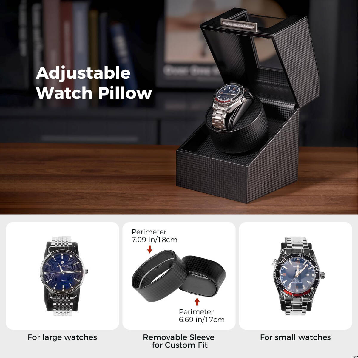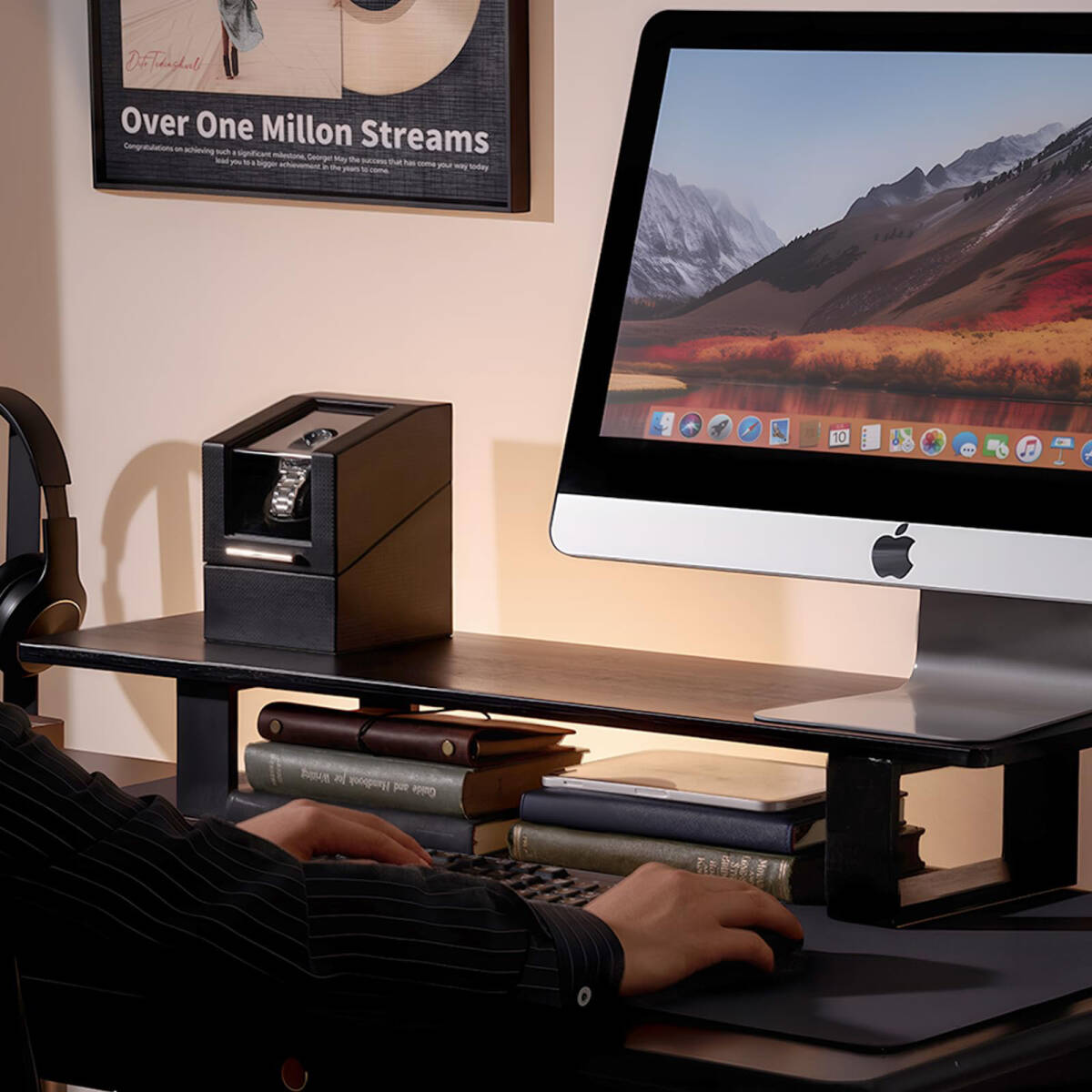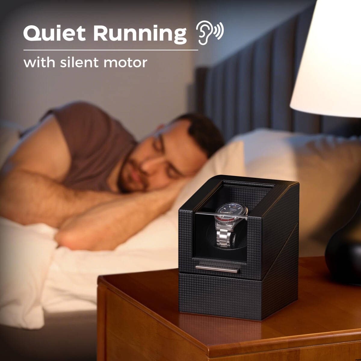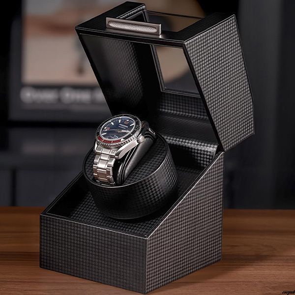 この自動巻き腕時計ワインダーは、静音モーターとフレキシブルピローを搭載し、時計をやさしくしっかり固定しながら自動で巻き上げます。