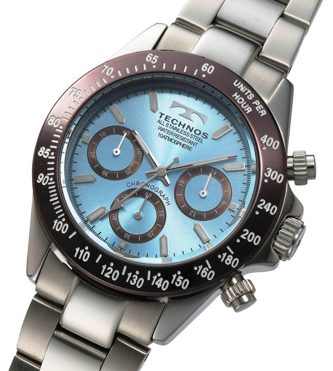 このモデルはスポーツタイプのデザインに美しいライトブルーの文字盤にブラウンのカラーを組み合わせ、とてもレアです。 60分計測可能なストップウォッチと24時間計を搭載し、簡易的に平均時速の算出が可能なタキメーターも装備。プレゼントやギフトにもおすすめです。