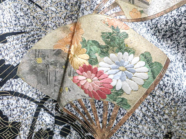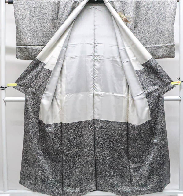 リサイクル商品のため、右後袖にしみがございます。 袖口汚れがございますが着用可能なお品です。 地色は黒・灰です。 1枚目の画像が近いお色かと思われます。 素材は正絹です。 |