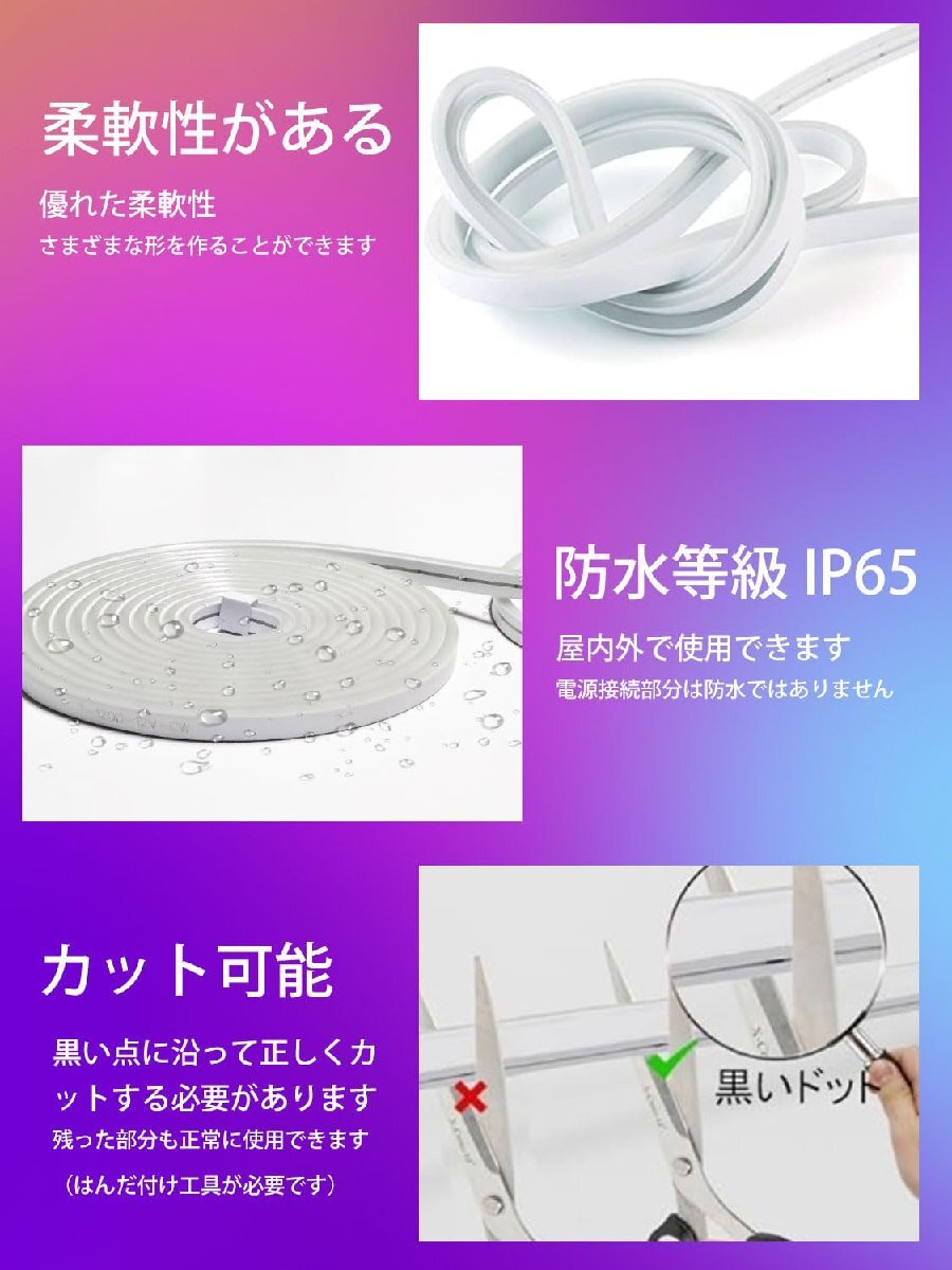 【取り付け便利・曲げ可能】取り付け手順:①両面テープを固定クリップに貼り付け、それからでledテープライトが固定する所に貼ります。②ネジを取り付けて締め、ネオン管を固定クリップに挿入します。LEDネオンライトの形を自由に調節できます。ledテープライト防水の側面には7cmごとに黒線があって、黒線に沿ってハサミで切断でき、取り付け所に合わせてお好みの長さにカットできます。ご注意:ライトストリップを切断するにははんだ付けツールが必要です。ネオンチューブ切断後の残りの部分は、コネクタなしでは(別途にご購入いただく必要がありますが、予めにご了承ください。)、再利用する可能がありません。