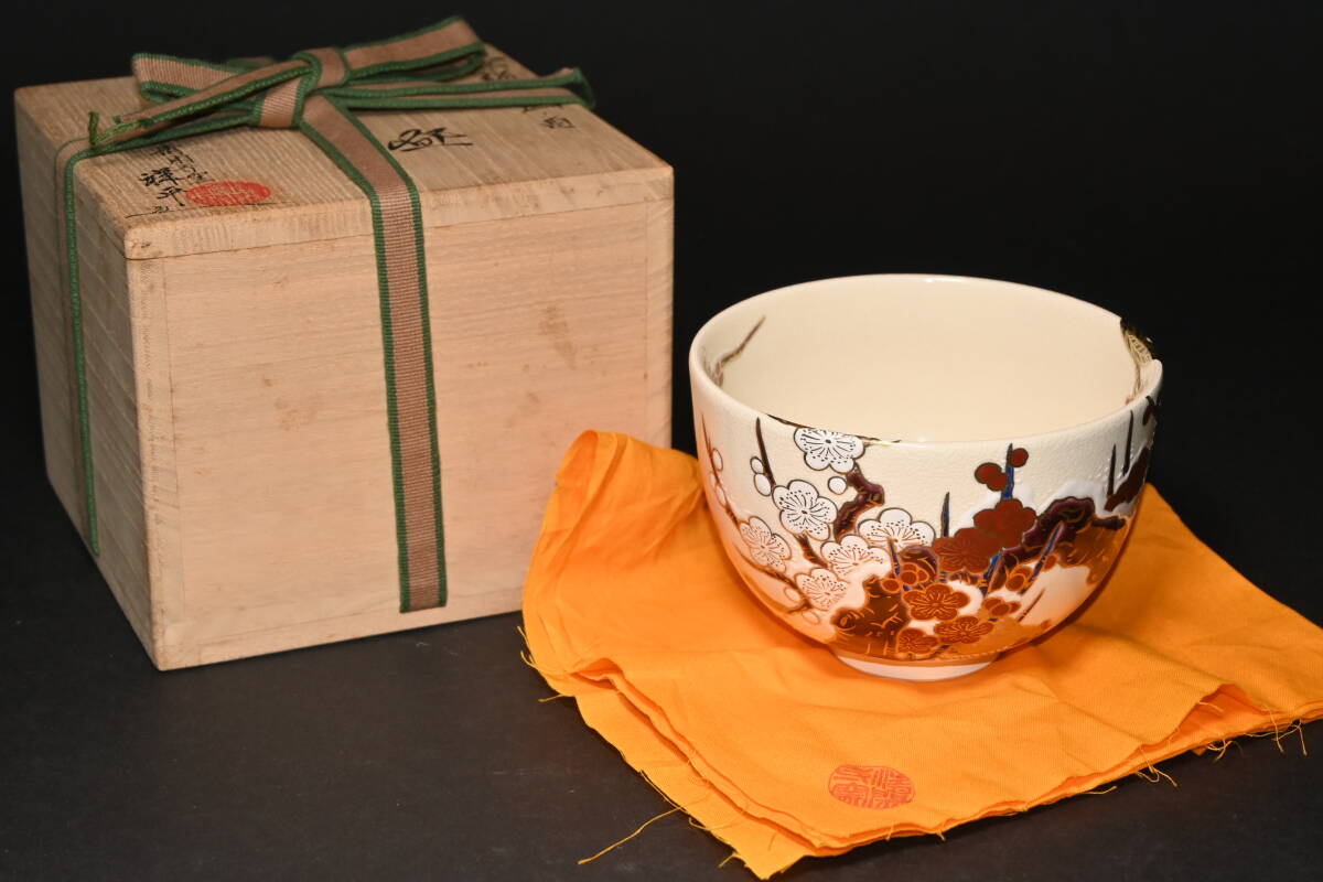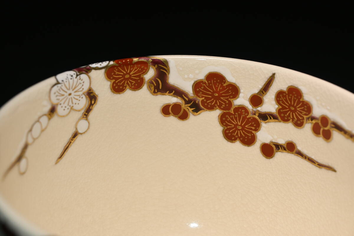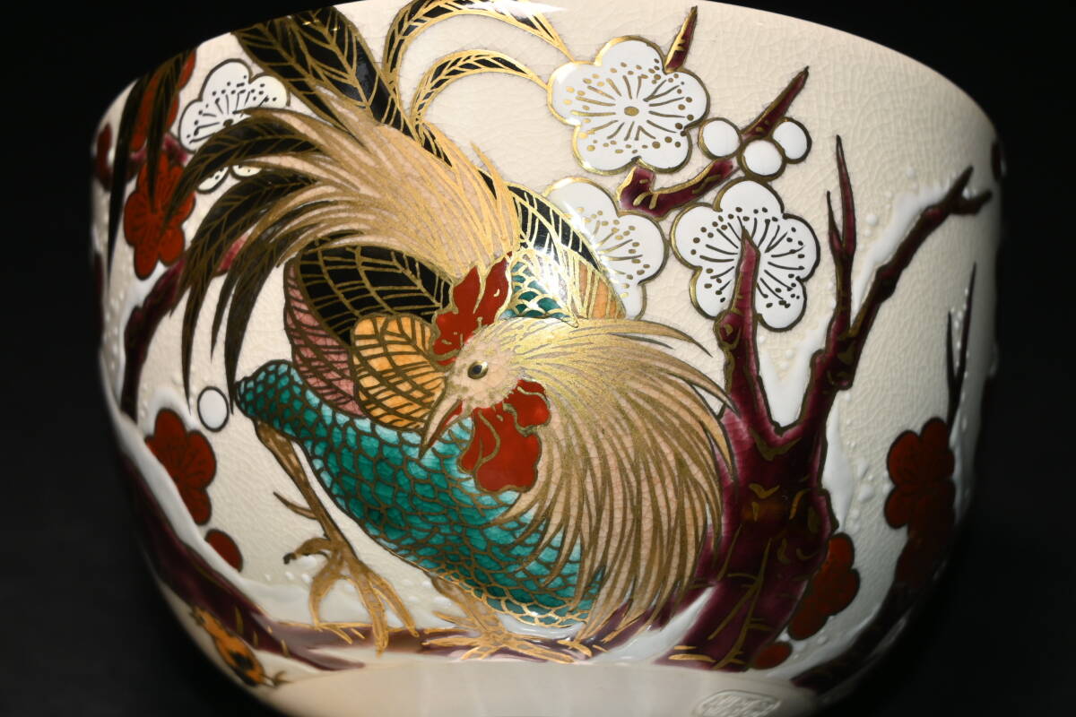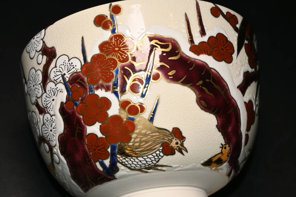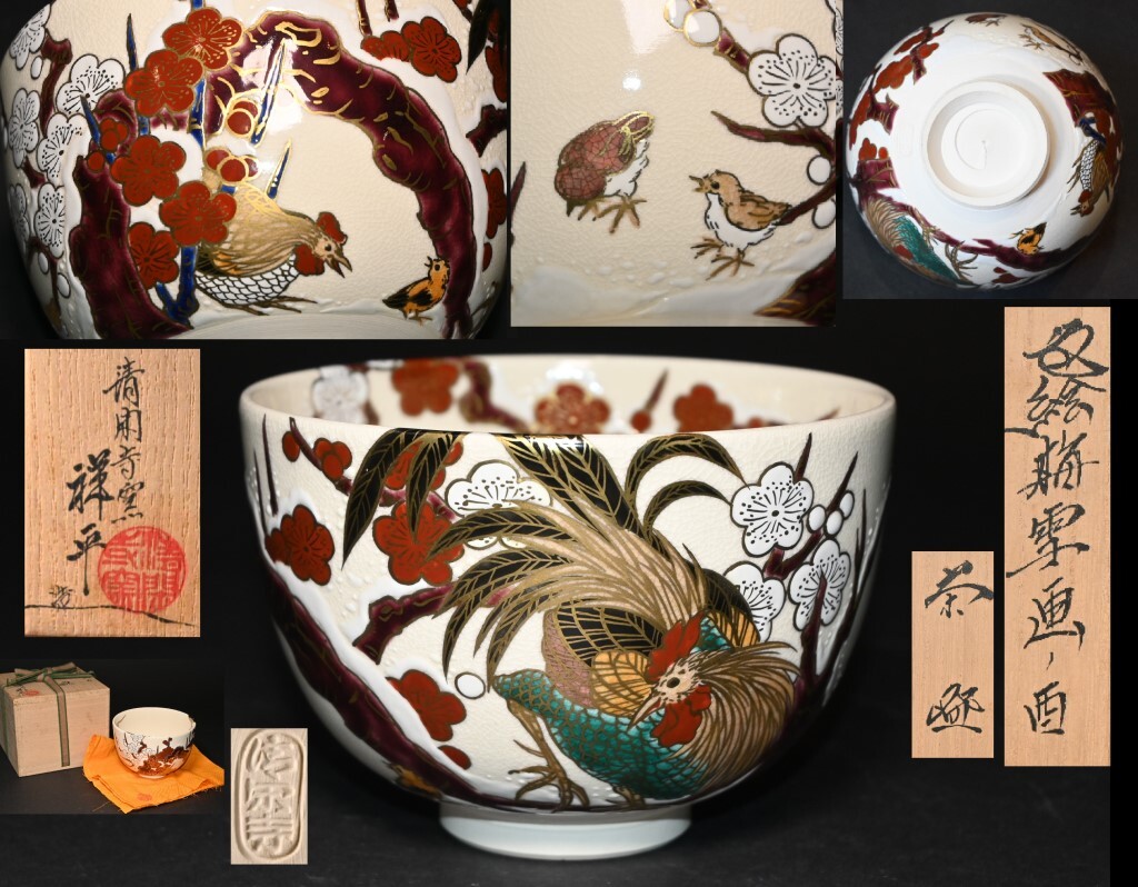 真贋保証■清閑寺窯 杉田祥平 造■ 色絵梅雪画ノ酉 茶碗 共箱・共布・栞付 金彩 梅花 雪景色 親子鶏 茶道具 抹茶茶碗 茶器 茶会 京焼 | |||||||||