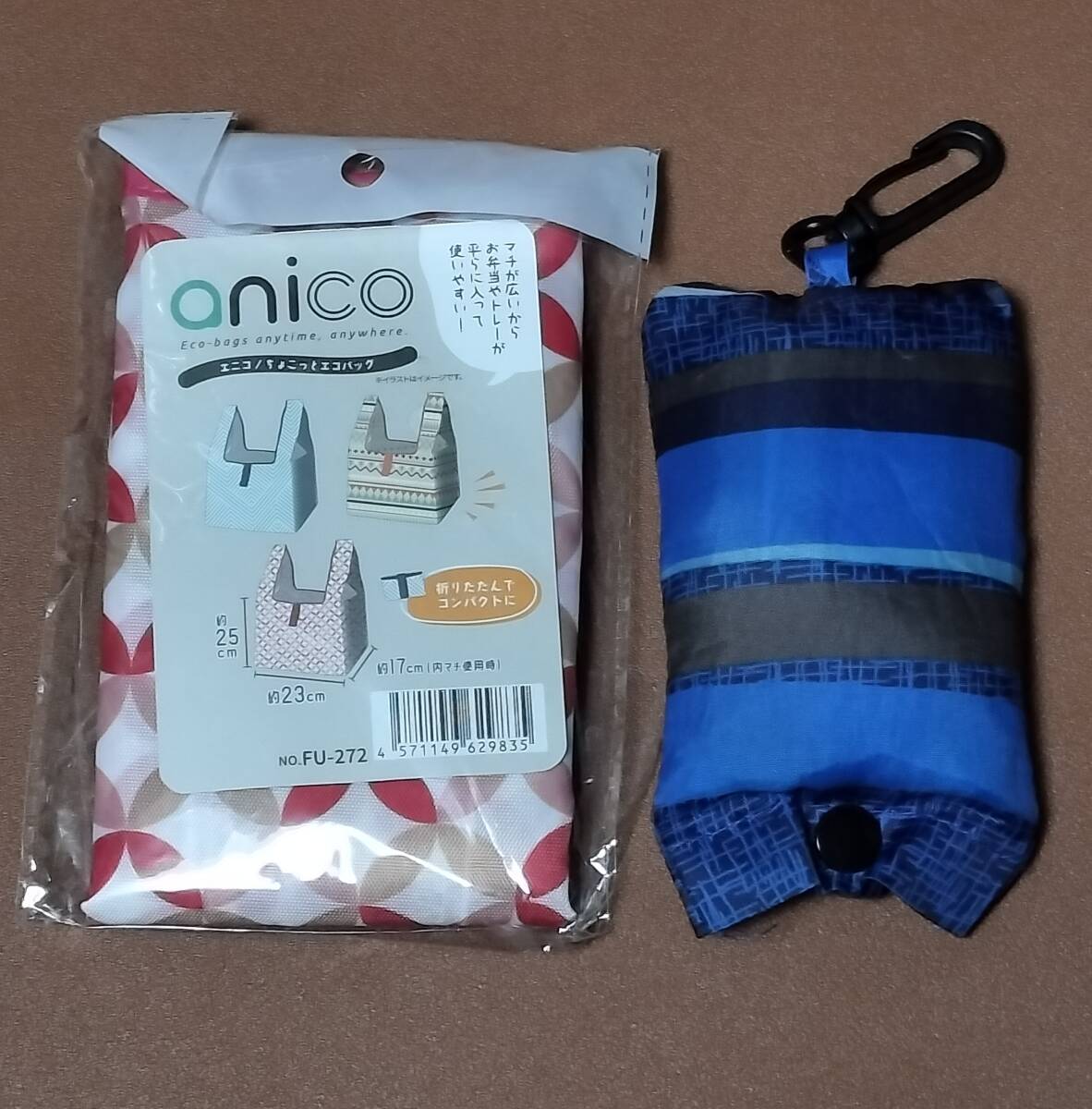 anicoのマチが大きなエコバッグとカラビナ付きの収納袋がついた、コンパクトでユニセックスカラーのエコバッグセットです。