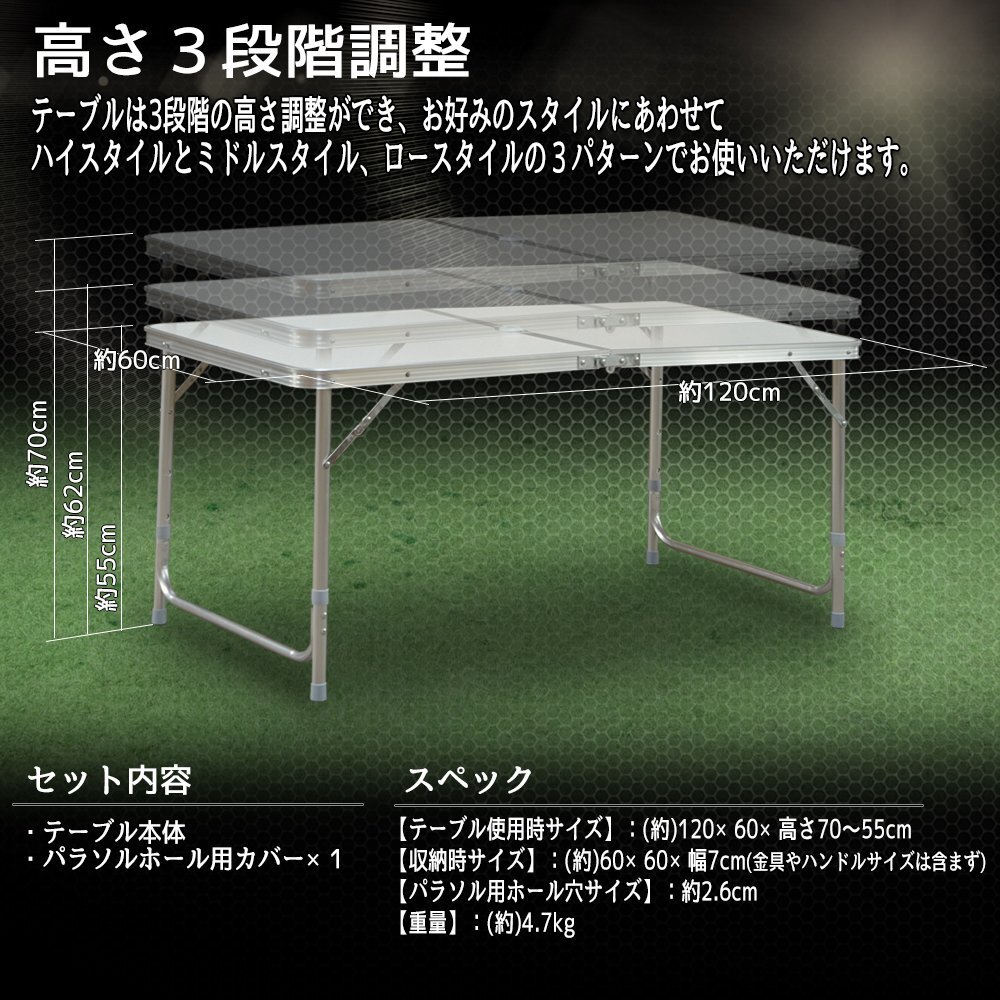 BBQやアウトドアに最適なコンパクトに折りたためるおしゃれなピクニックテーブル!! 車のトランクに入れる時や持ち運びの際にもとても便利な取っ手付きで持ち運びもラクラク!! サビに強いアルミを使用。 テーブルは3段階の高さ調節ができ、お好みのスタイルに合わせて 天板中心部にはパラソル用ホールがあるので、ベランダやテラスでの使用にもおススメです。 キャンプ、バーベキュー、お花見などにとても便利。 ■商品仕様■ |