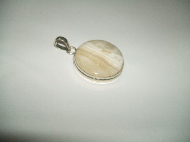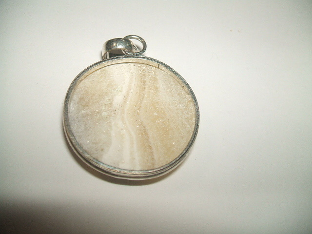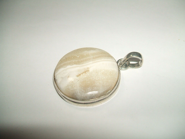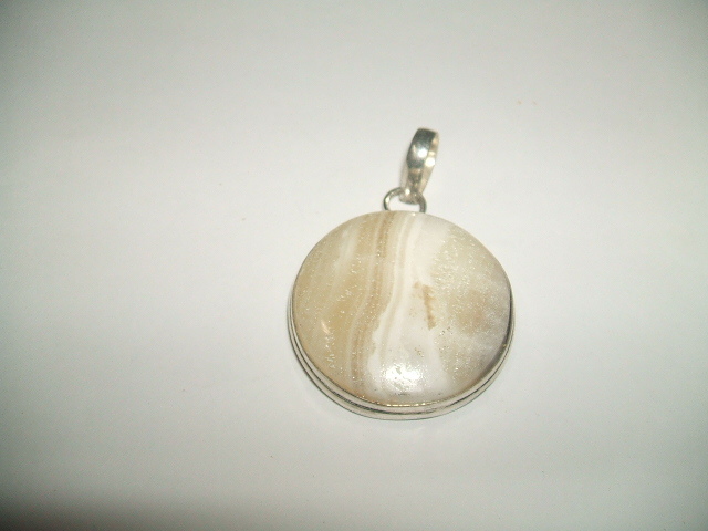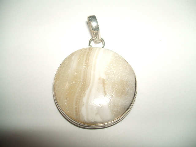 縞模様が美しいラグナレースメノウのトップです。石の大きさは直径2.8センチ。金属はシルバーで、925の刻印があります。
