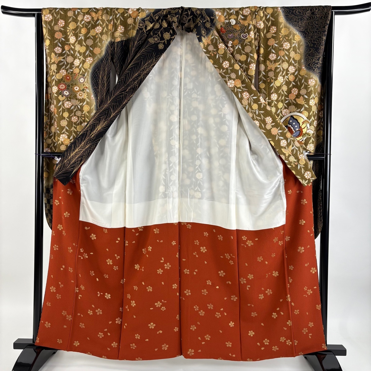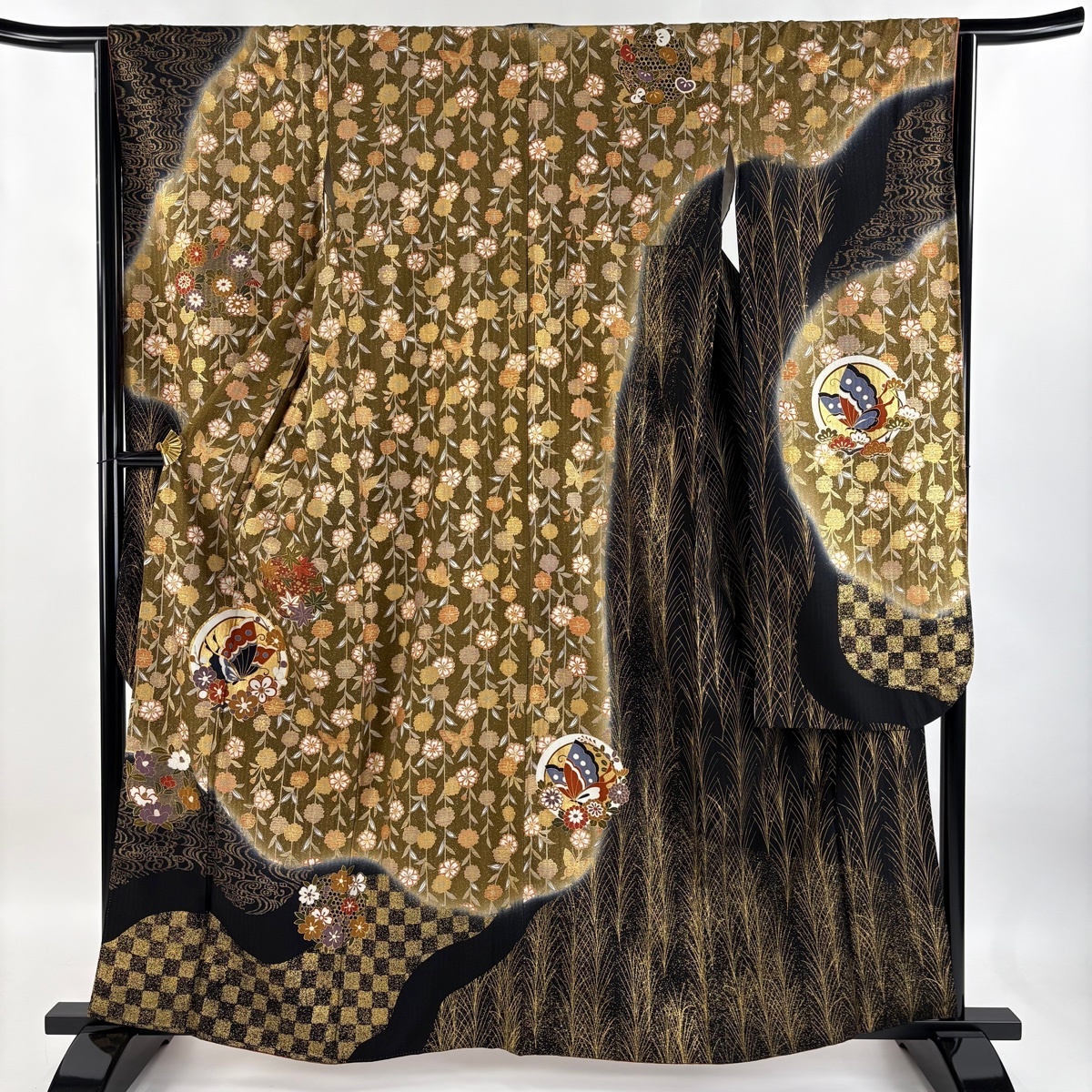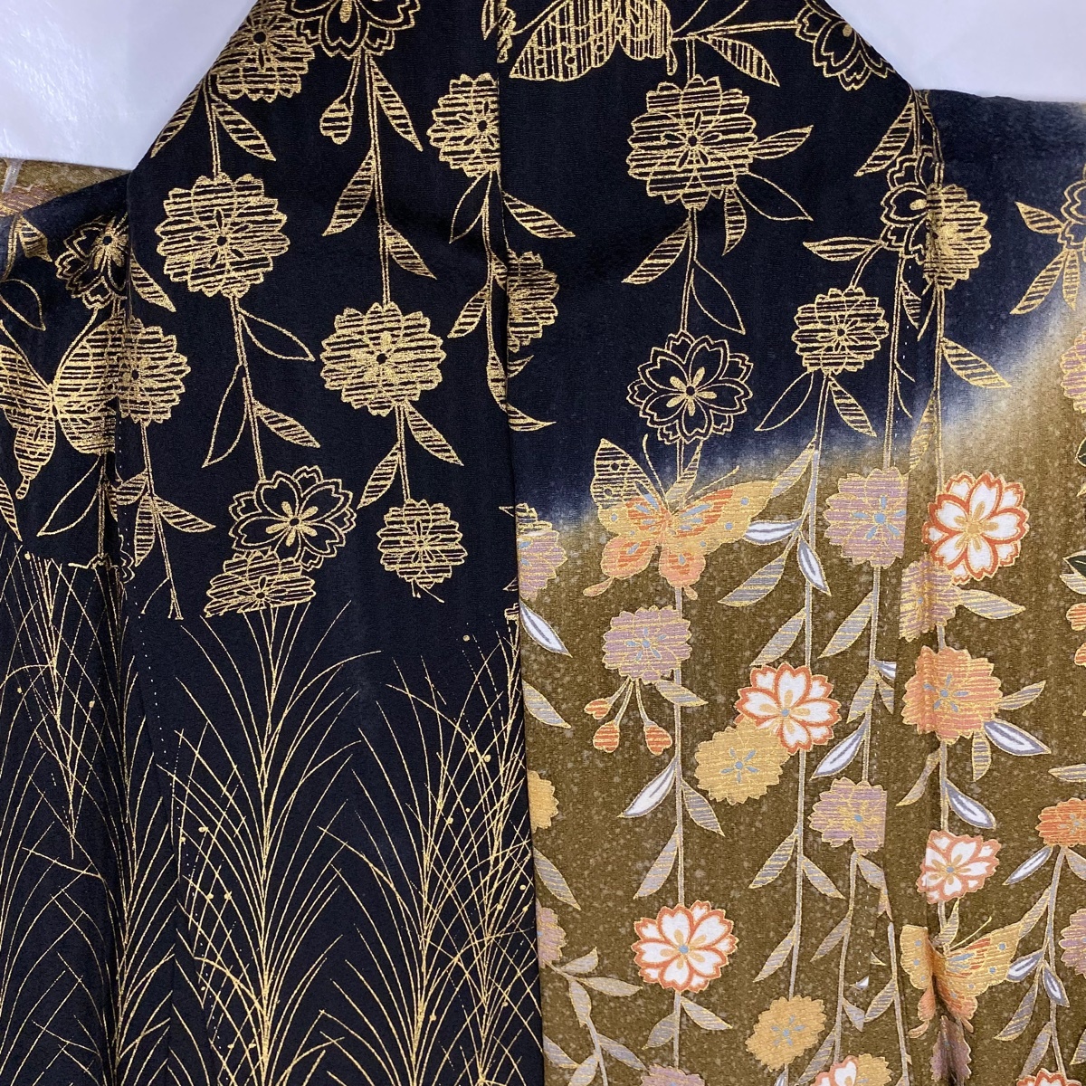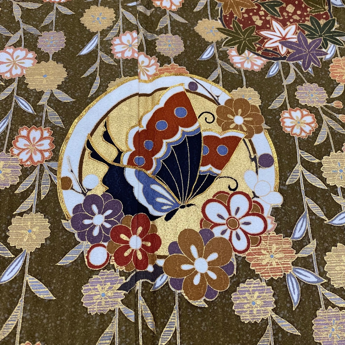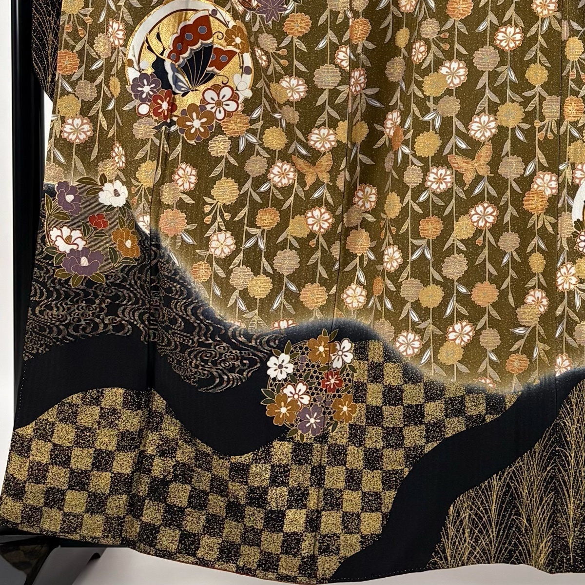 | 振袖 美品 秀品 蝶 枝垂れ桜 金糸 金彩 茶緑色 袷 身丈161.5 裄丈64.5 M 正絹 【中古】 |