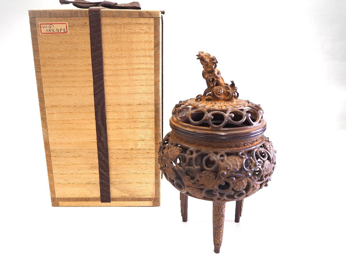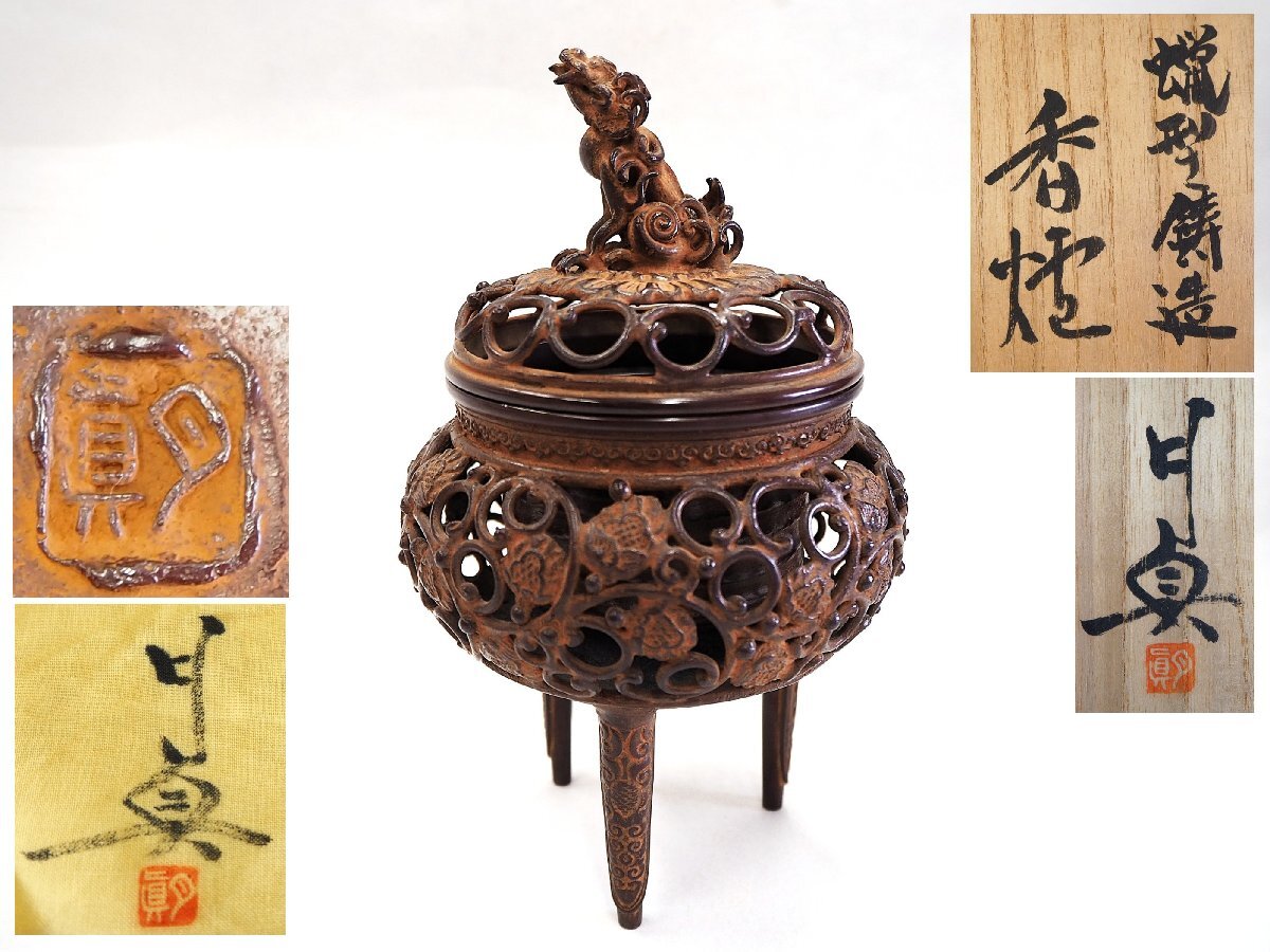 ★☆真作保証【 須賀月真作 蝋型鋳銅製 香炉 獅子蓋 唐草透かし 三つ足 共箱・共布 栞付 鋳造印有 】高岡銅器 師;須賀松園