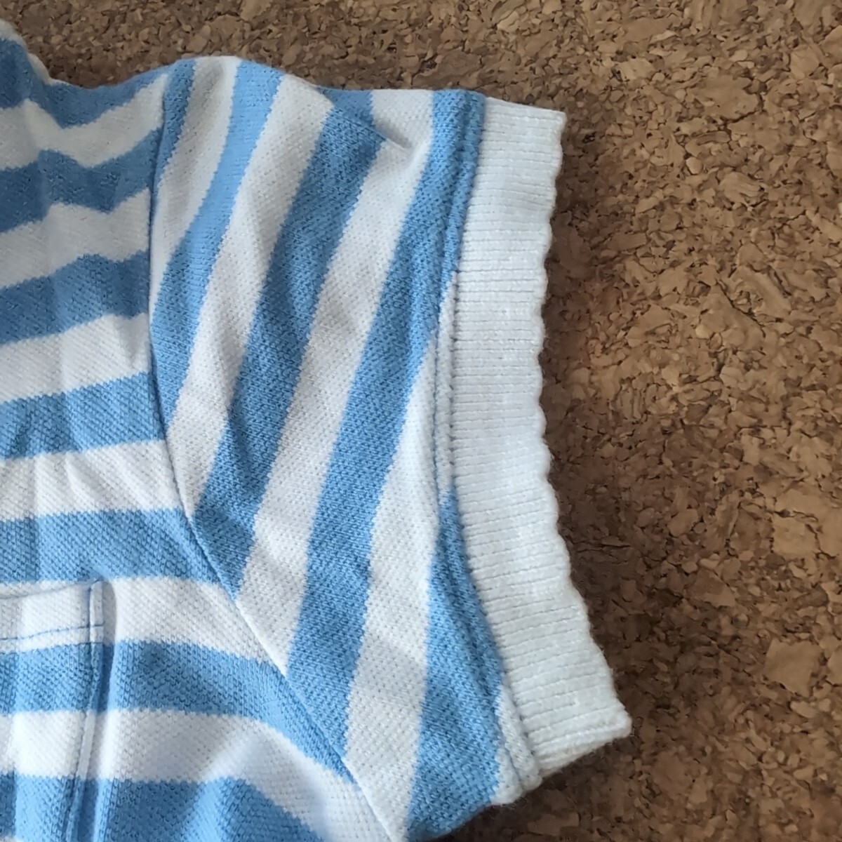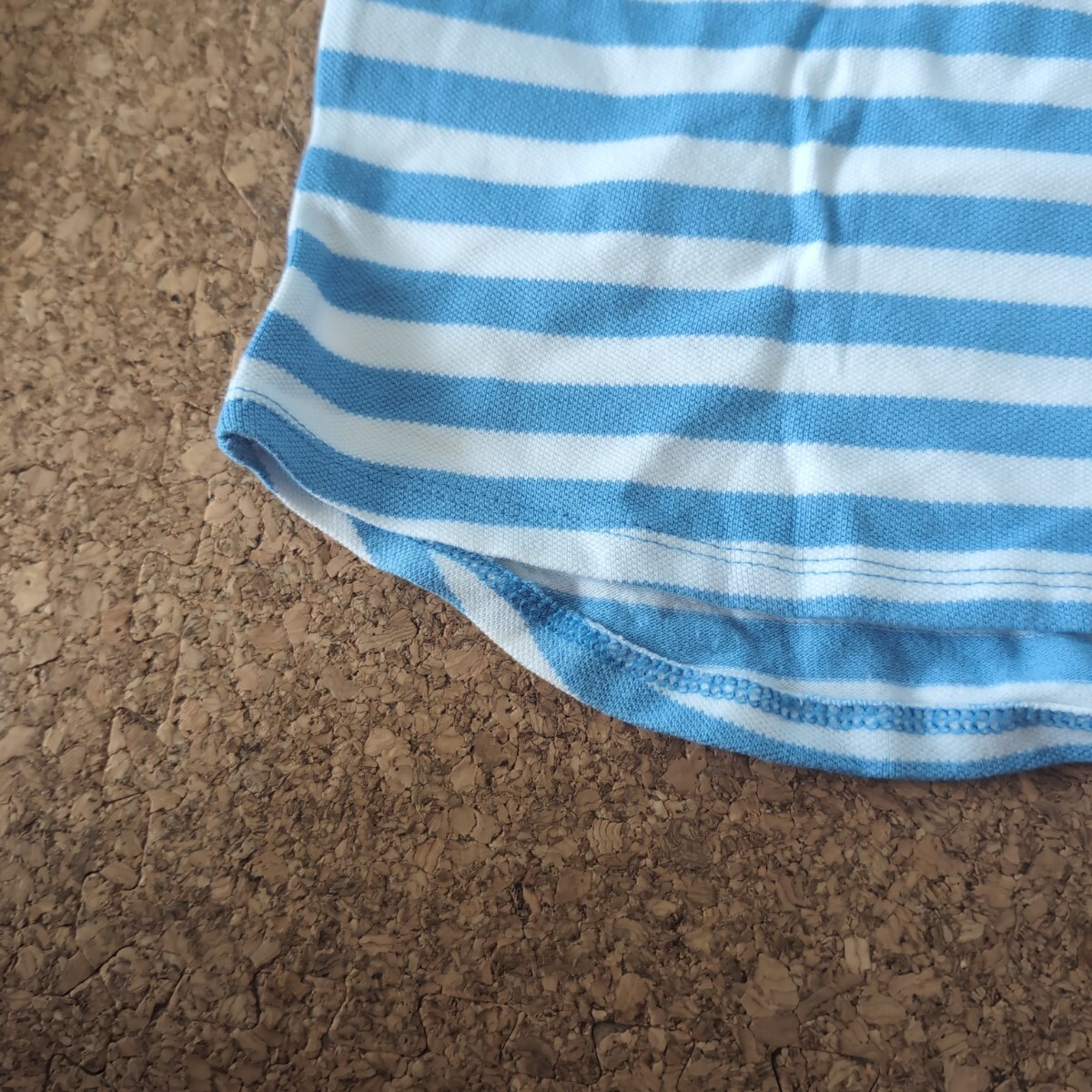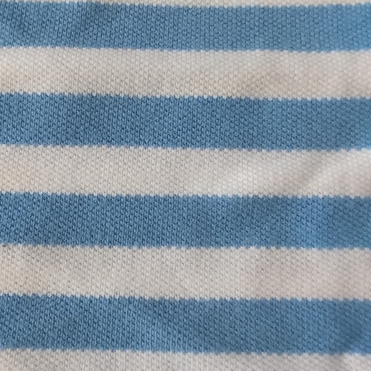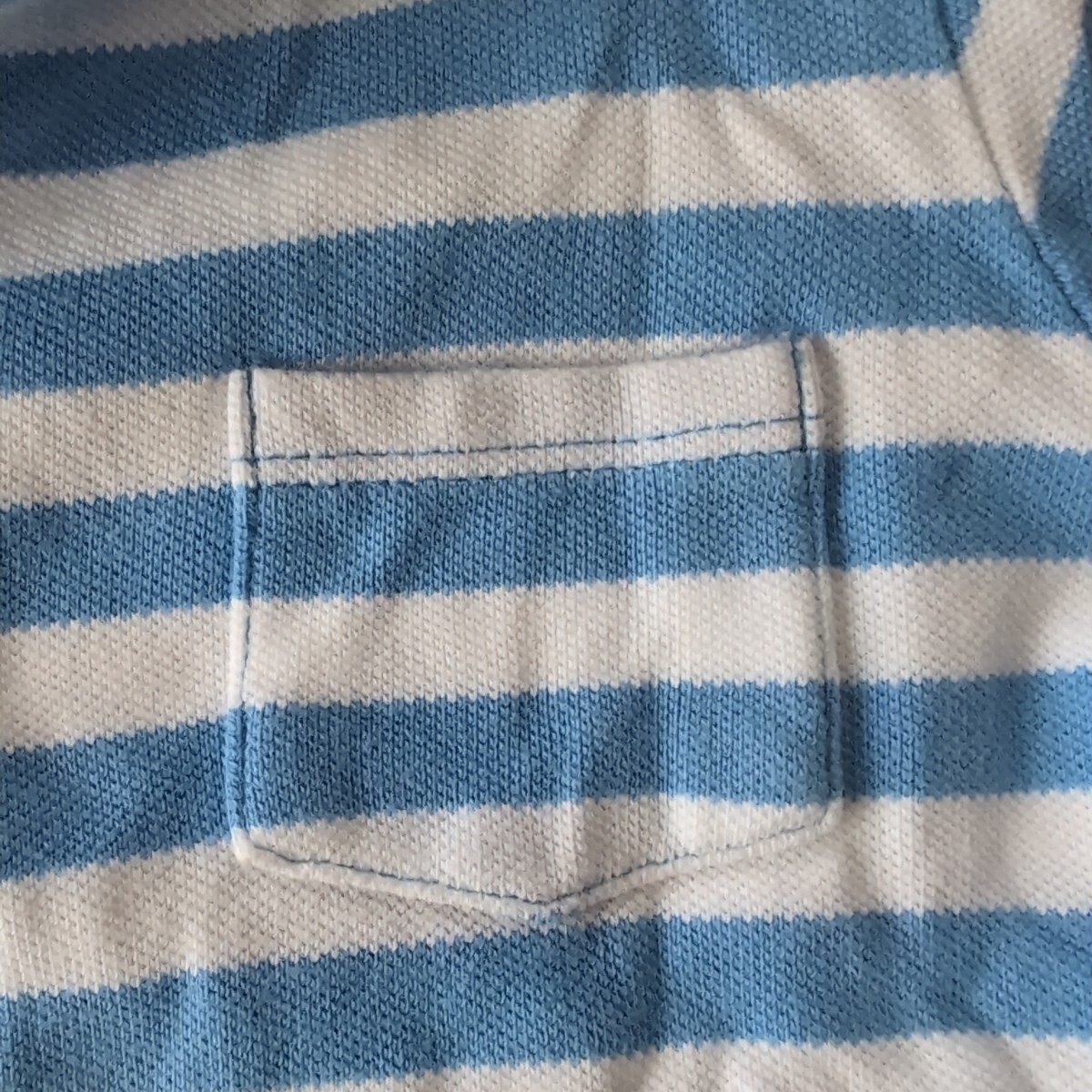ライトブルーとホワイトのボーダーデザインの半袖ポロシャツ、胸ポケット付き。