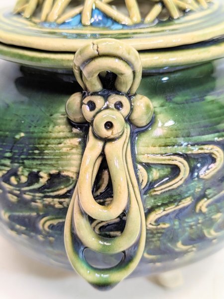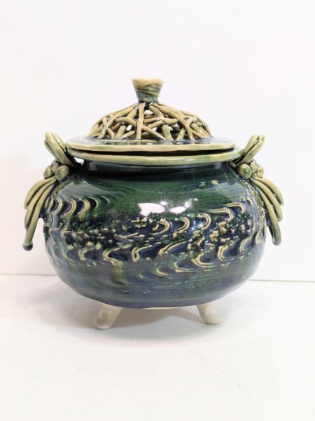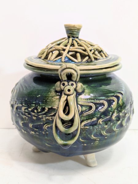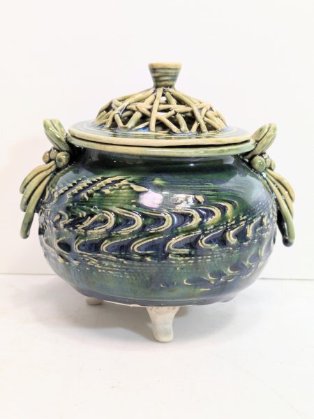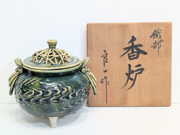 蔵出し! 未使用◆時代物◆【織部 香炉】在銘 良一作 三足 お香 お線香 練香 茶道具 茶器 茶入 中国美術 工芸品 伝統工芸 伝統文化 骨董 美濃地方 当時物 現状品 長期保管品 /1 ・蔵出し品!未使用の織部 香炉です。 ・在銘は「良一作」と見受けられます。 ・高さは約13cmです。 ・当方専門外でもあるため、詳細がわからない物が御座います。写真と説明文をよくご覧いただき、判断できる方のみご入札ください。 ・詳細は写真にてご確認お願いします。文章下にも追加写真がありますのでご確認ください。