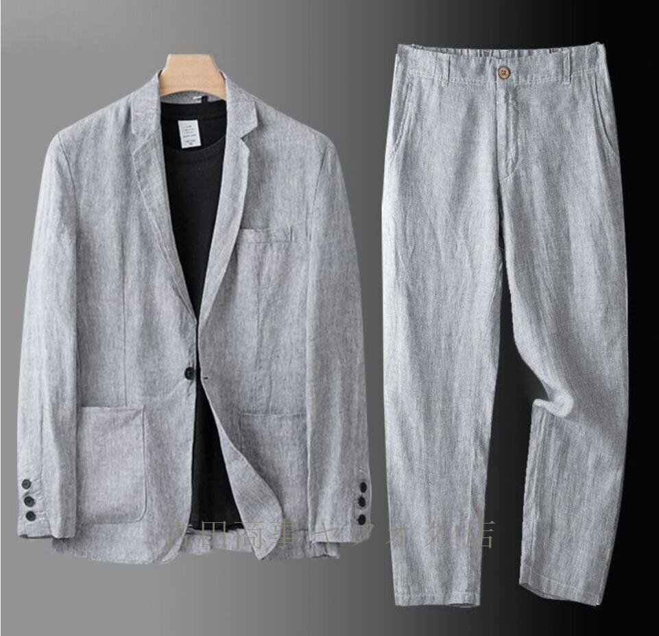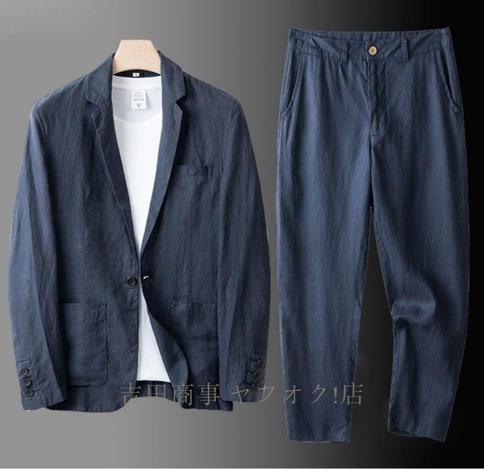 ☆新品 メンズ スーツセット セットアップ テーラードジャケット テーパードパンツ 上下2点セット 綿麻風 スラックス フォーマル 紺