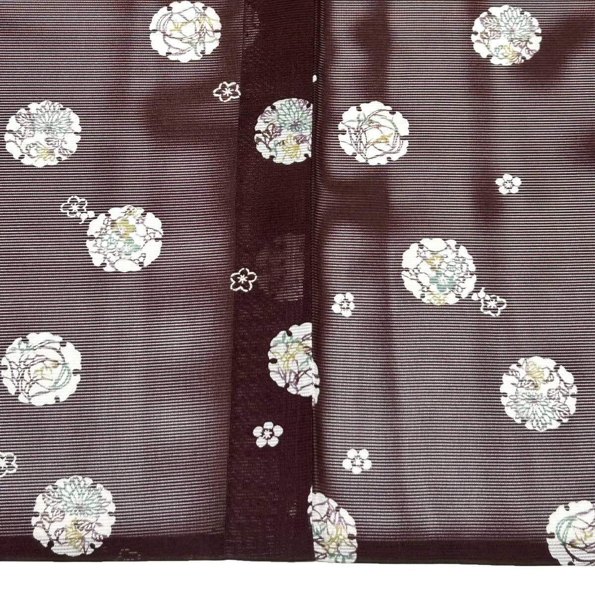 シックなブラウンの絽の地に、雪輪文・梅・菊などが描かれた、とても綺麗で涼し気なデザインの単衣のお着物です。どうぞこの機会にご検討下さい!