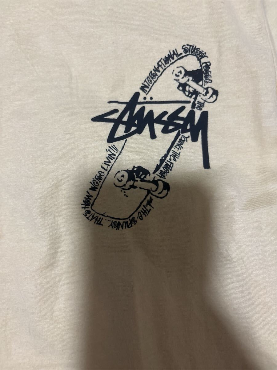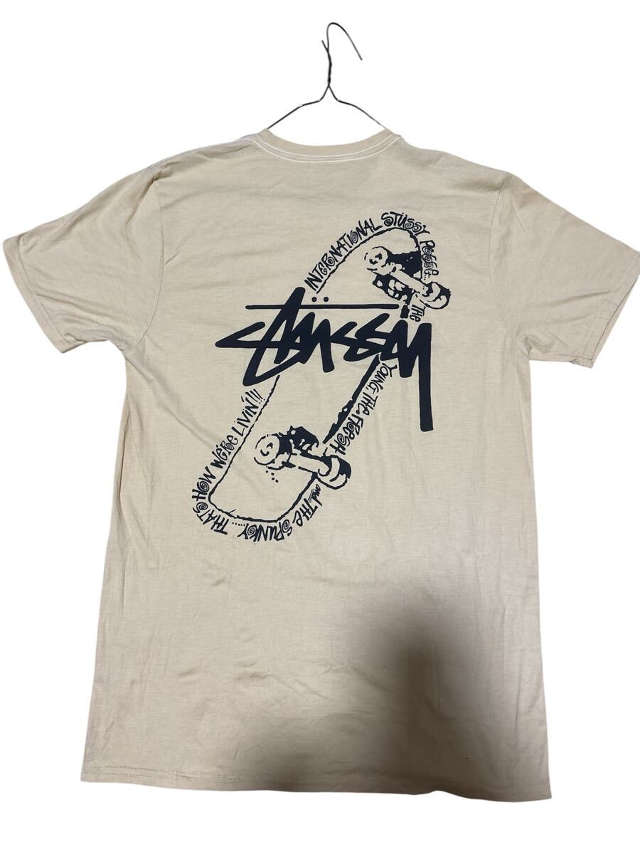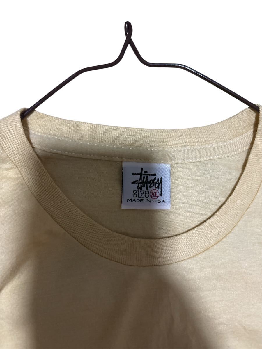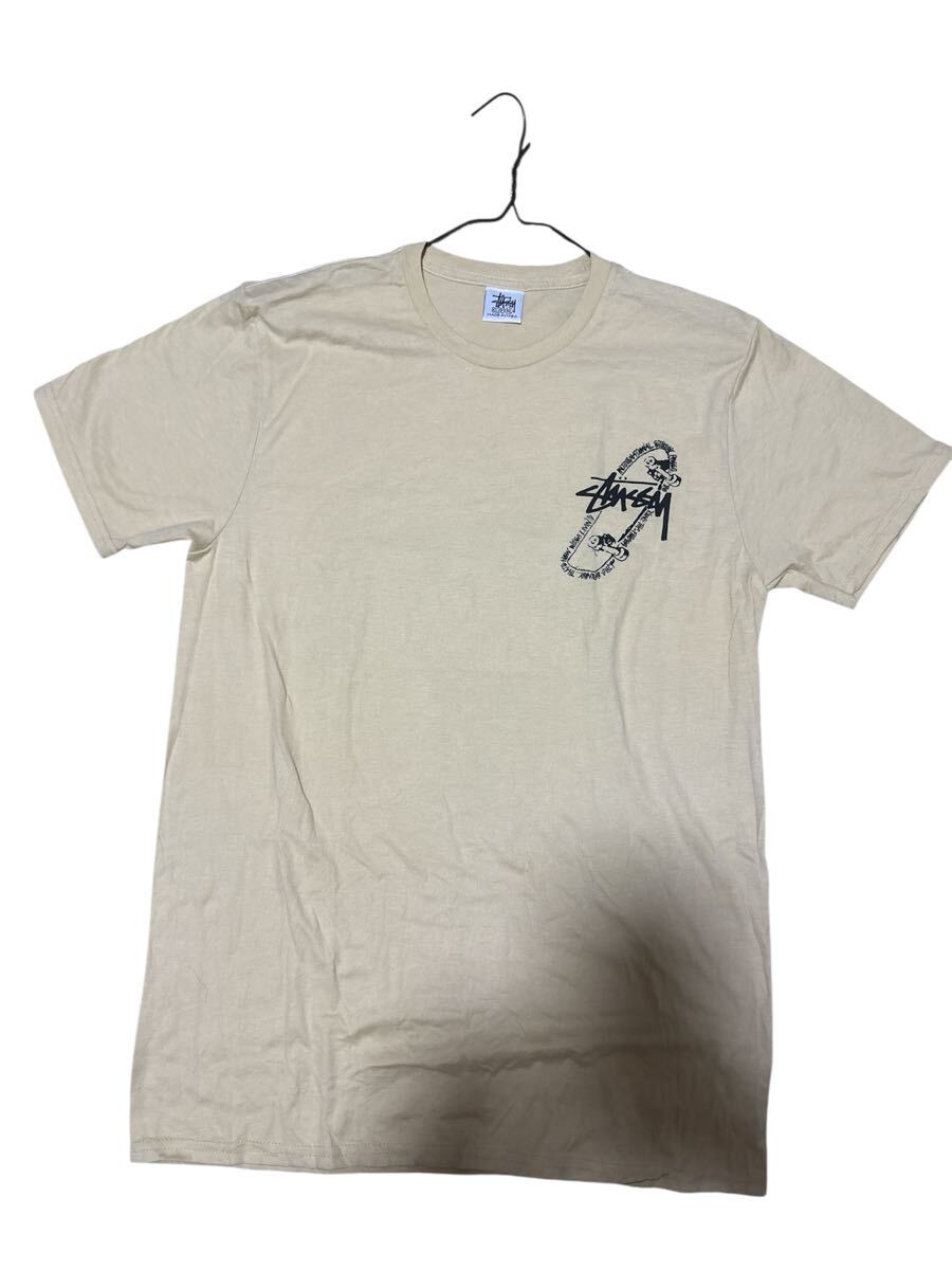 ステューシーの90年代ヴィンテージTシャツです。希少なUSA製・白タグ、フロントとバックにスケートボードグラフィックがプリントされた人気デザイン。シンプルながら存在感のある一枚です。